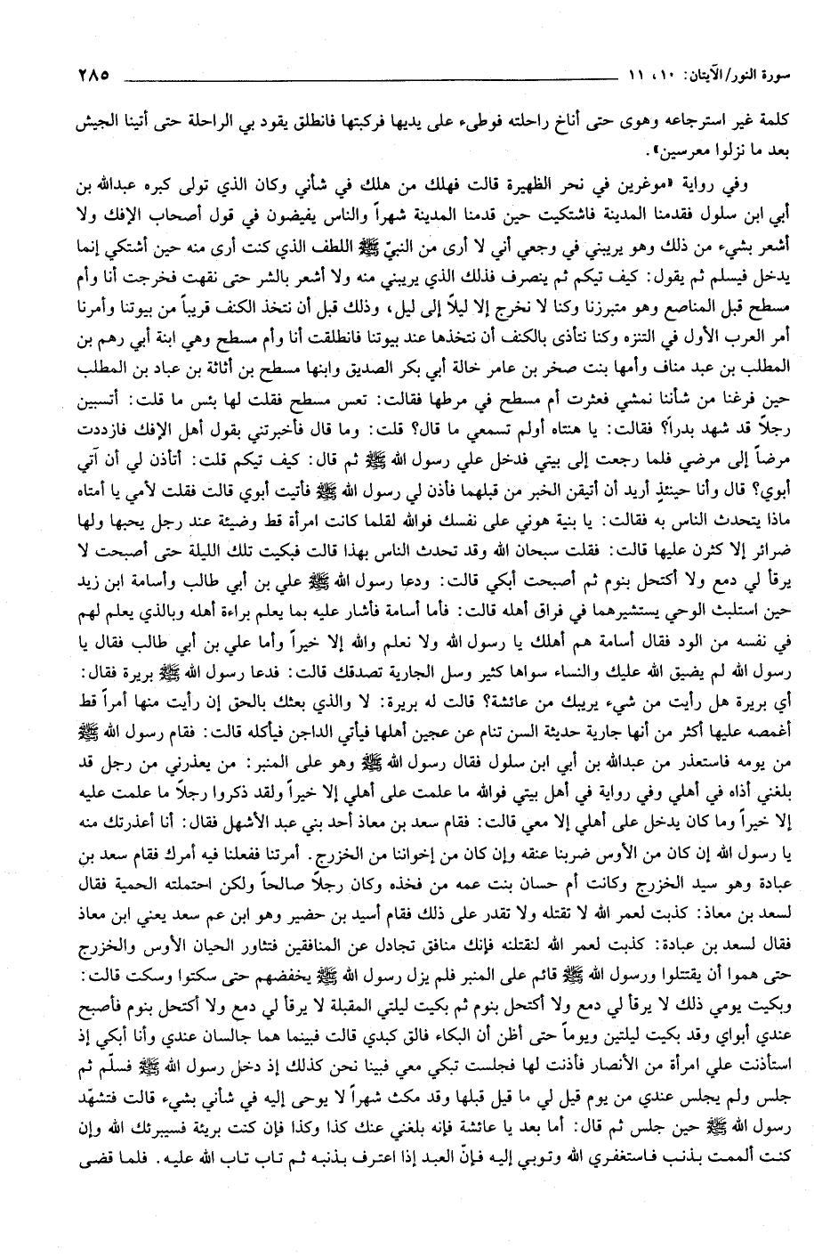 وفي رواية «موغرين في نحر الظهيرة قالت فهلك من هلك في شأني وكان الذي تولى كبره عبد الله بن أبي ابن سلول فقدمنا المدينة فاشتكيت حين قدمنا المدينة شهرا والناس يفيضون في قول أصحاب الإفك ولا أشعر بشيء من ذلك وهو يريبني في وجعي أني لا أرى من النبيّ صلّى الله عليه وسلّم اللطف الذي كنت أرى منه حين أشتكي إنما يدخل فيسلم ثم يقول: كيف تيكم ثم ينصرف فذلك الذي يريبني منه ولا أشعر بالشر حتى نقهت فخرجت أنا وأم مسطح قبل المناصع وهو متبرزنا وكنا لا نخرج إلا ليلا إلى ليل، وذلك قبل أن نتخذ الكنف قريبا من بيوتنا وأمرنا أمر العرب الأول في التنزه وكنا نتأذى بالكنف أن نتخذها عند بيوتنا فانطلقت أنا وأم مسطح وهي ابنة أبي رهم بن المطلب بن عبد مناف وأمها بنت صخر بن عامر خالة أبي بكر الصديق وابنها مسطح بن أثاثة بن عباد بن المطلب حين فرغنا من شأننا نمشي فعثرت أم مسطح في مرطها فقالت: تعس مسطح فقلت لها بئس ما قلت: أتسبين رجلا قد شهد بدرا؟ فقالت: يا هنتاه أو لم تسمعي ما قال؟ قلت: وما قال فأخبرتني بقول أهل الإفك فازددت مرضا إلى مرضي فلما رجعت إلى بيتي فدخل علي رسول الله صلّى الله عليه وسلّم ثم قال: كيف تيكم قلت: أتأذن لي أن آتي أبوي؟ قال وأنا حينئذ أريد أن أتيقن الخبر من قبلهما فأذن لي رسول الله صلّى الله عليه وسلّم فأتيت أبوي قالت فقلت لأمي يا أمتاه ماذا يتحدث الناس به فقالت: يا بنية هوني على نفسك فو الله لقلما كانت امرأة قط وضيئة عند رجل يحبها ولها ضرائر إلا كثرن عليها قالت: فقلت سبحان الله وقد تحدث الناس بهذا قالت فبكيت تلك الليلة حتى أصبحت لا يرقأ لي دمع ولا أكتحل بنوم ثم أصبحت أبكي قالت: ودعا رسول الله صلّى الله عليه وسلّم علي بن أبي طالب وأسامة ابن زيد حين استلبث الوحي يستشيرهما في فراق أهله قالت: فأما أسامة فأشار عليه بما يعلم براءة أهله وبالذي يعلم لهم في نفسه من الود فقال أسامة هم أهلك يا رسول الله ولا نعلم والله إلا خيرا وأما علي بن أبي طالب فقال يا رسول الله لم يضيق الله عليك والنساء سواها كثير وسل الجارية تصدقك قالت: فدعا رسول الله صلّى الله عليه وسلّم بريرة فقال: