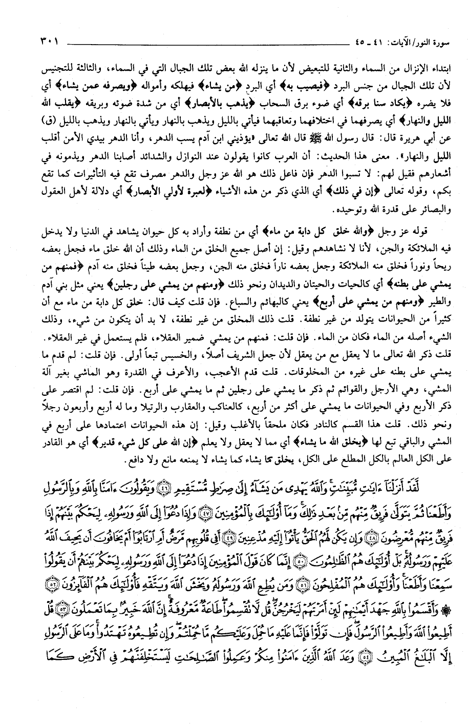 ابتداء الإنزال من السماء والثانية للتبعيض لأن ما ينزله الله بعض تلك الجبال التي في السماء، والثالثة للتجنيس لأن تلك الجبال من جنس البرد فَيُصِيبُ بِهِ أي البرد مَنْ يَشاءُ فيهلكه وأمواله وَيَصْرِفُهُ عَنْ مَنْ يَشاءُ أي فلا يضره يَكادُ سَنا بَرْقِهِ أي ضوء برق السحاب يَذْهَبُ بِالْأَبْصارِ أي من شدة ضوئه وبريقه يُقَلِّبُ اللَّهُ اللَّيْلَ وَالنَّهارَ أي يصرفهما في اختلافهما وتعاقبهما فيأتي بالليل ويذهب بالنهار ويأتي بالنهار ويذهب بالليل (ق) عن أبي هريرة قال: قال رسول الله صلّى الله عليه وسلّم قال الله تعالى «يؤذيني ابن آدم يسب الدهر، وأنا الدهر بيدي الأمن أقلب الليل والنهار». معنى هذا الحديث: أن العرب كانوا يقولون عند النوازل والشدائد أصابنا الدهر ويذمونه في أشعارهم فقيل لهم: لا تسبوا الدهر فإن فاعل ذلك هو الله عز وجل والدهر مصرف تقع فيه التأثيرات كما تقع بكم، وقوله تعالى إِنَّ فِي ذلِكَ أي الذي ذكر من هذه الأشياء لَعِبْرَةً لِأُولِي الْأَبْصارِ أي دلالة لأهل العقول والبصائر على قدرة الله وتوحيده.