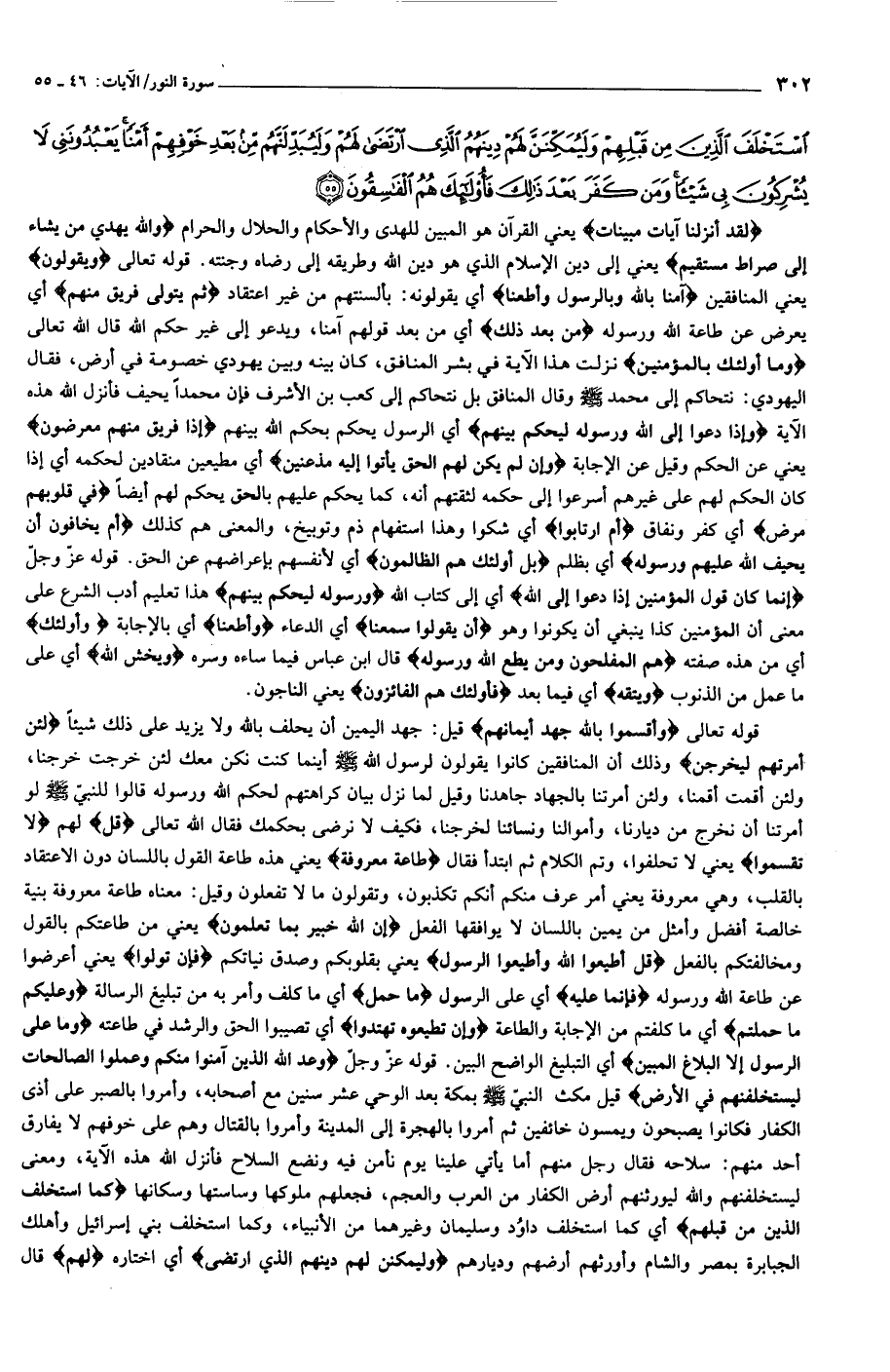 لَقَدْ أَنْزَلْنا آياتٍ مُبَيِّناتٍ يعني القرآن هو المبين للهدى والأحكام والحلال والحرام وَاللَّهُ يَهْدِي مَنْ يَشاءُ إِلى صِراطٍ مُسْتَقِيمٍ يعني إلى دين الإسلام الذي هو دين الله وطريقه إلى رضاه وجنته. قوله تعالى وَيَقُولُونَ يعني المنافقين آمَنَّا بِاللَّهِ وَبِالرَّسُولِ وَأَطَعْنا أي يقولونه: بألسنتهم من غير اعتقاد ثُمَّ يَتَوَلَّى فَرِيقٌ مِنْهُمْ أي يعرض عن طاعة الله ورسوله مِنْ بَعْدِ ذلِكَ أي من بعد قولهم آمنا، ويدعو إلى غير حكم الله قال الله تعالى وَما أُولئِكَ بِالْمُؤْمِنِينَ نزلت هذا الآية في بشر المنافق، كان بينه وبين يهودي خصومة في أرض، فقال اليهودي: نتحاكم إلى محمد صلّى الله عليه وسلّم وقال المنافق بل نتحاكم إلى كعب بن الأشرف فإن محمدا يحيف فأنزل الله هذه الآية وَإِذا دُعُوا إِلَى اللَّهِ وَرَسُولِهِ لِيَحْكُمَ بَيْنَهُمْ أي الرسول يحكم بحكم الله بينهم إِذا فَرِيقٌ مِنْهُمْ مُعْرِضُونَ يعني عن الحكم وقيل عن الإجابة وَإِنْ يَكُنْ لَهُمُ الْحَقُّ يَأْتُوا إِلَيْهِ مُذْعِنِينَ أي مطيعين منقادين لحكمه أي إذا كان الحكم لهم على غيرهم أسرعوا إلى حكمه لثقتهم أنه، كما يحكم عليهم بالحق يحكم لهم أيضا فِي قُلُوبِهِمْ مَرَضٌ أي كفر ونفاق أَمِ ارْتابُوا أي شكوا وهذا استفهام ذم وتوبيخ، والمعنى هم كذلك أَمْ يَخافُونَ أَنْ يَحِيفَ اللَّهُ عَلَيْهِمْ وَرَسُولُهُ أي بظلم بَلْ أُولئِكَ هُمُ الظَّالِمُونَ أي لأنفسهم بإعراضهم عن الحق. قوله عزّ وجلّ إِنَّما كانَ قَوْلَ الْمُؤْمِنِينَ إِذا دُعُوا إِلَى اللَّهِ أي إلى كتاب الله وَرَسُولِهِ لِيَحْكُمَ بَيْنَهُمْ هذا تعليم أدب الشرع على معنى أن المؤمنين كذا ينبغي أن يكونوا وهو أَنْ يَقُولُوا سَمِعْنا أي الدعاء وَأَطَعْنا أي بالإجابة وَأُولئِكَ أي من هذه صفته هُمُ الْمُفْلِحُونَ وَمَنْ يُطِعِ اللَّهَ وَرَسُولَهُ قال ابن عباس فيما ساءه وسره وَيَخْشَ اللَّهَ أي على ما عمل من الذنوب وَيَتَّقْهِ أي فيما بعد فَأُولئِكَ هُمُ الْفائِزُونَ يعني الناجون.