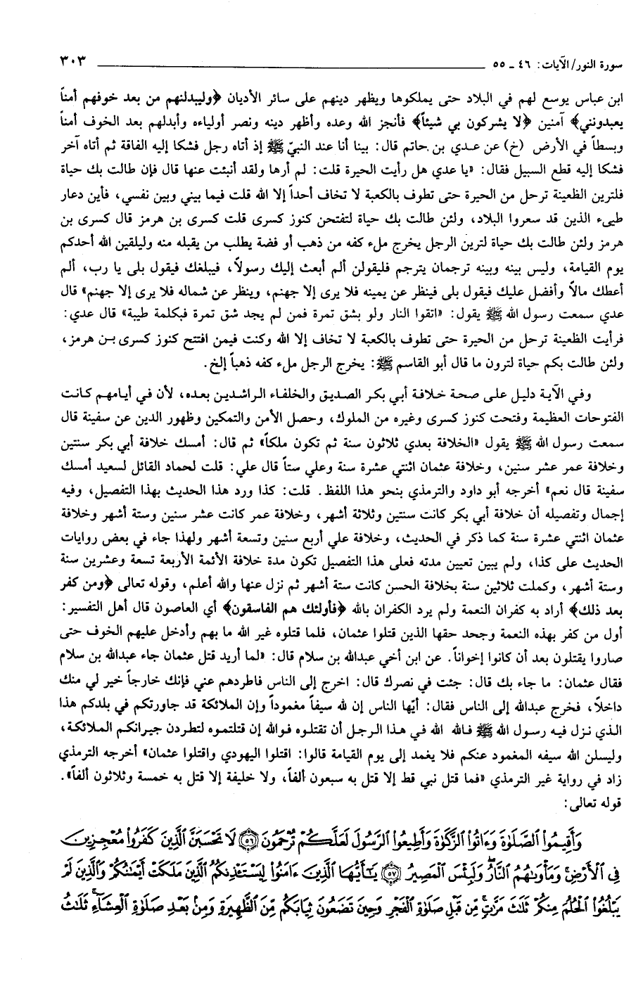 ابن عباس يوسع لهم في البلاد حتى يملكوها ويظهر دينهم على سائر الأديان وَلَيُبَدِّلَنَّهُمْ مِنْ بَعْدِ خَوْفِهِمْ أَمْناً يَعْبُدُونَنِي آمنين لا يُشْرِكُونَ بِي شَيْئاً فأنجز الله وعده وأظهر دينه ونصر أولياءه وأبدلهم بعد الخوف أمنا وبسطا في الأرض (خ) عن عدي بن حاتم قال: بينا أنا عند النبيّ صلّى الله عليه وسلّم إذ أتاه رجل فشكا إليه الفاقة ثم أتاه آخر فشكا إليه قطع السبيل فقال: «يا عدي هل رأيت الحيرة قلت: لم أرها ولقد أنبئت عنها قال فإن طالت بك حياة فلترين الظعينة ترحل من الحيرة حتى تطوف بالكعبة لا تخاف أحدا إلا الله قلت فيما بيني وبين نفسي، فأين دعار طيئ الذين قد سعروا البلاد، ولئن طالت بك حياة لتفتحن كنوز كسرى قلت كسرى بن هرمز قال كسرى بن هرمز ولئن طالت بك حياة لترين الرجل يخرج ملء كفه من ذهب أو فضة يطلب من يقبله منه وليلقين الله أحدكم يوم القيامة، وليس بينه وبينه ترجمان يترجم فليقولن ألم أبعث إليك رسولا، فيبلغك فيقول بلى يا رب، ألم أعطك مالا وأفضل عليك فيقول بلى فينظر عن يمينه فلا يرى إلا جهنم، وينظر عن شماله فلا يرى إلا جهنم» قال عدي سمعت رسول الله صلّى الله عليه وسلّم يقول: «اتقوا النار ولو بشق تمرة فمن لم يجد شق تمرة فبكلمة طيبة» قال عدي: