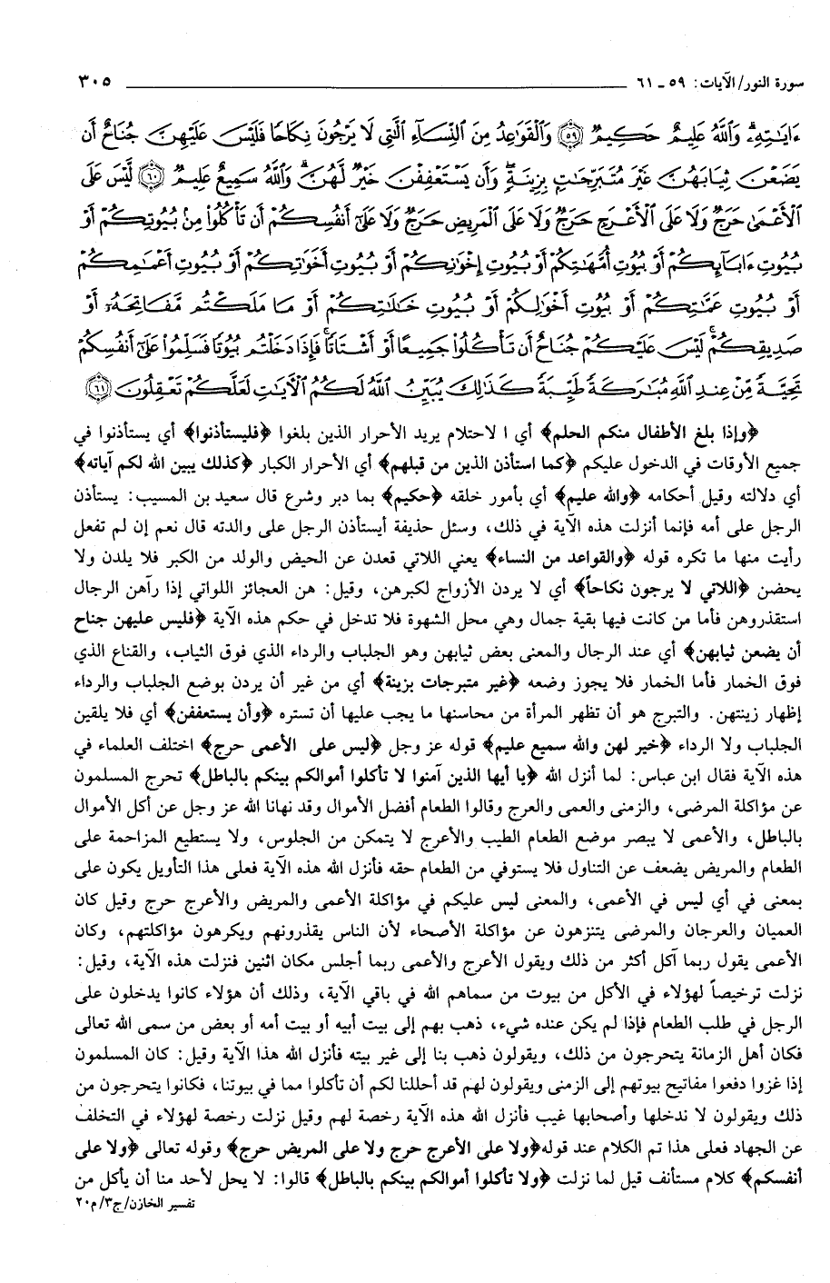 وَإِذا بَلَغَ الْأَطْفالُ مِنْكُمُ الْحُلُمَ فَلْيَسْتَأْذِنُوا كَمَا اسْتَأْذَنَ الَّذِينَ مِنْ قَبْلِهِمْ كَذلِكَ يُبَيِّنُ اللَّهُ لَكُمْ آياتِهِ وَاللَّهُ عَلِيمٌ حَكِيمٌ (59) وَالْقَواعِدُ مِنَ النِّساءِ اللاَّتِي لا يَرْجُونَ نِكاحاً فَلَيْسَ عَلَيْهِنَّ جُناحٌ أَنْ يَضَعْنَ ثِيابَهُنَّ غَيْرَ مُتَبَرِّجاتٍ بِزِينَةٍ وَأَنْ يَسْتَعْفِفْنَ خَيْرٌ لَهُنَّ وَاللَّهُ سَمِيعٌ عَلِيمٌ (60) لَيْسَ عَلَى الْأَعْمى حَرَجٌ وَلا عَلَى الْأَعْرَجِ حَرَجٌ وَلا عَلَى الْمَرِيضِ حَرَجٌ وَلا عَلى أَنْفُسِكُمْ أَنْ تَأْكُلُوا مِنْ بُيُوتِكُمْ أَوْ بُيُوتِ آبائِكُمْ أَوْ بُيُوتِ أُمَّهاتِكُمْ أَوْ بُيُوتِ إِخْوانِكُمْ أَوْ بُيُوتِ أَخَواتِكُمْ أَوْ بُيُوتِ أَعْمامِكُمْ أَوْ بُيُوتِ عَمَّاتِكُمْ أَوْ بُيُوتِ أَخْوالِكُمْ أَوْ بُيُوتِ خالاتِكُمْ أَوْ ما مَلَكْتُمْ مَفاتِحَهُ أَوْ صَدِيقِكُمْ لَيْسَ عَلَيْكُمْ جُناحٌ أَنْ تَأْكُلُوا جَمِيعاً أَوْ أَشْتاتاً فَإِذا دَخَلْتُمْ بُيُوتاً فَسَلِّمُوا عَلى أَنْفُسِكُمْ تَحِيَّةً مِنْ عِنْدِ اللَّهِ مُبارَكَةً طَيِّبَةً كَذلِكَ يُبَيِّنُ اللَّهُ لَكُمُ الْآياتِ لَعَلَّكُمْ تَعْقِلُونَ (61)