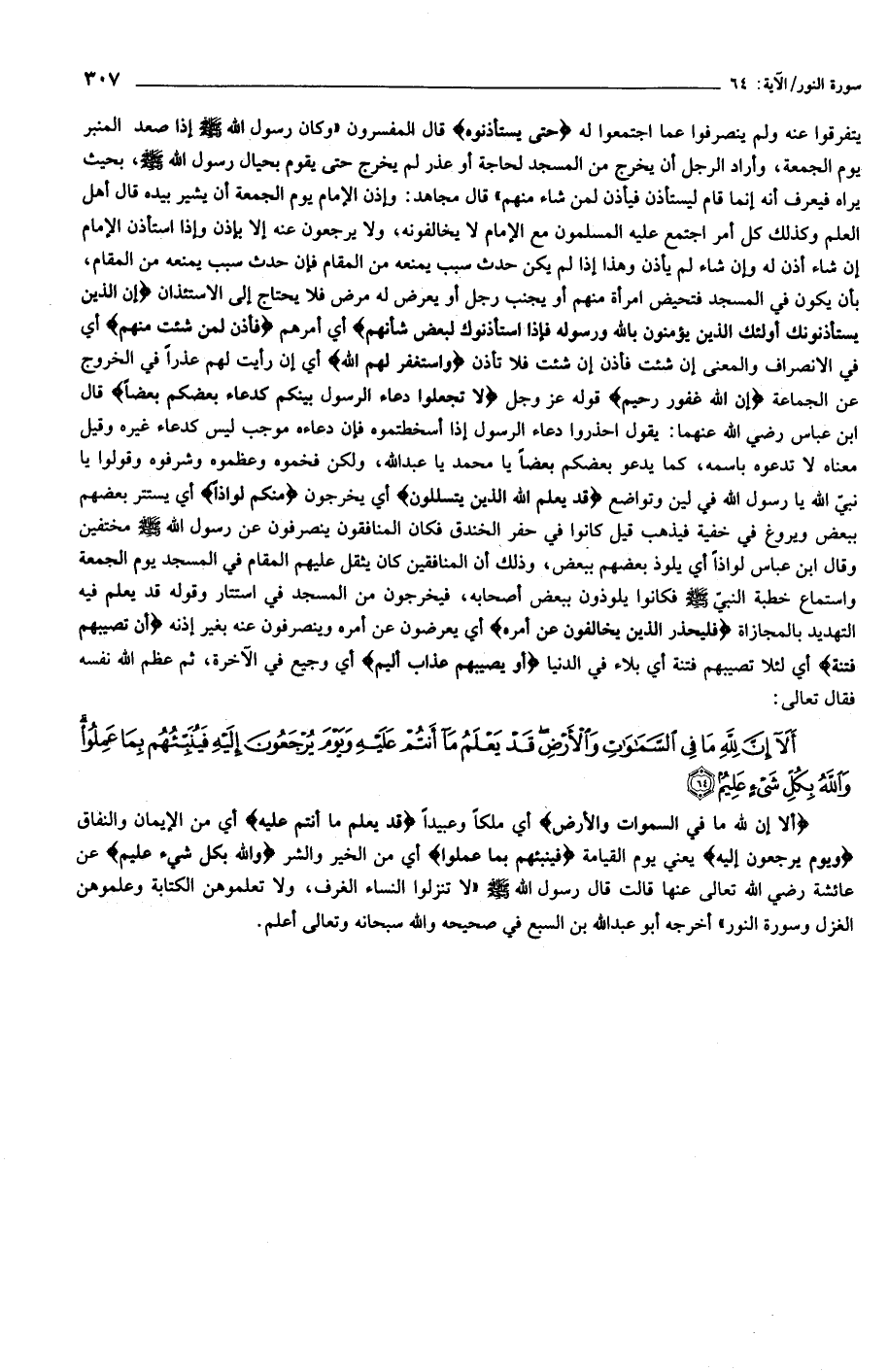 يتفرقوا عنه ولم ينصرفوا عما اجتمعوا له حَتَّى يَسْتَأْذِنُوهُ قال المفسرون «وكان رسول الله صلّى الله عليه وسلّم إذا صعد المنبر يوم الجمعة، وأراد الرجل أن يخرج من المسجد لحاجة أو عذر لم يخرج حتى يقوم بحيال رسول الله صلّى الله عليه وسلّم، بحيث يراه فيعرف أنه إنما قام ليستأذن فيأذن لمن شاء منهم» قال مجاهد: وإذن الإمام يوم الجمعة أن يشير بيده قال أهل العلم وكذلك كل أمر اجتمع عليه المسلمون مع الإمام لا يخالفونه، ولا يرجعون عنه إلا بإذن وإذا استأذن الإمام إن شاء أذن له وإن شاء لم يأذن وهذا إذا لم يكن حدث سبب يمنعه من المقام فإن حدث سبب يمنعه من المقام، بأن يكون في المسجد فتحيض امرأة منهم أو يجنب رجل أو يعرض له مرض فلا يحتاج إلى الاستئذان إِنَّ الَّذِينَ يَسْتَأْذِنُونَكَ أُولئِكَ الَّذِينَ يُؤْمِنُونَ بِاللَّهِ وَرَسُولِهِ فَإِذَا اسْتَأْذَنُوكَ لِبَعْضِ شَأْنِهِمْ أي أمرهم فَأْذَنْ لِمَنْ شِئْتَ مِنْهُمْ أي في الانصراف والمعنى إن شئت فأذن إن شئت فلا تأذن وَاسْتَغْفِرْ لَهُمُ اللَّهَ أي إن رأيت لهم عذرا في الخروتج عن الجماعة إِنَّ اللَّهَ غَفُورٌ رَحِيمٌ قوله عز وجل لا تَجْعَلُوا دُعاءَ الرَّسُولِ بَيْنَكُمْ كَدُعاءِ بَعْضِكُمْ بَعْضاً قال ابن عباس رضي الله عنهما: يقول احذروا دعاء الرسول إذا أسخطتموه فإن دعاءه موجب ليس كدعاء غيره وقيل معناه لا تدعوه باسمه، كما يدعو بعضكم بعضا يا محمد يا عبد الله، ولكن فخموه وعظموه وشرفوه وقولوا يا نبيّ الله يا رسول الله في لين وتواضع قَدْ يَعْلَمُ اللَّهُ الَّذِينَ يَتَسَلَّلُونَ أي يخرجون مِنْكُمْ لِواذاً أي يستتر بعضهم ببعض ويروغ في خفية فيذهب قيل كانوا في حفر الخندق فكان المنافقون ينصرفون عن رسول الله صلّى الله عليه وسلّم مختفين وقال ابن عباس لواذا أي يلوذ بعضهم ببعض، وذلك أن المنافقين كان يثقل عليهم المقام في المسجد يوم الجمعة واستماع خطبة النبيّ صلّى الله عليه وسلّم فكانوا يلوذون ببعض أصحابه، فيخرجون من المسجد في استتار وقوله قد يعلم فيه التهديد بالمجازاة فَلْيَحْذَرِ الَّذِينَ يُخالِفُونَ عَنْ أَمْرِهِ أي يعرضون عن أمره وينصرفون عنه بغير إذنه أَنْ تُصِيبَهُمْ فِتْنَةٌ أي لئلا تصيبهم فتنة أي بلاء في الدنيا أَوْ يُصِيبَهُمْ عَذابٌ أَلِيمٌ أي وجيع في الآخرة، ثم عظم الله نفسه فقال تعالى: