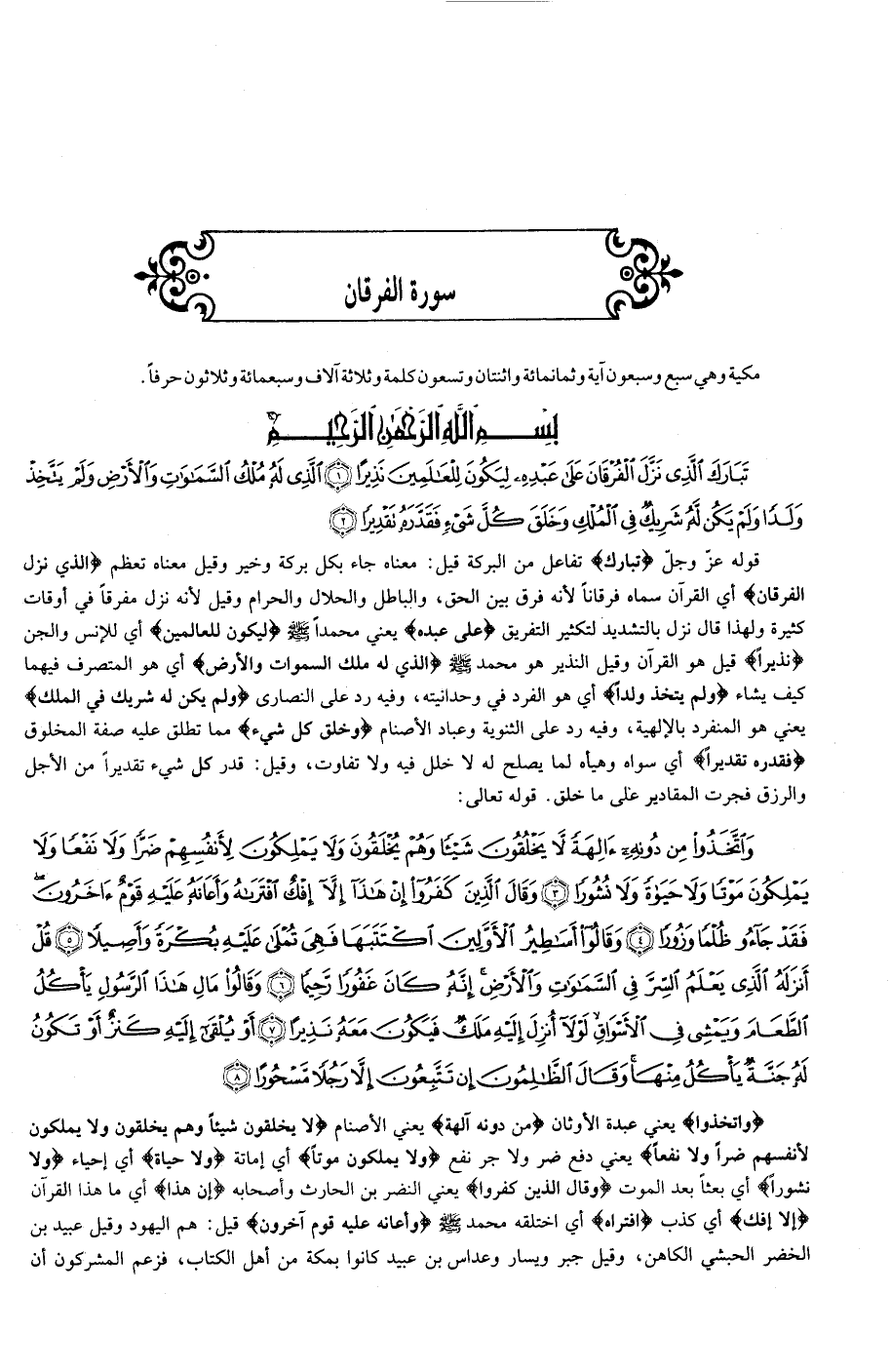تَبارَكَ الَّذِي نَزَّلَ الْفُرْقانَ عَلى عَبْدِهِ لِيَكُونَ لِلْعالَمِينَ نَذِيراً (1) الَّذِي لَهُ مُلْكُ السَّماواتِ وَالْأَرْضِ وَلَمْ يَتَّخِذْ وَلَداً وَلَمْ يَكُنْ لَهُ شَرِيكٌ فِي الْمُلْكِ وَخَلَقَ كُلَّ شَيْءٍ فَقَدَّرَهُ تَقْدِيراً (2)