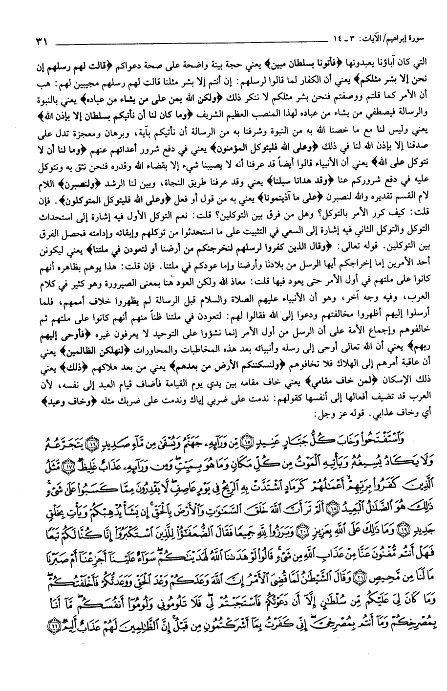 وليس لنا مع ما خصنا الله به من النبوة وشرفنا به من الرسالة أن نأتيكم بآية، وبرهان ومعجزة تدل على صدقنا إلا بإذن الله لنا في ذلك وَعَلَى اللَّهِ فَلْيَتَوَكَّلِ الْمُؤْمِنُونَ يعني في دفع شرور أعدائهم عنهم وَما لَنا أَلَّا نَتَوَكَّلَ عَلَى اللَّهِ يعني أن الأنبياء قالوا أيضا قد عرفنا أنه لا يصيبنا شيء إلا بقضاء الله وقدره فنحن نثق به ونتوكل عليه في دفع شروركم عنا وَقَدْ هَدانا سُبُلَنا يعني وقد عرفنا طريق النجاة، وبين لنا الرشد وَلَنَصْبِرَنَّ اللام لام القسم تقديره والله لنصبرن عَلى ما آذَيْتُمُونا يعني به من قول أو فعل وَعَلَى اللَّهِ فَلْيَتَوَكَّلِ الْمُتَوَكِّلُونَ. فإن قلت: كيف كرر الأمر بالتوكل؟ وهل من فرق بين التوكلين؟ قلت: نعم التوكل الأول فيه إشارة إلى استحداث التوكل والتوكل الثاني فيه إشارة إلى السعي في التثبيت على ما استحدثوا من توكلهم وإبقائه وإدامته فحصل الفرق بين التوكلين. قوله تعالى: وَقالَ الَّذِينَ كَفَرُوا لِرُسُلِهِمْ لَنُخْرِجَنَّكُمْ مِنْ أَرْضِنا أَوْ لَتَعُودُنَّ فِي مِلَّتِنا يعني ليكونن أحد الأمرين إما إخراجكم أيها الرسل من بلادنا وأرضنا وإما عودكم في ملتنا. فإن قلت: هذا يوهم بظاهره أنهم كانوا على ملتهم في أول الأمر حتى يعود فيها قلت: معاذ الله ولكن العود هنا بمعنى الصيرورة وهو كثير في كلام العرب، وفيه وجه آخر، وهو أن الأنبياء عليهم الصلاة والسلام قبل الرسالة لم يظهروا خلاف أممهم، فلما أرسلوا إليهم أظهروا مخالفتهم ودعوا إلى الله فقالوا لهم: لتعودن في ملتنا ظنا منهم أنهم كانوا على ملتهم ثم خالفوهم وإجماع الأمة على أن الرسل من أول الأمر إنما نشئوا على التوحيد لا يعرفون غيره فَأَوْحى إِلَيْهِمْ رَبُّهُمْ يعني أن الله تعالى أوحى إلى رسله وأنبيائه بعد هذه المخاطبات والمحاورات لَنُهْلِكَنَّ الظَّالِمِينَ يعني أن عاقبة أمرهم إلى الهلاك فلا تخافوهم وَلَنُسْكِنَنَّكُمُ الْأَرْضَ مِنْ بَعْدِهِمْ يعني من بعد هلاكهم ذلِكَ يعني ذلك الإسكان لِمَنْ خافَ مَقامِي يعني خاف مقامه بين يدي يوم القيامة فأضاف قيام العبد إلى نفسه، لأن العرب قد تضيف أفعالها إلى أنفسها كقولهم: ندمت على ضربي إياك وندمت على ضربك مثله وَخافَ وَعِيدِ أي وخاف عذابي. قوله عز وجل: