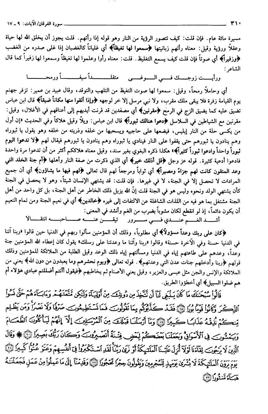 مقرنين مع الشياطين في السلاسل دَعَوْا هُنالِكَ ثُبُوراً قال ابن عباس: ويلا وقيل هلاكا وفي الحديث «إن أول من يكسى حلة من النار إبليس، فيضعها على حاجبيه ويسحبها من خلفه وذريته من خلفه وهو يقول يا ثبوراه وهم ينادون يا ثبورهم حتى يقفوا على النار فينادي يا ثبوراه وهم ينادون يا ثبورهم فيقال لهم لا تَدْعُوا الْيَوْمَ ثُبُوراً واحِداً وَادْعُوا ثُبُوراً كَثِيراً هكذا ذكره البغوي بغير سند، وقيل معناه هلاككم أكثر من أن تدعوا مرة واحدة فادعوا أدعية كثيرة. قوله عز وجل قُلْ أَذلِكَ خَيْرٌ أي الذي ذكرت من صفة النار وأهلها أَمْ جَنَّةُ الْخُلْدِ الَّتِي وُعِدَ الْمُتَّقُونَ كانَتْ لَهُمْ جَزاءً وَمَصِيراً أي ثوابا ومرجعا لهم قال تعالى لَهُمْ فِيها ما يَشاؤُنَ أي أن جميع المرادات لا تحصل إلا في الجنة، لا في غيرها. فإن قلت: قد يشتهي الإنسان شيئا، وهو لا يحصل في الجنة كأن يشتهي الولد ونحوه وليس هو في الجنة قلت إنّ الله يزيل ذلك الخاطر عن أهل الجنة، بل كل واحد من أهل الجنة مشتغل بما هو فيه من اللذات الشاغلة عن الالتفات إلى غيره خالِدِينَ أي في نعيم الجنة ومن تمام النعيم أن يكون دائما، إذ لو انقطع لكان مشوبا بضرب من الغم وأنشد في المعنى: