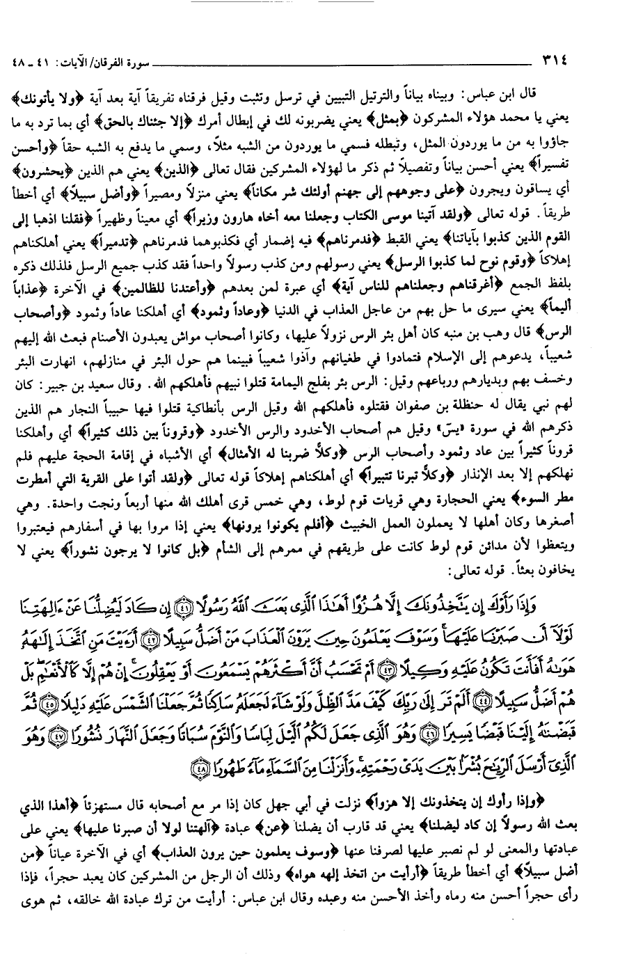 قال ابن عباس: وبيناه بيانا والترتيل التبيين في ترسل وتثبت وقيل فرقناه تفريقا آية بعد آية وَلا يَأْتُونَكَ يعني يا محمد هؤلاء المشركون بِمَثَلٍ يعني يضربونه لك في إبطال أمرك إِلَّا جِئْناكَ بِالْحَقِّ أي بما ترد به ما جاءوا به من ما يوردون المثل، وتبطله فسمي ما يوردون من الشبه مثلا، وسمي ما يدفع به الشبه حقا وَأَحْسَنَ تَفْسِيراً يعني أحسن بيانا وتفصيلا ثم ذكر ما لهؤلاء المشركين فقال تعالى الَّذِينَ يعني هم الذين يُحْشَرُونَ أي يساقون ويجرون عَلى وُجُوهِهِمْ إِلى جَهَنَّمَ أُوْلئِكَ شَرٌّ مَكاناً يعني منزلا ومصيرا وَأَضَلُّ سَبِيلًا أي أخطأ طريقا. قوله تعالى وَلَقَدْ آتَيْنا مُوسَى الْكِتابَ وَجَعَلْنا مَعَهُ أَخاهُ هارُونَ وَزِيراً أي معينا وظهيرا فَقُلْنَا اذْهَبا إِلَى الْقَوْمِ الَّذِينَ كَذَّبُوا بِآياتِنا يعني القبط فَدَمَّرْناهُمْ فيه إضمار أي فكذبوهما فدمرناهم تَدْمِيراً يعني أهلكناهم إهلاكا وَقَوْمَ نُوحٍ لَمَّا كَذَّبُوا الرُّسُلَ يعني رسولهم ومن كذب رسولا واحدا فقد كذب جميع الرسل فلذلك ذكره بلفظ الجمع أَغْرَقْناهُمْ وَجَعَلْناهُمْ لِلنَّاسِ آيَةً أي عبرة لمن بعدهم وَأَعْتَدْنا لِلظَّالِمِينَ في الآخرة عَذاباً أَلِيماً يعني سيرى ما حل بهم من عاجل العذاب في الدنيا وَعاداً وَثَمُودَ أي أهلكنا عادا وثمود وَأَصْحابَ الرَّسِّ قال وهب بن منبه كان أهل بئر الرس نزولا عليها، وكانوا أصحاب مواش يعبدون الأصنام فبعث الله إليهم شعيبا، يدعوهم إلى الإسلام فتمادوا في طغيانهم وآذوا شعيبا فبينما هم حول البئر في منازلهم، انهارت البئر وخسف بهم وبديارهم ورباعهم وقيل: الرس بئر بفلج اليمامة قتلوا نبيهم فأهلكهم الله. وقال سعيد بن جبير: كان لهم نبي يقال له حنظلة بن صفوان فقتلوه فأهلكهم الله وقيل الرس بأنطاكية قتلوا فيها حبيبا النجار هم الذين ذكرهم الله في سورة «يس» وقيل هم أصحاب الأخدود والرس الأخدود وَقُرُوناً بَيْنَ ذلِكَ كَثِيراً أي وأهلكنا قرونا كثيرا بين عاد وثمود وأصحاب الرس وَكُلًّا ضَرَبْنا لَهُ الْأَمْثالَ أي الأشباه في إقامة الحجة عليهم فلم نهلكهم إلا بعد الإنذار وَكُلًّا تَبَّرْنا تَتْبِيراً أي أهلكناهم إهلاكا قوله تعالى وَلَقَدْ أَتَوْا عَلَى الْقَرْيَةِ الَّتِي أُمْطِرَتْ مَطَرَ السَّوْءِ يعني الحجارة وهي قريات قوم لوط، وهي خمس قرى أهلك الله منها أربعا ونجت واحدة. وهي أصغرها وكان أهلها لا يعملون العمل الخبيث أَفَلَمْ يَكُونُوا يَرَوْنَها يعني إذا مروا بها في أسفارهم فيعتبروا ويتعظوا لأن مدائن قوم لوط كانت على طريقهم في ممرهم إلى الشأم بَلْ كانُوا لا يَرْجُونَ نُشُوراً يعني لا يخافون بعثا. قوله تعالى: