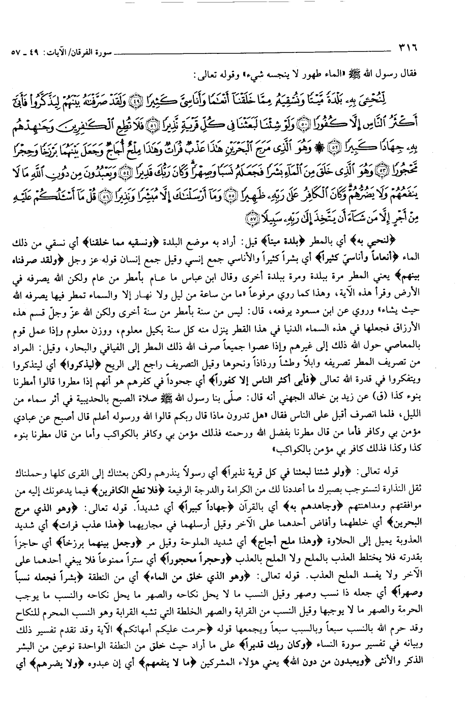 لِنُحْيِيَ بِهِ بَلْدَةً مَيْتاً وَنُسْقِيَهُ مِمَّا خَلَقْنا أَنْعاماً وَأَناسِيَّ كَثِيراً (49) وَلَقَدْ صَرَّفْناهُ بَيْنَهُمْ لِيَذَّكَّرُوا فَأَبى أَكْثَرُ النَّاسِ إِلاَّ كُفُوراً (50) وَلَوْ شِئْنا لَبَعَثْنا فِي كُلِّ قَرْيَةٍ نَذِيراً (51) فَلا تُطِعِ الْكافِرِينَ وَجاهِدْهُمْ بِهِ جِهاداً كَبِيراً (52) وَهُوَ الَّذِي مَرَجَ الْبَحْرَيْنِ هذا عَذْبٌ فُراتٌ وَهذا مِلْحٌ أُجاجٌ وَجَعَلَ بَيْنَهُما بَرْزَخاً وَحِجْراً مَحْجُوراً (53)