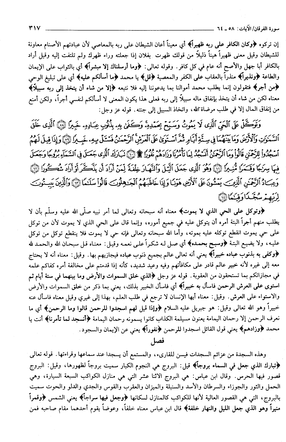 وَتَوَكَّلْ عَلَى الْحَيِّ الَّذِي لا يَمُوتُ وَسَبِّحْ بِحَمْدِهِ وَكَفى بِهِ بِذُنُوبِ عِبادِهِ خَبِيراً (58) الَّذِي خَلَقَ السَّماواتِ وَالْأَرْضَ وَما بَيْنَهُما فِي سِتَّةِ أَيَّامٍ ثُمَّ اسْتَوى عَلَى الْعَرْشِ الرَّحْمنُ فَسْئَلْ بِهِ خَبِيراً (59) وَإِذا قِيلَ لَهُمُ اسْجُدُوا لِلرَّحْمنِ قالُوا وَمَا الرَّحْمنُ أَنَسْجُدُ لِما تَأْمُرُنا وَزادَهُمْ نُفُوراً (60) تَبارَكَ الَّذِي جَعَلَ فِي السَّماءِ بُرُوجاً وَجَعَلَ فِيها سِراجاً وَقَمَراً مُنِيراً (61) وَهُوَ الَّذِي جَعَلَ اللَّيْلَ وَالنَّهارَ خِلْفَةً لِمَنْ أَرادَ أَنْ يَذَّكَّرَ أَوْ أَرادَ شُكُوراً (62)