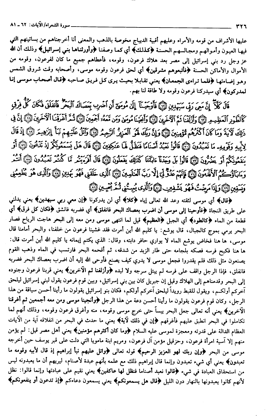 ها هنا فكبح فرسه فصكه بلجامه حتى طار الزبد من شدقه، ثم أقحمه البحر فارتسب في الماء وذهب القوم يصنعون مثل ذلك فلم يقدروا فجعل موسى لا يدري كيف يصنع فأوحى الله إليه أن اضرب بعصاك البحر فضربه فانفلق، فإذا الرجل واقف على فرسه لم يبتل سرجه ولا لبده وَأَزْلَفْنا ثَمَّ الْآخَرِينَ يعني قربنا فرعون وجنوده إلى البحر وقدمناهم إلى الهلاك وقيل إن جبريل كان بين بني إسرائيل، وبين قوم فرعون يقول لبني إسرائيل ليلحق آخركم أولكم، ويقول للقبط رويدا ليلحق آخركم أولكم، فكان بنو إسرائيل يقولون ما رأينا أحسن سياقة من هذا الرجل، وكان قوم فرعون يقولون ما رأينا أحسن دعة من هذا الرجل وَأَنْجَيْنا مُوسى وَمَنْ مَعَهُ أَجْمَعِينَ ثُمَّ أَغْرَقْنَا الْآخَرِينَ يعني أنه تعالى جعل البحر يبسا حتى خرج موسى وقومه، منه وأغرق فرعون وقومه، وذلك أنهم لما تكاملوا في البحر انطبق عليهم فأغرقهم إِنَّ فِي ذلِكَ لَآيَةً يعني ما حدث في البحر من انفلاقه آية من الآيات العظام الدالة على قدرته ومعجزة لموسى عليه السلام وَما كانَ أَكْثَرُهُمْ مُؤْمِنِينَ يعني أهل مصر قيل: لم يؤمن منهم إلا آسية امرأة فرعون، وحزقيل مؤمن آل فرعون، ومريم ابنة مامويا التي دلت على قبر يوسف حين أخرجه موسى من البحر وَإِنَّ رَبَّكَ لَهُوَ الْعَزِيزُ الرَّحِيمُ قوله تعالى وَاتْلُ عَلَيْهِمْ نَبَأَ إِبْراهِيمَ إِذْ قالَ لِأَبِيهِ وَقَوْمِهِ ما تَعْبُدُونَ يعني أي شيء تعبدون وإنما قال إبراهيم ذلك مع علمه بأنهم عبدة لأصنام، ليريهم أن ما يعبدونه ليس من استحقاق العبادة في شيء قالُوا نَعْبُدُ أَصْناماً فَنَظَلُّ لَها عاكِفِينَ يعني نقيم على عبادتها وإنما قالوا: نظل لأنهم كانوا يعبدونها بالنهار دون الليل قالَ هَلْ يَسْمَعُونَكُمْ يعني يسمعون دعاءكم إِذْ تَدْعُونَ أَوْ يَنْفَعُونَكُمْ