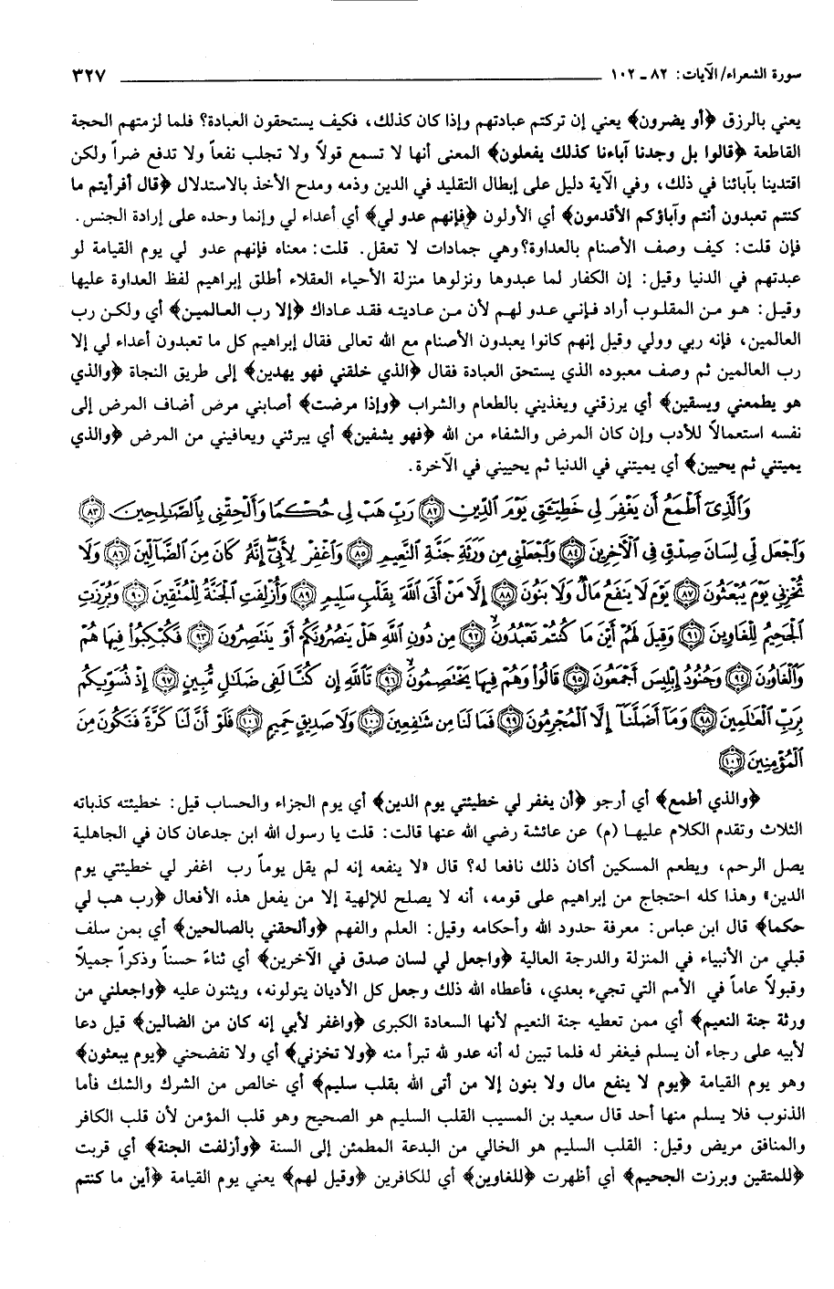 وَالَّذِي أَطْمَعُ أي أرجو أَنْ يَغْفِرَ لِي خَطِيئَتِي يَوْمَ الدِّينِ أي يوم الجزاء والحساب قيل: خطيئته كذباته الثلاث وتقدم الكلام عليها (م) عن عائشة رضي الله عنها قالت: قلت يا رسول الله ابن جدعان كان في الجاهلية يصل الرحم، ويطعم المسكين أكان ذلك نافعا له؟ قال «لا ينفعه إنه لم يقل يوما رب اغفر لي خطيئتي يوم الدين» وهذا كله احتجاج من إبراهيم على قومه، أنه لا يصلح للإلهية إلا من يفعل هذه الأفعال رَبِّ هَبْ لِي حُكْماً قال ابن عباس: معرفة حدود الله وأحكامه وقيل: العلم والفهم وَأَلْحِقْنِي بِالصَّالِحِينَ أي بمن سلف قبلي من الأنبياء في المنزلة والدرجة العالية وَاجْعَلْ لِي لِسانَ صِدْقٍ فِي الْآخِرِينَ أي ثناء حسنا وذكرا جميلا وقبولا عاما في الأمم التي تجيء بعدي، فأعطاه الله ذلك وجعل كل الأديان يتولونه، ويثنون عليه وَاجْعَلْنِي مِنْ وَرَثَةِ جَنَّةِ النَّعِيمِ أي ممن تعطيه جنة النعيم لأنها السعادة الكبرى وَاغْفِرْ لِأَبِي إِنَّهُ كانَ مِنَ الضَّالِّينَ قيل دعا لأبيه على رجاء أن يسلم فيغفر له فلما تبين له أنه عدو لله تبرأ منه وَلا تُخْزِنِي أي ولا تفضحني يَوْمَ يُبْعَثُونَ وهو يوم القيامة يَوْمَ لا يَنْفَعُ مالٌ وَلا بَنُونَ إِلَّا مَنْ أَتَى اللَّهَ بِقَلْبٍ سَلِيمٍ أي خالص من الشرك والشك فأما الذنوب فلا يسلم منها أحد قال سعيد بن المسيب القلب السليم هو الصحيح وهو قلب المؤمن لأن قلب الكافر والمنافق مريض وقيل: القلب السليم هو الخالي من البدعة المطمئن إلى السنة وَأُزْلِفَتِ الْجَنَّةُ أي قربت لِلْمُتَّقِينَ وَبُرِّزَتِ الْجَحِيمُ أي أظهرت لِلْغاوِينَ أي للكافرين وَقِيلَ لَهُمْ يعني يوم القيامة أَيْنَ ما كُنْتُمْ