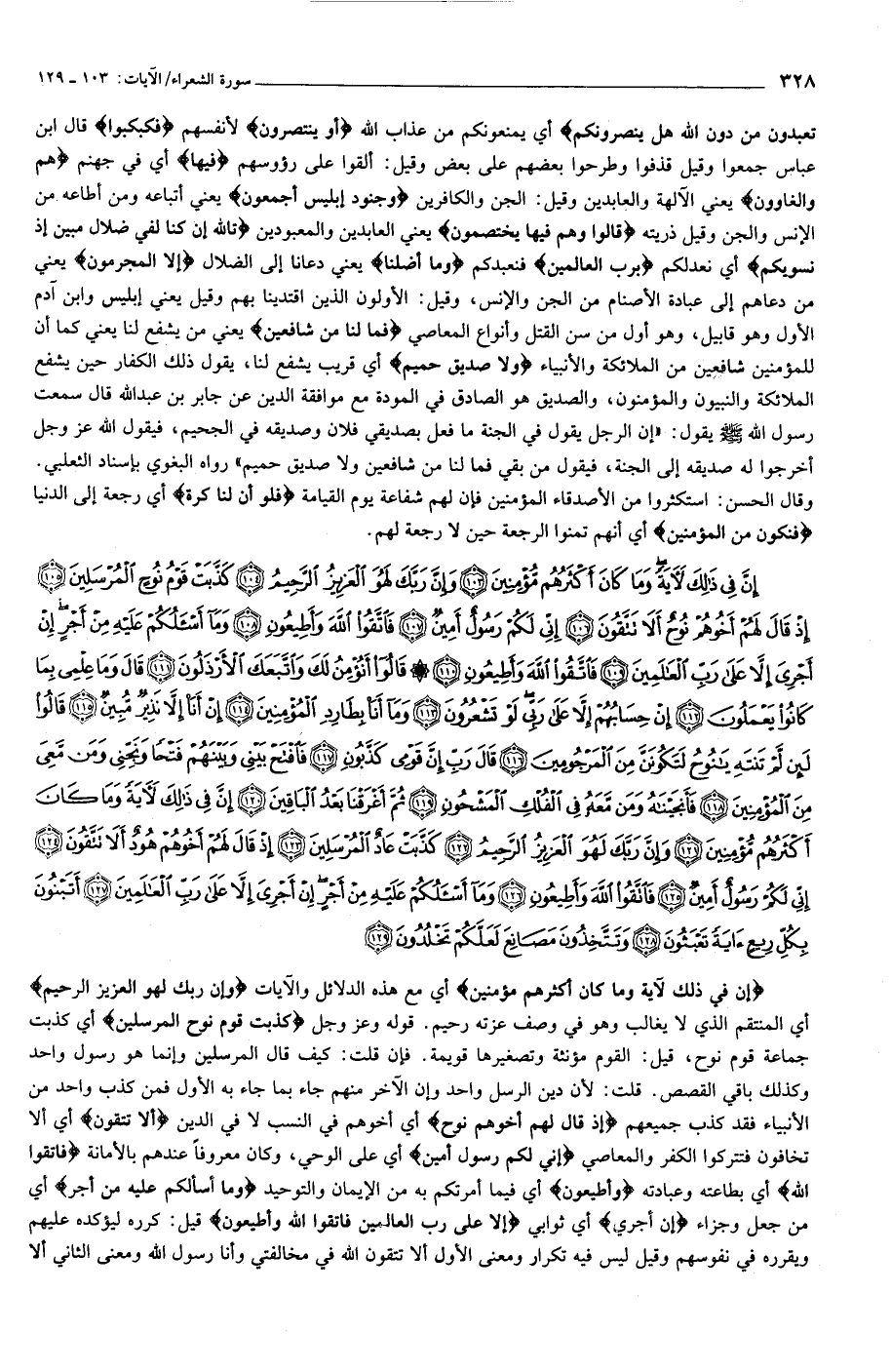 إِنَّ فِي ذلِكَ لَآيَةً وَما كانَ أَكْثَرُهُمْ مُؤْمِنِينَ أي مع هذه الدلائل والآيات وَإِنَّ رَبَّكَ لَهُوَ الْعَزِيزُ الرَّحِيمُ أي المنتقم الذي لا يغالب وهو في وصف عزته رحيم. قوله وعز وجل كَذَّبَتْ قَوْمُ نُوحٍ الْمُرْسَلِينَ أي كذبت جماعة قوم نوح، قيل: القوم مؤنثة وتصغيرها قويمة. فإن قلت: كيف قال المرسلين وإنما هو رسول واحد وكذلك باقي القصص. قلت: لأن دين الرسل واحد وإن الآخر منهم جاء بما جاء به الأول فمن كذب واحد من الأنبياء فقد كذب جميعهم إِذْ قالَ لَهُمْ أَخُوهُمْ نُوحٌ أي أخوهم في النسب لا في الدين أَلا تَتَّقُونَ أي ألا تخافون فتتركوا الكفر والمعاصي إِنِّي لَكُمْ رَسُولٌ أَمِينٌ أي على الوحي، وكان معروفا عندهم بالأمانة فَاتَّقُوا اللَّهَ أي بطاعته وعبادته وَأَطِيعُونِ أي فيما أمرتكم به من الإيمان والتوحيد وَما أَسْئَلُكُمْ عَلَيْهِ مِنْ أَجْرٍ أي من جعل وجزاء إِنْ أَجْرِيَ أي ثوابي إِلَّا عَلى رَبِّ الْعالَمِينَ فَاتَّقُوا اللَّهَ وَأَطِيعُونِ قيل: كرره ليؤكده عليهم ويقرره في نفوسهم وقيل ليس فيه تكرار ومعنى الأول ألا تتقون الله في مخالفتي وأنا رسول الله ومعنى الثاني ألا