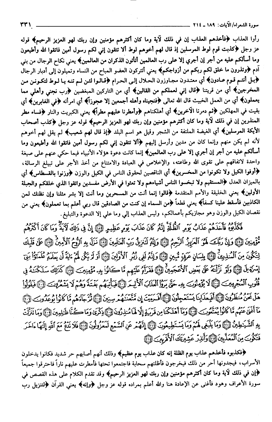 رأوا العذاب فَأَخَذَهُمُ الْعَذابُ إِنَّ فِي ذلِكَ لَآيَةً وَما كانَ أَكْثَرُهُمْ مُؤْمِنِينَ وَإِنَّ رَبَّكَ لَهُوَ الْعَزِيزُ الرَّحِيمُ قوله عز وجل كَذَّبَتْ قَوْمُ لُوطٍ الْمُرْسَلِينَ إِذْ قالَ لَهُمْ أَخُوهُمْ لُوطٌ أَلا تَتَّقُونَ إِنِّي لَكُمْ رَسُولٌ أَمِينٌ فَاتَّقُوا اللَّهَ وَأَطِيعُونِ وَما أَسْئَلُكُمْ عَلَيْهِ مِنْ أَجْرٍ إِنْ أَجْرِيَ إِلَّا عَلى رَبِّ الْعالَمِينَ أَتَأْتُونَ الذُّكْرانَ مِنَ الْعالَمِينَ يعني نكاح الرجال من بني آدم وَتَذَرُونَ ما خَلَقَ لَكُمْ رَبُّكُمْ مِنْ أَزْواجِكُمْ يعني أتتركون العضو المباح من النساء وتميلون إلى أدبار الرجال بَلْ أَنْتُمْ قَوْمٌ عادُونَ أي معتدون مجاوزون الحلال إلى الحرام قالُوا لَئِنْ لَمْ تَنْتَهِ يا لُوطُ لَتَكُونَنَّ مِنَ الْمُخْرَجِينَ أي من قريتنا قالَ إِنِّي لِعَمَلِكُمْ مِنَ الْقالِينَ أي من التاركين المبغضين رَبِّ نَجِّنِي وَأَهْلِي مِمَّا يَعْمَلُونَ أي من العمل الخبيث قال الله تعالى فَنَجَّيْناهُ وَأَهْلَهُ أَجْمَعِينَ إِلَّا عَجُوزاً أي امرأته فِي الْغابِرِينَ أي بقيت في المهلكين ثُمَّ دَمَّرْنَا الْآخَرِينَ أي أهلكناهم وَأَمْطَرْنا عَلَيْهِمْ مَطَراً يعني الكبريت والنار فَساءَ مَطَرُ الْمُنْذَرِينَ إِنَّ فِي ذلِكَ لَآيَةً وَما كانَ أَكْثَرُهُمْ مُؤْمِنِينَ وَإِنَّ رَبَّكَ لَهُوَ الْعَزِيزُ الرَّحِيمُ قوله عز وجل كَذَّبَ أَصْحابُ الْأَيْكَةِ الْمُرْسَلِينَ أي الغيضة الملتفة من الشجر وقيل هو اسم البلد إِذْ قالَ لَهُمْ شُعَيْبٌ لم يقل لهم أخوهم لأنه لم يكن منهم وإنما كان من مدين وأرسل إليهم أَلا تَتَّقُونَ إِنِّي لَكُمْ رَسُولٌ أَمِينٌ فَاتَّقُوا اللَّهَ وَأَطِيعُونِ وَما أَسْئَلُكُمْ عَلَيْهِ مِنْ أَجْرٍ إِنْ أَجْرِيَ إِلَّا عَلى رَبِّ الْعالَمِينَ إنما كانت دعوة هؤلاء الأنبياء فيما حكي عنهم على صيغة واحدة لاتفاقهم على تقوى الله وطاعته، والإخلاص في العبادة والامتناع من أخذ الأجر على تبليغ الرسالة، أَوْفُوا الْكَيْلَ وَلا تَكُونُوا مِنَ الْمُخْسِرِينَ أي الناقصين لحقوق الناس في الكيل والوزن وَزِنُوا بِالْقِسْطاسِ أي بالميزان العدل الْمُسْتَقِيمِ وَلا تَبْخَسُوا النَّاسَ أَشْياءَهُمْ وَلا تَعْثَوْا فِي الْأَرْضِ مُفْسِدِينَ وَاتَّقُوا الَّذِي خَلَقَكُمْ وَالْجِبِلَّةَ الْأَوَّلِينَ يعني الخليقة والأمم المتقدمة قالُوا إِنَّما أَنْتَ مِنَ الْمُسَحَّرِينَ وَما أَنْتَ إِلَّا بَشَرٌ مِثْلُنا وَإِنْ نَظُنُّكَ لَمِنَ الْكاذِبِينَ فَأَسْقِطْ عَلَيْنا كِسَفاً يعني قطعا مِنَ السَّماءِ إِنْ كُنْتَ مِنَ الصَّادِقِينَ قالَ رَبِّي أَعْلَمُ بِما تَعْمَلُونَ يعني من نقصان الكيل والوزن وهو مجازيكم بأعمالكم، وليس العذاب إلي وما علي إلا الدعوة والتبليغ.