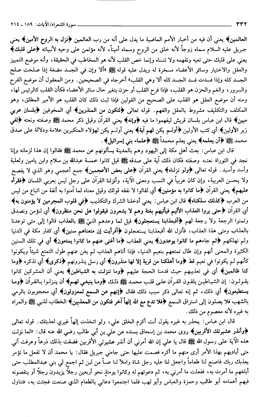 قال ابن عباس: بعث أهل مكة إلى اليهود وهم بالمدينة يسألونهم عن محمد صلّى الله عليه وسلّم فقالوا إن هذا لزمانه وإنا نجد في التوراة نعته وصفته فكان ذلك آية على صدقه صلّى الله عليه وسلّم قيل كانوا خمسة عبد الله بن سلام وابن يامين وثعلبة وأسد وأسيد. قوله تعالى وَلَوْ نَزَّلْناهُ يعني القرآن عَلى بَعْضِ الْأَعْجَمِينَ جمع أعجمي وهو الذي لا يفصح ولا يحسن العربية، وإن كان عربيا في النسب ومعنى الآية، وأنزلنا القرآن على رجل ليس بعربي اللسان فَقَرَأَهُ عَلَيْهِمْ يعني القرآن ما كانُوا بِهِ مُؤْمِنِينَ أي لقالوا لا نفقه قولك وقيل معناه لما آمنوا به أنفة من اتباع من ليس من العرب كَذلِكَ سَلَكْناهُ قال ابن عباس: يعني أدخلنا الشرك والتكذيب فِي قُلُوبِ الْمُجْرِمِينَ لا يُؤْمِنُونَ بِهِ أي القرآن حَتَّى يَرَوُا الْعَذابَ الْأَلِيمَ فَيَأْتِيَهُمْ بَغْتَةً وَهُمْ لا يَشْعُرُونَ فَيَقُولُوا هَلْ نَحْنُ مُنْظَرُونَ أي لنؤمن ونصدق وتمنوا الرجعة ولا رجعة لهم أَفَبِعَذابِنا يَسْتَعْجِلُونَ قيل لما وعدهم النبيّ صلّى الله عليه وسلّم بالعذاب قالوا إلى متى توعدنا بالعذاب ومتى هذا العذاب، فأنزل الله أفبعذابنا يستعجلون أَفَرَأَيْتَ إِنْ مَتَّعْناهُمْ سِنِينَ أي كفار مكة في الدنيا ولم نهلكهم ثُمَّ جاءَهُمْ ما كانُوا يُوعَدُونَ يعني العذاب ما أَغْنى عَنْهُمْ ما كانُوا يُمَتَّعُونَ أي في تلك السنين الكثيرة والمعنى أنهم وإن طال تمتعهم بنعيم الدنيا، فإذا أتاهم العذاب لم يغن عنهم طول التمتع شيئا ويكونوا كأنهم لم يكونوا في نعيم قط وَما أَهْلَكْنا مِنْ قَرْيَةٍ إِلَّا لَها مُنْذِرُونَ أي رسل ينذرونهم ذِكْرى أي تذكره وَما كُنَّا ظالِمِينَ أي في تعذيبهم حيث قدمنا الحجة عليهم وَما تَنَزَّلَتْ بِهِ الشَّياطِينُ يعني أن المشركين كانوا يقولون: إن الشياطين يلقون القرآن على قلب محمد صلّى الله عليه وسلّم ذلك وَما يَنْبَغِي لَهُمْ أن ينزلوا بالقرآن وَما يَسْتَطِيعُونَ أي ذلك، ثم إنه تعالى ذكر سبب ذلك فقال إِنَّهُمْ عَنِ السَّمْعِ لَمَعْزُولُونَ أي محجوبون بالرمي بالشهب فلا يصلون إلى استراق السمع فَلا تَدْعُ مَعَ اللَّهِ إِلهاً آخَرَ فَتَكُونَ مِنَ الْمُعَذَّبِينَ الخطاب للنبي صلّى الله عليه وسلّم والمراد به غيره لأنه معصوم من ذلك.