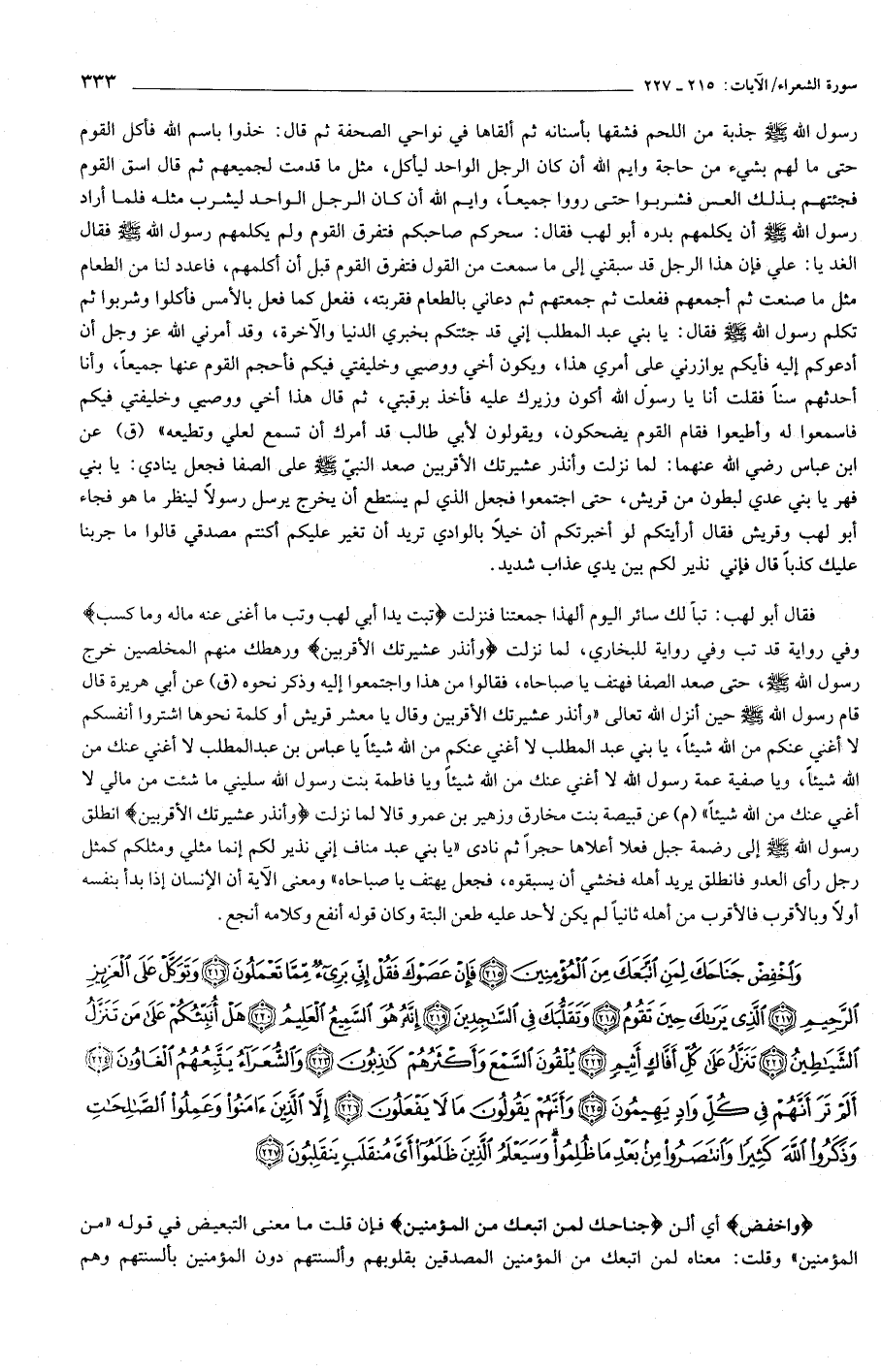 وَاخْفِضْ جَناحَكَ لِمَنِ اتَّبَعَكَ مِنَ الْمُؤْمِنِينَ (215) فَإِنْ عَصَوْكَ فَقُلْ إِنِّي بَرِيءٌ مِمَّا تَعْمَلُونَ (216) وَتَوَكَّلْ عَلَى الْعَزِيزِ الرَّحِيمِ (217) الَّذِي يَراكَ حِينَ تَقُومُ (218) وَتَقَلُّبَكَ فِي السَّاجِدِينَ (219)