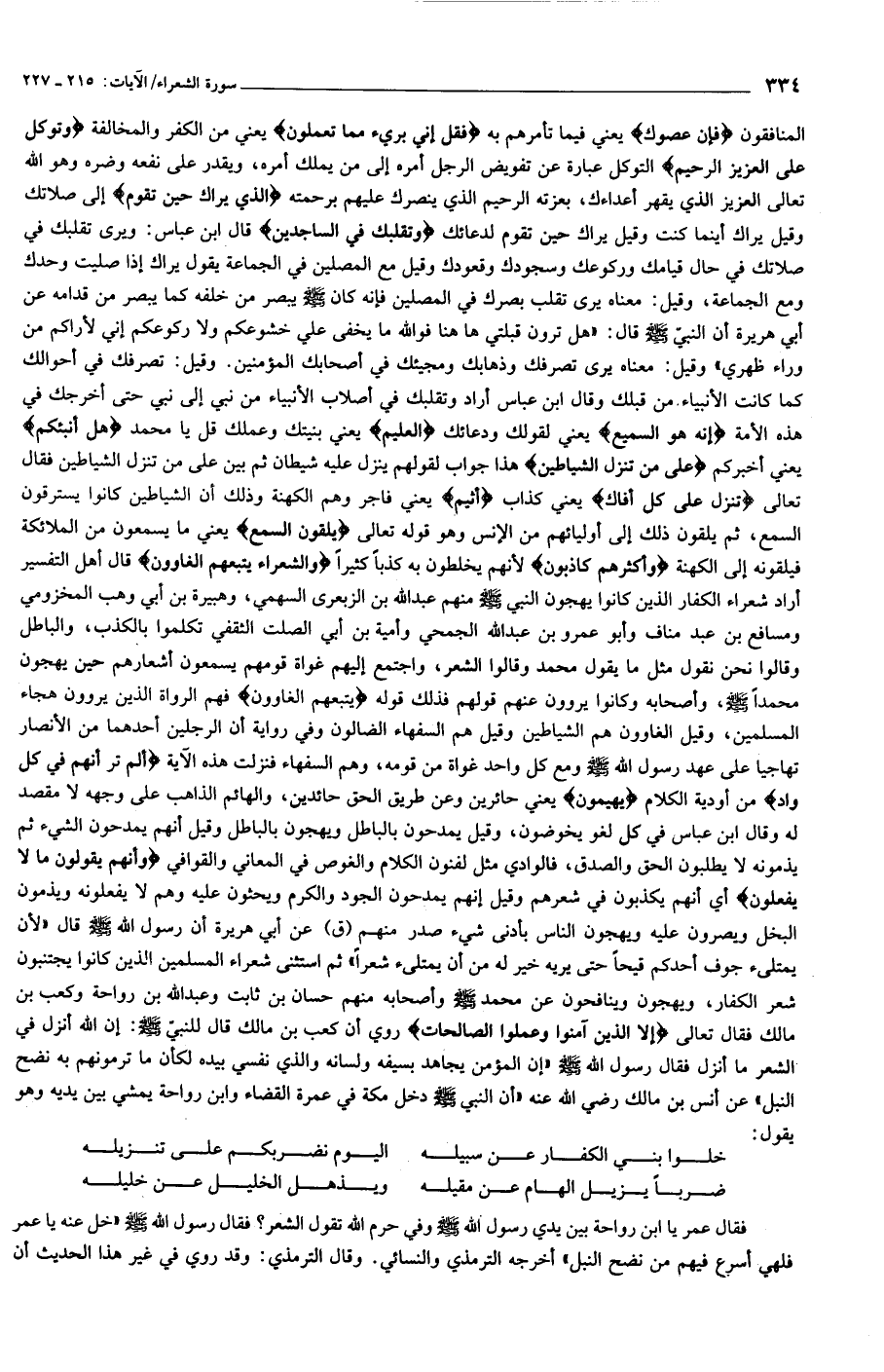 إلى صلاتك وقيل يراك أينما كنت وقيل يراك حين تقوم لدعائك وَتَقَلُّبَكَ فِي السَّاجِدِينَ قال ابن عباس: ويرى تقلبك في صلاتك في حال قيامك وركوعك وسجودك وقعودك وقيل مع المصلين في الجماعة يقول يراك إذا صليت وحدك ومع الجماعة، وقيل: معناه يرى تقلب بصرك في المصلين فإنه كان صلّى الله عليه وسلّم يبصر من خلفه كما يبصر من قدامه عن أبي هريرة أن النبيّ صلّى الله عليه وسلّم قال: «هل ترون قبلتي ها هنا فو الله ما يخفى علي خشوعكم ولا ركوعكم إني لأراكم من وراء ظهري» وقيل: معناه يرى تصرفك وذهابك ومجيئك في أصحابك المؤمنين. وقيل: تصرفك في أحوالك كما كانت الأنبياء من قبلك وقال ابن عباس أراد وتقلبك في أصلاب الأنبياء من نبي إلى نبي حتى أخرجك في هذه الأمة إِنَّهُ هُوَ السَّمِيعُ يعني لقولك ودعائك الْعَلِيمُ يعني بنيتك وعملك قل يا محمد هَلْ أُنَبِّئُكُمْ يعني أخبركم عَلى مَنْ تَنَزَّلُ الشَّياطِينُ هذا جواب لقولهم ينزل عليه شيطان ثم بين على من تنزل الشياطين فقال تعالى تَنَزَّلُ عَلى كُلِّ أَفَّاكٍ يعني كذاب أَثِيمٍ يعني فاجر وهم الكهنة وذلك أن الشياطين كانوا يسترقون السمع، ثم يلقون ذلك إلى أوليائهم من الإنس وهو قوله تعالى يُلْقُونَ السَّمْعَ يعني ما يسمعون من الملائكة فيلقونه إلى الكهنة وَأَكْثَرُهُمْ كاذِبُونَ لأنهم يخلطون به كذبا كثيرا وَالشُّعَراءُ يَتَّبِعُهُمُ الْغاوُونَ قال أهل التفسير أراد شعراء الكفار الذين كانوا يهجون النبي صلّى الله عليه وسلّم منهم عبد الله بن الزبعرى السهمي، وهبيرة بن أبي وهب المخزومي ومسافع بن عبد مناف وأبو عمرو بن عبد الله الجمحي وأمية بن أبي الصلت الثقفي تكلموا بالكذب، والباطل وقالوا نحن نقول مثل ما يقول محمد وقالوا الشعر، واجتمع إليهم غواة قومهم يسمعون أشعارهم حين يهجون محمدا صلّى الله عليه وسلّم، وأصحابه وكانوا يروون عنهم قولهم فذلك قوله يَتَّبِعُهُمُ الْغاوُونَ فهم الرواة الذين يروون هجاء المسلمين، وقيل الغاوون هم الشياطين وقيل هم السفهاء الضالون وفي رواية أن الرجلين أحدهما من الأنصار تهاجيا على عهد رسول الله صلّى الله عليه وسلّم ومع كل واحد غواة من قومه، وهم السفهاء فنزلت هذه الآية أَلَمْ تَرَ أَنَّهُمْ فِي كُلِّ وادٍ من أودية الكلام يَهِيمُونَ يعني حائرين وعن طريق الحق حائدين، والهائم الذاهب على وجهه لا مقصد له وقال ابن عباس في كل لغو يخوضون، وقيل يمدحون بالباطل ويهجون بالباطل وقيل أنهم يمدحون الشيء ثم يذمونه لا يطلبون الحق والصدق، فالوادي مثل لفنون الكلام والغوص في المعاني والقوافي وَأَنَّهُمْ يَقُولُونَ ما لا يَفْعَلُونَ أي أنهم يكذبون في شعرهم وقيل إنهم يمدحون الجود والكرم ويحثون عليه وهم لا يفعلونه ويذمون البخل ويصرون عليه ويهجون الناس بأدنى شيء صدر منهم (ق) عن أبي هريرة أن رسول الله صلّى الله عليه وسلّم قال «لأن يمتلئ جوف أحدكم قيحا حتى يريه خير له من أن يمتلئ شعرا» ثم استثنى شعراء المسلمين الذين كانوا يجتنبون شعر الكفار، ويهجون وينافحون عن محمد صلّى الله عليه وسلّم وأصحابه منهم حسان بن ثابت وعبد الله بن رواحة وكعب بن مالك فقال تعالى إِلَّا الَّذِينَ آمَنُوا وَعَمِلُوا الصَّالِحاتِ روي أن كعب بن مالك قال للنبيّ صلّى الله عليه وسلّم: إن الله أنزل في الشعر ما أنزل فقال رسول الله صلّى الله عليه وسلّم «إن المؤمن يجاهد بسيفه ولسانه والذي نفسي بيده لكأن ما ترمونهم به نضح النبل» عن أنس بن مالك رضي الله عنه «أن النبي صلّى الله عليه وسلّم دخل مكة في عمرة القضاء وابن رواحة يمشي بين يديه وهو يقول: