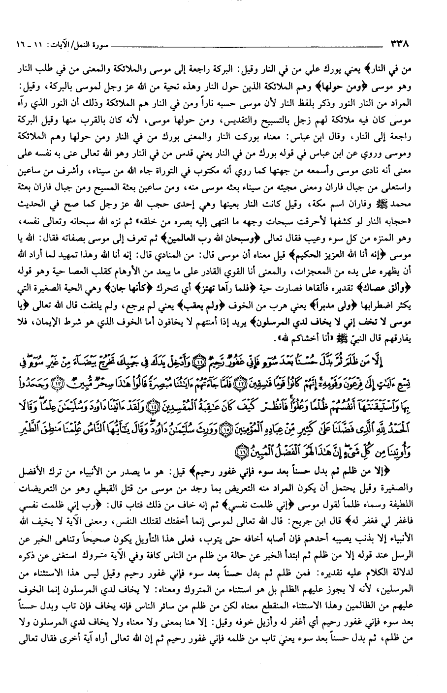 المراد من النار النور وذكر بلفظ النار لأن موسى حسبه نارا ومن في النار هم الملائكة وذلك أن النور الذي رآه موسى كان فيه ملائكة لهم زجل بالتسبيح والتقديس، ومن حولها موسى، لأنه كان بالقرب منها وقيل البركة راجعة إلى النار، وقال ابن عباس: معناه بوركت النار والمعنى بورك من في النار ومن حولها وهم الملائكة وموسى وروي عن ابن عباس في قوله بورك من في النار يعني قدس من في النار وهو الله تعالى عنى به نفسه على معنى أنه نادى موسى وأسمعه من جهتها كما روي أنه مكتوب في التوراة جاء الله من سيناء، وأشرف من ساعين واستعلى من جبال فاران ومعنى مجيئه من سيناء بعثه موسى منه، ومن ساعين بعثة المسيح ومن جبال فاران بعثة محمد صلّى الله عليه وسلّم وفاران اسم مكة، وقيل كانت النار بعينها وهي إحدى حجب الله عز وجل كما صح في الحديث «حجابه النار لو كشفها لأحرقت سبحات وجهه ما انتهى إليه بصره من خلقه» ثم نزه الله سبحانه وتعالى نفسه، وهو المنزه من كل سوء وعيب فقال تعالى وَسُبْحانَ اللَّهِ رَبِّ الْعالَمِينَ ثم تعرف إلى موسى بصفاته فقال: الله يا موسى إِنَّهُ أَنَا اللَّهُ الْعَزِيزُ الْحَكِيمُ قيل معناه أن موسى قال: من المنادي قال: إنه أنا الله وهذا تمهيد لما أراد الله أن يظهره على يده من المعجزات، والمعنى أنا القوي القادر على ما يبعد من الأوهام كقلب العصا حية وهو قوله وَأَلْقِ عَصاكَ تقديره فألقاها فصارت حية فَلَمَّا رَآها تَهْتَزُّ أي تتحرك كَأَنَّها جَانٌّ وهي الحية الصغيرة التي يكثر اضطرابها وَلَّى مُدْبِراً يعني هرب من الخوف وَلَمْ يُعَقِّبْ يعني لم يرجع، ولم يلتفت قال الله تعالى يا مُوسى لا تَخَفْ إِنِّي لا يَخافُ لَدَيَّ الْمُرْسَلُونَ يريد إذا أمنتهم لا يخافون أما الخوف الذي هو شرط الإيمان، فلا يفارقهم قال النبيّ صلّى الله عليه وسلّم «أنا أخشاكم لله».