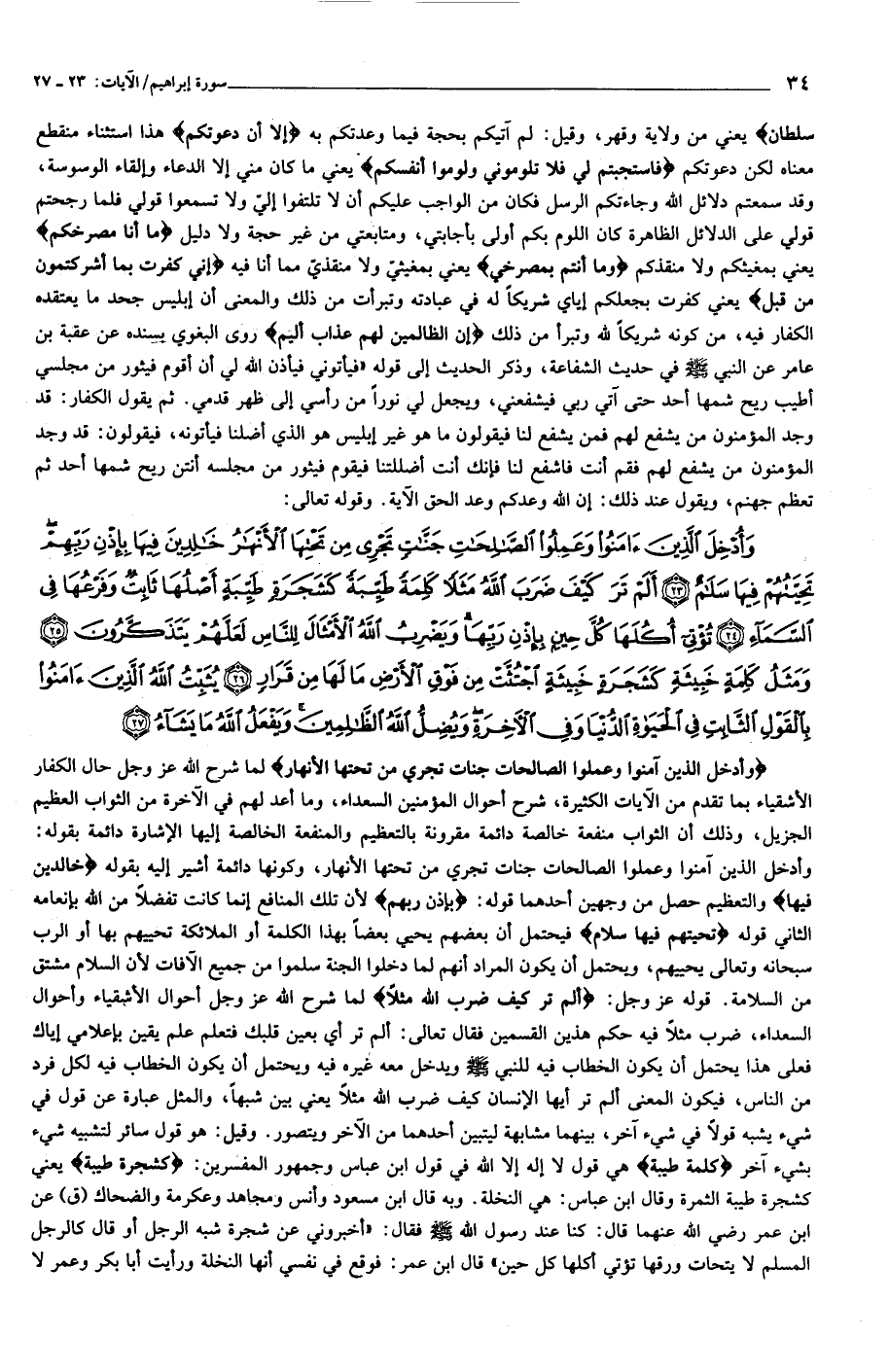 وَأُدْخِلَ الَّذِينَ آمَنُوا وَعَمِلُوا الصَّالِحاتِ جَنَّاتٍ تَجْرِي مِنْ تَحْتِهَا الْأَنْهارُ خالِدِينَ فِيها بِإِذْنِ رَبِّهِمْ تَحِيَّتُهُمْ فِيها سَلامٌ (23) أَلَمْ تَرَ كَيْفَ ضَرَبَ اللَّهُ مَثَلاً كَلِمَةً طَيِّبَةً كَشَجَرَةٍ طَيِّبَةٍ أَصْلُها ثابِتٌ وَفَرْعُها فِي السَّماءِ (24) تُؤْتِي أُكُلَها كُلَّ حِينٍ بِإِذْنِ رَبِّها وَيَضْرِبُ اللَّهُ الْأَمْثالَ لِلنَّاسِ لَعَلَّهُمْ يَتَذَكَّرُونَ (25) وَمَثَلُ كَلِمَةٍ خَبِيثَةٍ كَشَجَرَةٍ خَبِيثَةٍ اجْتُثَّتْ مِنْ فَوْقِ الْأَرْضِ ما لَها مِنْ قَرارٍ (26) يُثَبِّتُ اللَّهُ الَّذِينَ آمَنُوا بِالْقَوْلِ الثَّابِتِ فِي الْحَياةِ الدُّنْيا وَفِي الْآخِرَةِ وَيُضِلُّ اللَّهُ الظَّالِمِينَ وَيَفْعَلُ اللَّهُ ما يَشاءُ (27)