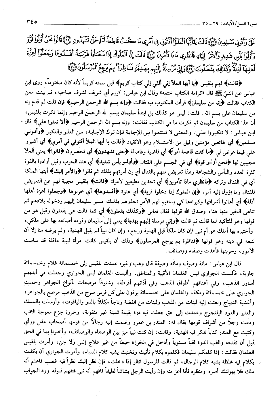 قالَتْ لهم بلقيس يا أَيُّهَا الْمَلَأُ إِنِّي أُلْقِيَ إِلَيَّ كِتابٌ كَرِيمٌ قيل سمته كريما لأنه كان مختوما، روى ابن عباس عن النبيّ صلّى الله عليه وسلّم قال «كرامة الكتاب ختمه» وقال ابن عباس: كريم أي شريف لشرف صاحبه، ثم بينت ممن الكتاب فقالت إِنَّهُ مِنْ سُلَيْمانَ قرأت المكتوب فيه فقالت وَإِنَّهُ بِسْمِ اللَّهِ الرَّحْمنِ الرَّحِيمِ فإن قلت لم قدم إنه من سليمان على بسم الله. قلت: ليس هو كذلك بل ابتدأ سليمان ببسم الله الرحمن الرحيم وإنما ذكرت بلقيس، أن هذا الكتاب من سليمان ثم ذكرت ما في الكتاب فقالت: وإنه بسم الله الرحمن الرحيم أَلَّا تَعْلُوا عَلَيَّ قال ابن عباس: لا تتكبروا علي. والمعنى لا تمتنعوا من الإجابة فإن ترك الإجابة، من العلو والتكبر وَأْتُونِي مُسْلِمِينَ أي طائعين مؤمنين وقيل من الاستسلام وهو الانقياد قالَتْ يا أَيُّهَا الْمَلَأُ أَفْتُونِي فِي أَمْرِي أي أشيروا علي فيما عرض لي ما كُنْتُ قاطِعَةً أَمْراً أي قاضية وفاصلة حَتَّى تَشْهَدُونِ أي تحضرون قالُوا يعني الملأ مجيبين لها نَحْنُ أُولُوا قُوَّةٍ أي في الجسم على القتال وَأُولُوا بَأْسٍ شَدِيدٍ أي عند الحرب وقيل أرادوا بالقوة كثرة العدد والبأس والشجاعة وهذا تعريض منهم بالقتال أي إن أمرتهم بذلك ثم قالوا وَالْأَمْرُ إِلَيْكِ أيتها الملكة أي في القتال وتركه فَانْظُرِي ماذا تَأْمُرِينَ أي تجدين مطيعين لأمرك قالَتْ بلقيس مجيبة لهم عن التعريض للقتال وما يؤول إليه أمره إِنَّ الْمُلُوكَ إِذا دَخَلُوا قَرْيَةً أي عنوة أَفْسَدُوها أي خربوها وَجَعَلُوا أَعِزَّةَ أَهْلِها أَذِلَّةً أي أهانوا أشرافها وكبراءها كي يستقيم لهم الأمر تحذرهم بذلك مسير سليمان إليهم ودخوله بلادهم ثم تناهى الخبر عنها هنا، وصدق الله قولها فقال تعالى وَكَذلِكَ يَفْعَلُونَ أي كما قالت هي يفعلون وقيل هو من قولها وهو للتأكيد لما قالت ثم قالت وَإِنِّي مُرْسِلَةٌ إِلَيْهِمْ بِهَدِيَّةٍ يعني إلى سليمان وقومه أصانعه بها على ملكي، وأختبره بها أملك هو أم نبي فإن كان ملكا قبل الهدية ورجع، وإن كان نبيا لم يقبل الهدية، ولم يرضه منا إلا أن نتبعه في دينه وهو قولها فَناظِرَةٌ بِمَ يَرْجِعُ الْمُرْسَلُونَ وذلك أن بلقيس كانت امرأة لبيبة عاقلة قد ساست الأمور، وجربتها فأهدت وصفاء ووصائف.
