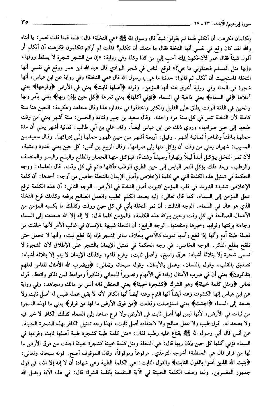يتكلمان فكرهت أن أتكلم فلما لم يقولوا شيئا قال رسول الله صلّى الله عليه وسلّم «هي النخلة» قال: فلما قمنا قلت لعمر: يا أبتاه والله لقد كان وقع في نفسي أنها النخلة فقال ما منعك أن تتكلم؟ فقلت لم أركم تتكلمون فكرهت أن أتكلم أو أقول شيئا فقال عمر لأن تكون قلته أحب إلي من كذا وكذا وفي رواية: «إن من الشجر شجرة لا يسقط ورقها، وإنها مثل المسلم فحدثوني ما هي؟» فوقع الناس في شجر البوادي قال عبد الله ابن عمر ووقع في نفسي أنها النخلة فاستحييت أن أتكلم ثم قالوا: حدثنا ما هي يا رسول الله قال «هي النخلة» وفي رواية عن ابن عباس، أنها شجرة في الجنة وفي رواية أخرى عنه أنها المؤمن. وقوله أَصْلُها ثابِتٌ يعني في الأرض وَفَرْعُها يعني أعلاها فِي السَّماءِ يعني ذاهبة في السماء تُؤْتِي أُكُلَها يعني ثمرها كُلَّ حِينٍ بِإِذْنِ رَبِّها يعني بأمر ربها والحين في اللغة الوقت يطلق على القليل والكثير واختلفوا في مقداره هذا وقال مجاهد وعكرمة: الحين هنا سنة كاملة لأن النخلة تثمر في كل سنة مرة واحدة. وقال سعيد بن جبير وقتادة والحسن: ستة أشهر يعني من وقت طلعها إلى حين صرامها، وروي ذلك عن ابن عباس أيضا. وقال علي بن أبي طالب: ثمانية أشهر يعني أن مدة حملها باطنا وظاهرا ثمانية أشهر. وقيل: أربعة أشهر من حين ظهور حملها إلى إدراكها. وقال سعيد بن المسيب: شهران يعني من وقت أن يؤكل منها إلى صرامها. وقال الربيع بن أنس: كل حين يعني غدوة وعشية، لأن ثمر النخل يؤكل أبدا ليلا ونهارا وصيفا وشتاء، فيؤكل منها الجمار والطلع والبلح والبسر والمنصف والرطب، وبعد ذلك يؤكل التمر اليابس إلى حين الطري الرطب فأكلها دائم في كل وقت. قال العلماء: ووجه الحكمة في تمثيل هذه الكلمة التي هي كلمة الإخلاص وأصل الإيمان بالنخلة حاصل من أوجه: أحدها: أن كلمة الإخلاص شديدة الثبوت في قلب المؤمن كثبوت أصل النخلة في الأرض. الوجه الثاني: أن هذه الكلمة ترفع عمل المؤمن إلى السماء. كما قال تعالى: إليه يصعد الكلم الطيب والعمل الصالح يرفعه وكذلك فرع النخلة الذي هو عال في السماء. الوجه الثالث: أن ثمر النخلة يأتي في كل حين ووقت وكذلك ما يكسبه المؤمن من الأعمال الصالحة في كل وقت وحين ببركة هذه الكلمة، فالمؤمن كلما قال: لا إله إلا الله صعدت إلى السماء وجاءته بركتها وثوابها وخيرها ومنفعتها. الوجه الرابع: أن النخلة شبيهة بالإنسان في غالب الأمر لأنها خلقت من