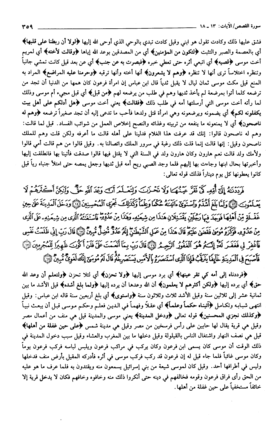 فَرَدَدْناهُ إِلى أُمِّهِ كَيْ تَقَرَّ عَيْنُها وَلا تَحْزَنَ وَلِتَعْلَمَ أَنَّ وَعْدَ اللَّهِ حَقٌّ وَلكِنَّ أَكْثَرَهُمْ لا يَعْلَمُونَ (13) وَلَمَّا بَلَغَ أَشُدَّهُ وَاسْتَوى آتَيْناهُ حُكْماً وَعِلْماً وَكَذلِكَ نَجْزِي الْمُحْسِنِينَ (14) وَدَخَلَ الْمَدِينَةَ عَلى حِينِ غَفْلَةٍ مِنْ أَهْلِها فَوَجَدَ فِيها رَجُلَيْنِ يَقْتَتِلانِ هذا مِنْ شِيعَتِهِ وَهذا مِنْ عَدُوِّهِ فَاسْتَغاثَهُ الَّذِي مِنْ شِيعَتِهِ عَلَى الَّذِي مِنْ عَدُوِّهِ فَوَكَزَهُ مُوسى فَقَضى عَلَيْهِ قالَ هذا مِنْ عَمَلِ الشَّيْطانِ إِنَّهُ عَدُوٌّ مُضِلٌّ مُبِينٌ (15) قالَ رَبِّ إِنِّي ظَلَمْتُ نَفْسِي فَاغْفِرْ لِي فَغَفَرَ لَهُ إِنَّهُ هُوَ الْغَفُورُ الرَّحِيمُ (16) قالَ رَبِّ بِما أَنْعَمْتَ عَلَيَّ فَلَنْ أَكُونَ ظَهِيراً لِلْمُجْرِمِينَ (17)