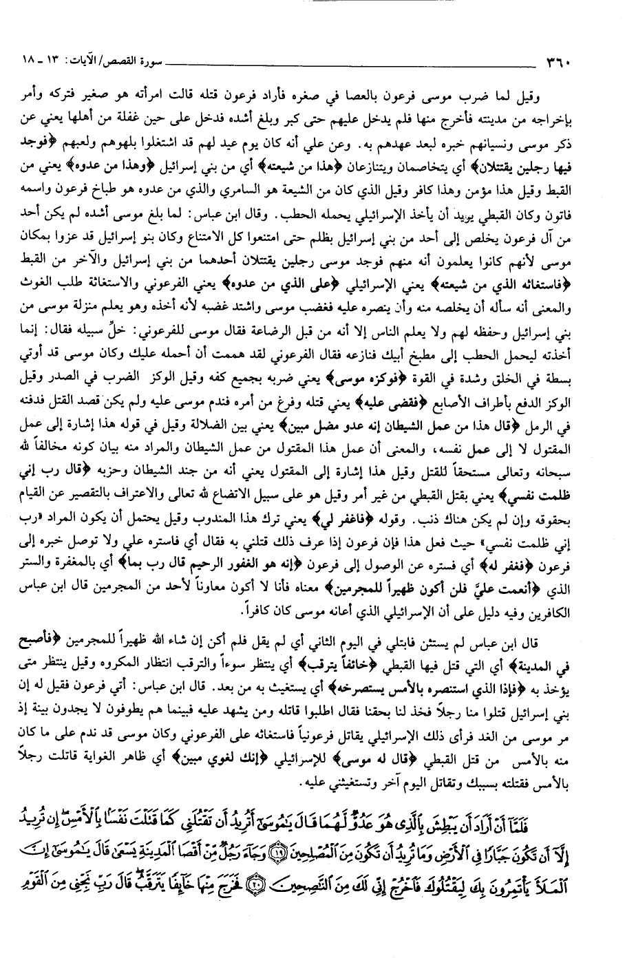 وقيل لما ضرب موسى فرعون بالعصا في صغره فأراد فرعون قتله قالت امرأته هو صغير فتركه وأمر بإخراجه من مدينته فأخرج منها فلم يدخل عليهم حتى كبر وبلغ أشده فدخل على حين غفلة من أهلها يعني عن ذكر موسى ونسيانهم خبره لبعد عهدهم به. وعن علي أنه كان يوم عيد لهم قد اشتغلوا بلهوهم ولعبهم فَوَجَدَ فِيها رَجُلَيْنِ يَقْتَتِلانِ أي يتخاصمان ويتنازعان هذا مِنْ شِيعَتِهِ أي من بني إسرائيل وَهذا مِنْ عَدُوِّهِ يعني من القبط وقيل هذا مؤمن وهذا كافر وقيل الذي كان من الشيعة هو السامري والذي من عدوه هو طباخ فرعون واسمه فاتون وكان القبطي يريد أن يأخذ الإسرائيلي يحمله الحطب. وقال ابن عباس: لما بلغ موسى أشده لم يكن أحد من آل فرعون يخلص إلى أحد من بني إسرائيل بظلم حتى امتنعوا كل الامتناع وكان بنو إسرائيل قد عزوا بمكان موسى لأنهم كانوا يعلمون أنه منهم فوجد موسى رجلين يقتتلان أحدهما من بني إسرائيل والآخر من القبط فَاسْتَغاثَهُ الَّذِي مِنْ شِيعَتِهِ يعني الإسرائيلي عَلَى الَّذِي مِنْ عَدُوِّهِ يعني الفرعوني والاستغاثة طلب الغوث والمعنى أنه سأله أن يخلصه منه وأن ينصره عليه فغضب موسى واشتد غضبه لأنه أخذه وهو يعلم منزلة موسى من بني إسرائيل وحفظه لهم ولا يعلم الناس إلا أنه من قبل الرضاعة فقال موسى للفرعوني: خلّ سبيله فقال: إنما أخذته ليحمل الحطب إلى مطبخ أبيك فنازعه فقال الفرعوني لقد هممت أن أحمله عليك وكان موسى قد أوتي بسطة في الخلق وشدة في القوة فَوَكَزَهُ مُوسى يعني ضربه بجميع كفه وقيل الوكز الضرب في الصدر وقيل الوكز الدفع بأطراف الأصابع فَقَضى عَلَيْهِ يعني قتله وفرغ من أمره فندم موسى عليه ولم يكن قصد القتل فدفنه في الرمل قالَ هذا مِنْ عَمَلِ الشَّيْطانِ إِنَّهُ عَدُوٌّ مُضِلٌّ مُبِينٌ يعني بين الضلالة وقيل في قوله هذا إشارة إلى عمل المقتول لا إلى عمل نفسه، والمعنى أن عمل هذا المقتول من عمل الشيطان والمراد منه بيان كونه مخالفا لله سبحانه وتعالى مستحقا للقتل وقيل هذا إشارة إلى المقتول يعني أنه من جند الشيطان وحزبه قالَ رَبِّ إِنِّي ظَلَمْتُ نَفْسِي يعني بقتل القبطي من غير أمر وقيل هو على سبيل الاتضاع لله تعالى والاعتراف بالتقصير عن القيام بحقوقه وإن لم يكن هناك ذنب. وقوله فَاغْفِرْ لِي يعني ترك هذا المندوب وقيل يحتمل أن يكون المراد «رب إني ظلمت نفسي» حيث فعل هذا فإن فرعون إذا عرف ذلك قتلني به فقال أي فاستره علي ولا توصل خبره إلى فرعون فَغَفَرَ لَهُ أي فستره عن الوصول إلى فرعون إِنَّهُ هُوَ الْغَفُورُ الرَّحِيمُ قالَ رَبِّ بِما أي بالمغفرة والستر الذي أَنْعَمْتَ عَلَيَّ فَلَنْ أَكُونَ ظَهِيراً لِلْمُجْرِمِينَ معناه فأنا لا أكون معاونا لأحد من المجرمين قال