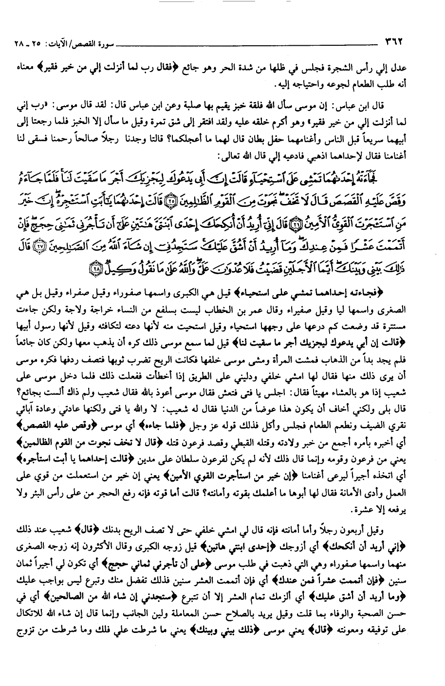 فَجاءَتْهُ إِحْداهُما تَمْشِي عَلَى اسْتِحْياءٍ قالَتْ إِنَّ أَبِي يَدْعُوكَ لِيَجْزِيَكَ أَجْرَ ما سَقَيْتَ لَنا فَلَمَّا جاءَهُ وَقَصَّ عَلَيْهِ الْقَصَصَ قالَ لا تَخَفْ نَجَوْتَ مِنَ الْقَوْمِ الظَّالِمِينَ (25) قالَتْ إِحْداهُما يا أَبَتِ اسْتَأْجِرْهُ إِنَّ خَيْرَ مَنِ اسْتَأْجَرْتَ الْقَوِيُّ الْأَمِينُ (26) قالَ إِنِّي أُرِيدُ أَنْ أُنْكِحَكَ إِحْدَى ابْنَتَيَّ هاتَيْنِ عَلى أَنْ تَأْجُرَنِي ثَمانِيَ حِجَجٍ فَإِنْ أَتْمَمْتَ عَشْراً فَمِنْ عِنْدِكَ وَما أُرِيدُ أَنْ أَشُقَّ عَلَيْكَ سَتَجِدُنِي إِنْ شاءَ اللَّهُ مِنَ الصَّالِحِينَ (27) قالَ ذلِكَ بَيْنِي وَبَيْنَكَ أَيَّمَا الْأَجَلَيْنِ قَضَيْتُ فَلا عُدْوانَ عَلَيَّ وَاللَّهُ عَلى ما نَقُولُ وَكِيلٌ (28)