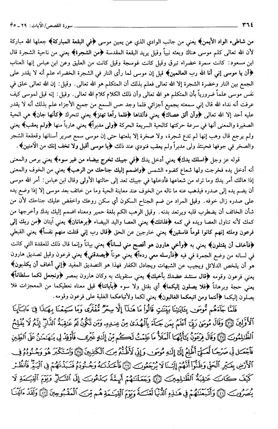 مِنْ شاطِئِ الْوادِ الْأَيْمَنِ يعني من جانب الوادي الذي عن يمين موسى فِي الْبُقْعَةِ الْمُبارَكَةِ جعلها الله مباركة لأن الله تعالى كلم موسى هناك وبعثه نبيا وقيل يريد البقعة المقدسة مِنَ الشَّجَرَةِ يعني من ناحية الشجرة قال ابن مسعود: كانت سمرة خضراء تبرق وقيل كانت عوسجة وقيل كانت من العليق وعن ابن عباس إنها العناب أَنْ يا مُوسى إِنِّي أَنَا اللَّهُ رَبُّ الْعالَمِينَ قيل إن موسى لما رأى النار في الشجرة الخضراء علم أنه لا يقدر على الجمع بين النار وخضرة الشجرة إلا الله تعالى فعلم بذلك أن المتكلم هو الله تعالى. وقيل: إن الله تعالى خلق في نفس موسى علما ضروريا بأن المتكلم هو الله تعالى وأن ذلك الكلام كلام الله تعالى. وقيل: إنه قيل لموسى كيف عرفت أنه نداء الله قال إني سمعته بجميع أجزائي فلما وجد حس السمع من جميع الأجزاء علم بذلك أنه لا يقدر عليه أحد إلا الله تعالى وَأَنْ أَلْقِ عَصاكَ يعني فألقاها فَلَمَّا رَآها تَهْتَزُّ يعني تتحرك كَأَنَّها جَانٌّ هي الحية الصغيرة والمعنى أنها في سرعة حركتها كالحية السريعة الحركة وَلَّى مُدْبِراً يعني هاربا منها وَلَمْ يُعَقِّبْ يعني ولم يرجع قال وهب إنها لم تدع شجرة، ولا صخرة إلا بلعتها حتى إن موسى سمع صرير أسنانها وقعقعة الشجر والصخر في جوفها فحينئذ ولى مدبرا ولم يعقب فنودي عند ذلك يا مُوسى أَقْبِلْ وَلا تَخَفْ إِنَّكَ مِنَ الْآمِنِينَ.