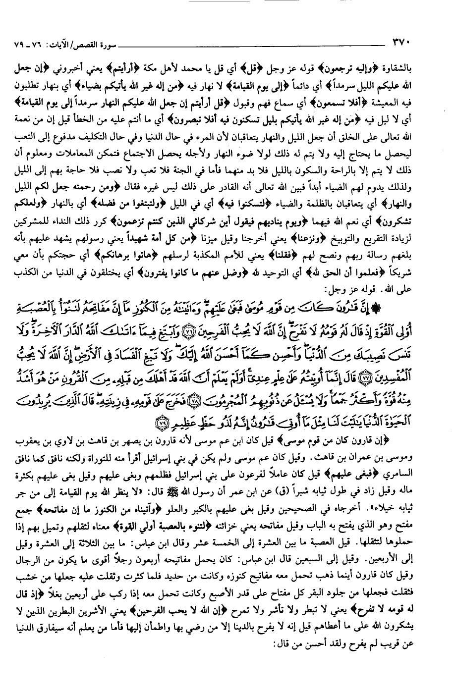 إِنَّ قارُونَ كانَ مِنْ قَوْمِ مُوسى فَبَغى عَلَيْهِمْ وَآتَيْناهُ مِنَ الْكُنُوزِ ما إِنَّ مَفاتِحَهُ لَتَنُوأُ بِالْعُصْبَةِ أُولِي الْقُوَّةِ إِذْ قالَ لَهُ قَوْمُهُ لا تَفْرَحْ إِنَّ اللَّهَ لا يُحِبُّ الْفَرِحِينَ (76) وَابْتَغِ فِيما آتاكَ اللَّهُ الدَّارَ الْآخِرَةَ وَلا تَنْسَ نَصِيبَكَ مِنَ الدُّنْيا وَأَحْسِنْ كَما أَحْسَنَ اللَّهُ إِلَيْكَ وَلا تَبْغِ الْفَسادَ فِي الْأَرْضِ إِنَّ اللَّهَ لا يُحِبُّ الْمُفْسِدِينَ (77) قالَ إِنَّما أُوتِيتُهُ عَلى عِلْمٍ عِنْدِي أَوَلَمْ يَعْلَمْ أَنَّ اللَّهَ قَدْ أَهْلَكَ مِنْ قَبْلِهِ مِنَ الْقُرُونِ مَنْ هُوَ أَشَدُّ مِنْهُ قُوَّةً وَأَكْثَرُ جَمْعاً وَلا يُسْئَلُ عَنْ ذُنُوبِهِمُ الْمُجْرِمُونَ (78) فَخَرَجَ عَلى قَوْمِهِ فِي زِينَتِهِ قالَ الَّذِينَ يُرِيدُونَ الْحَياةَ الدُّنْيا يا لَيْتَ لَنا مِثْلَ ما أُوتِيَ قارُونُ إِنَّهُ لَذُو حَظٍّ عَظِيمٍ (79)