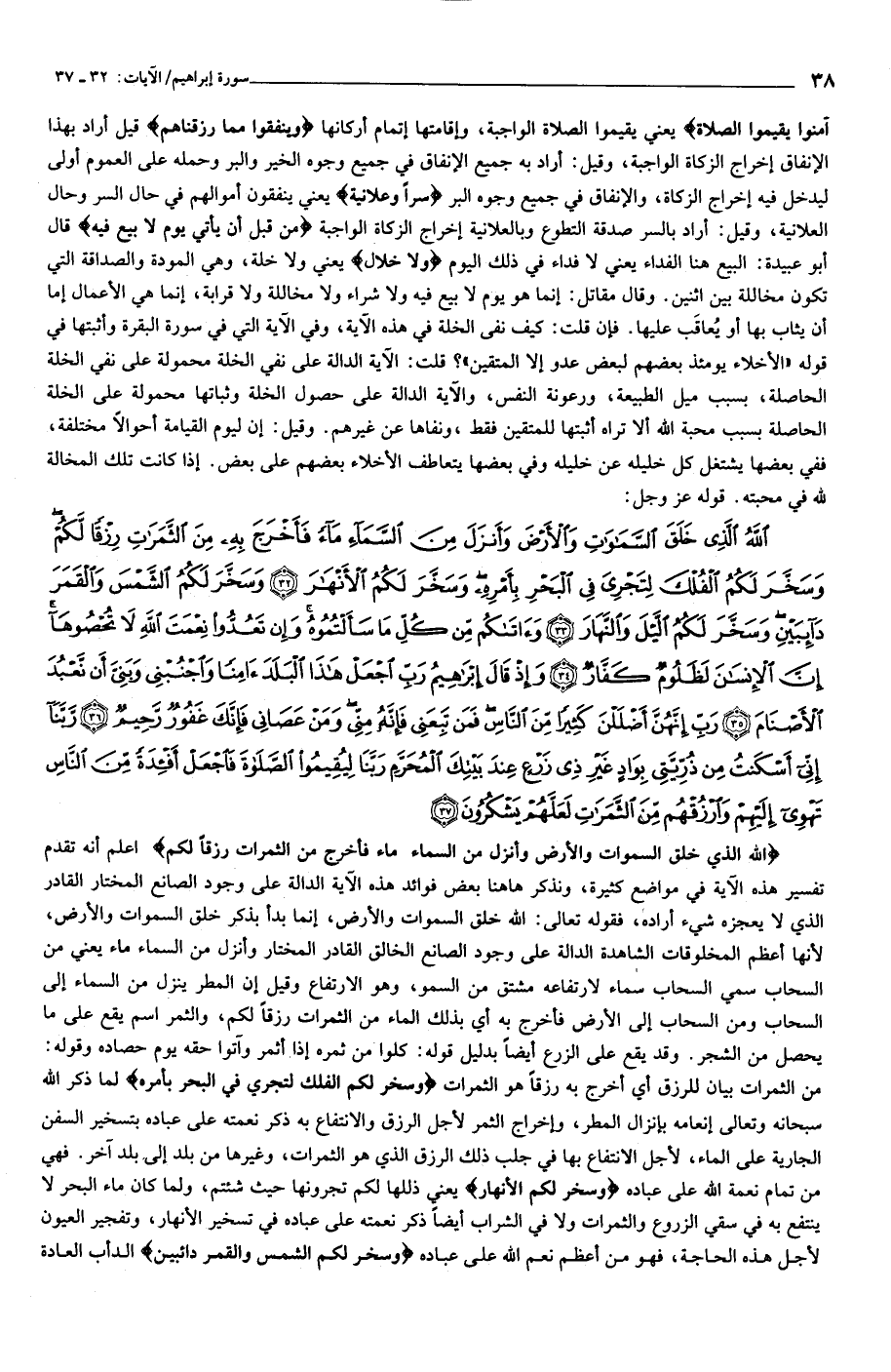 اللَّهُ الَّذِي خَلَقَ السَّماواتِ وَالْأَرْضَ وَأَنْزَلَ مِنَ السَّماءِ ماءً فَأَخْرَجَ بِهِ مِنَ الثَّمَراتِ رِزْقاً لَكُمْ وَسَخَّرَ لَكُمُ الْفُلْكَ لِتَجْرِيَ فِي الْبَحْرِ بِأَمْرِهِ وَسَخَّرَ لَكُمُ الْأَنْهارَ (32) وَسَخَّرَ لَكُمُ الشَّمْسَ وَالْقَمَرَ دائِبَيْنِ وَسَخَّرَ لَكُمُ اللَّيْلَ وَالنَّهارَ (33) وَآتاكُمْ مِنْ كُلِّ ما سَأَلْتُمُوهُ وَإِنْ تَعُدُّوا نِعْمَتَ اللَّهِ لا تُحْصُوها إِنَّ الْإِنْسانَ لَظَلُومٌ كَفَّارٌ (34) وَإِذْ قالَ إِبْراهِيمُ رَبِّ اجْعَلْ هَذَا الْبَلَدَ آمِناً وَاجْنُبْنِي وَبَنِيَّ أَنْ نَعْبُدَ الْأَصْنامَ (35) رَبِّ إِنَّهُنَّ أَضْلَلْنَ كَثِيراً مِنَ النَّاسِ فَمَنْ تَبِعَنِي فَإِنَّهُ مِنِّي وَمَنْ عَصانِي فَإِنَّكَ غَفُورٌ رَحِيمٌ (36)