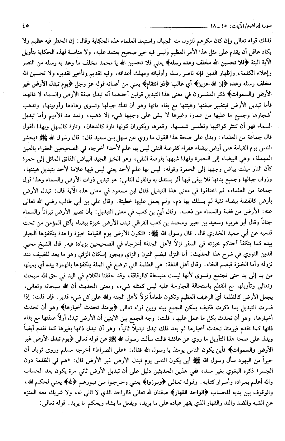 وأما تبديل السماء فهو أن تنتثر كواكبها وتطمس شمسها، وقمرها ويكوران كونها تارة كالدهان، وتارة كالمهل وبهذا القول قال جماعة من العلماء: ويدل على صحة هذا القول ما روي عن سهل بن سعيد قال: قال رسول الله صلّى الله عليه وسلّم «يحشر الناس يوم القيامة على أرض بيضاء عفراء كقرصة النقي ليس بها علم لأحد» أخرجاه في الصحيحين العفراء بالعين المهملة، وهي البيضاء إلى الحمرة ولهذا شبهها بقرصة النقي، وهو الخبز الجيد البياض الفائق المائل إلى حمرة كأن النار ميلت بياض وجهها إلى الحمرة وقوله: ليس بها علم لأحد يعني ليس فيها علامة لأحد بتبديل هيئتها، وزوال جبالها وجميع بنائها فلا يبقى فيها أثر يستدل به والقول الثاني: هو تبديل ذوات الأرض والسماء وهذا قول جماعة من العلماء، ثم اختلفوا في معنى هذا التبديل فقال ابن مسعود في معنى هذه الآية قال: تبدل الأرض بأرض كالفضة بيضاء نقية لم يسفك بها دم، ولم يعمل عليها خطيئة. وقال علي بن أبي طالب رضي الله تعالى عنه: الأرض من فضة والسماء من ذهب. وقال أبيّ بن كعب في معنى التبديل: بأن تصير الأرض نيرانا والسماء جنانا وقال أبو هريرة وسعيد بن جبير ومحمد بن كعب القرظي تبدل الأرض خبزة بيضاء يأكل المؤمن من تحت قدميه عن أبي سعيد الخدري قال. قال رسول الله صلّى الله عليه وسلّم: «تكون الأرض يوم القيامة خبزة واحدة يتكفؤها الجبار بيده كما يتكفأ أحدكم خبزته في السفر نزلا لأهل الجنة» أخرجاه في الصحيحين بزيادة فيه. قال الشيخ محيي الدين النووي في شرح هذا الحديث: أما النزل فبضم النون والزاي ويجوز إسكان الزاي وهو ما يعد للضيف عند نزوله وأما الخبزة فبضم الخاء. وقال أهل اللغة: هي الظلمة التي توضع في الملة يتكفؤها بالهمزة بيده أي يميلها من يد إلى يد حتى تجتمع وتسوى لأنها ليست منبسطة كالرقاقة، وقد حققنا الكلام في اليد في حق الله سبحانه وتعالى وتأويلها مع القطع باستحالة الجارحة عليه ليس كمثله شيء، ومعنى الحديث أن الله سبحانه وتعالى، يجعل الأرض كالظلمة أي الرغيف العظيم وتكون طعاما نزلا لأهل الجنة والله على كل شيء قدير. فإن قلت: إذا فسرت التبديل بما ذكرت فكيف يمكن الجمع بينه وبين قوله تعالى يَوْمَئِذٍ تُحَدِّثُ أَخْبارَها وهو أن تحدث أخبارها، وهو أن تحدث بكل ما عمل عليها، قلت: وجه الجمع بين الآيتين أن الأرض تبدل أولا صفتها مع بقاء ذاتها كما تقدم فيومئذ تحدث أخبارها ثم بعد ذلك تبدل تبديلا ثانيا، وهو أن تبدل ذاتها بغيرها كما تقدم أيضا ويدل على صحة هذا التأويل ما روي عن عائشة قالت سألت رسول الله صلّى الله عليه وسلّم عن قوله تعالى يَوْمَ تُبَدَّلُ الْأَرْضُ غَيْرَ الْأَرْضِ وَالسَّماواتُ فأين يكون الناس يومئذ يا رسول الله فقال: «على الصراط» أخرجه مسلم وروى ثوبان أن حبرا من اليهود سأل رسول الله صلّى الله عليه وسلّم أين يكون الناس يوم تبدل الأرض غير الأرض قال: «هم في الظلمة دون الجسر» ذكره البغوي بغير سند، ففي هذين الحديثين دليل على أن تبديل الأرض ثاني مرة يكون بعد الحساب والله أعلم بمراده وأسرار كتابه. وقوله تعالى وَبَرَزُوا يعني وخرجوا من قبورهم لِلَّهِ يعني لحكم الله، والوقوف بين يديه للحساب الْواحِدِ الْقَهَّارِ صفتان لله تعالى فالواحد الذي لا ثاني له، ولا شريك معه المنزه عن الشبه والضد والند والقهار الذي يقهر عباده على ما يريد، ويفعل ما يشاء ويحكم ما يريد. قوله تعالى: