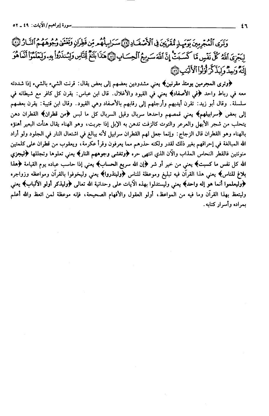 وَتَرَى الْمُجْرِمِينَ يَوْمَئِذٍ مُقَرَّنِينَ فِي الْأَصْفادِ (49) سَرابِيلُهُمْ مِنْ قَطِرانٍ وَتَغْشى وُجُوهَهُمُ النَّارُ (50) لِيَجْزِيَ اللَّهُ كُلَّ نَفْسٍ ما كَسَبَتْ إِنَّ اللَّهَ سَرِيعُ الْحِسابِ (51) هذا بَلاغٌ لِلنَّاسِ وَلِيُنْذَرُوا بِهِ وَلِيَعْلَمُوا أَنَّما هُوَ إِلهٌ واحِدٌ وَلِيَذَّكَّرَ أُولُوا الْأَلْبابِ (52)