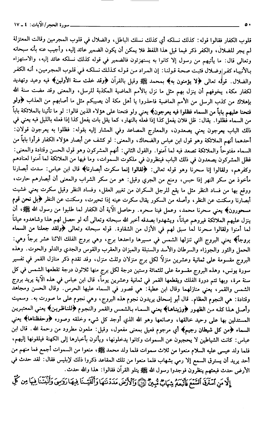 فظل المشركون يصعدون في ذلك الباب فينظرون في ملكوت السموات، وما فيها من الملائكة لما آمنوا لعنادهم وكفرهم، ولقالوا إنا سحرنا وهو قوله تعالى: لَقالُوا إِنَّما سُكِّرَتْ أَبْصارُنا قال ابن عباس: سدت أبصارنا مأخوذ من سكر النهر إذا حبس، ومنع من الجري وقيل: هو من سكر الشراب والمعنى أن أبصارهم حارت، ووقع بها من فساد النظر مثل ما يقع للرجل السكران من تغيير العقل، وفساد النظر وقيل سكرت يعني غشيت أبصارنا وسكنت عن النظر، وأصله من السكور يقال سكرت عينه إذا تحيرت، وسكنت عن النظر بَلْ نَحْنُ قَوْمٌ مَسْحُورُونَ يعني سحرنا محمد، وعمل فينا سحره. وحاصل الآية أن الكفار لما طلبوا من رسول الله صلّى الله عليه وسلّم، أن ينزل عليهم الملائكة فيروهم عيانا، ويشهدوا بصدقه أخبر الله سبحانه وتعالى أنه لو حصل لهم هذا وشاهدوه عيانا لما أمنوا ولقالوا سحرنا لما سبق لهم في الأزل من الشقاوة. قوله سبحانه وتعالى وَلَقَدْ جَعَلْنا فِي السَّماءِ بُرُوجاً يعني البروج التي تنزلها الشمس في مسيرها واحدها برج، وهي بروج الفلك الاثنا عشر برجا وهي: