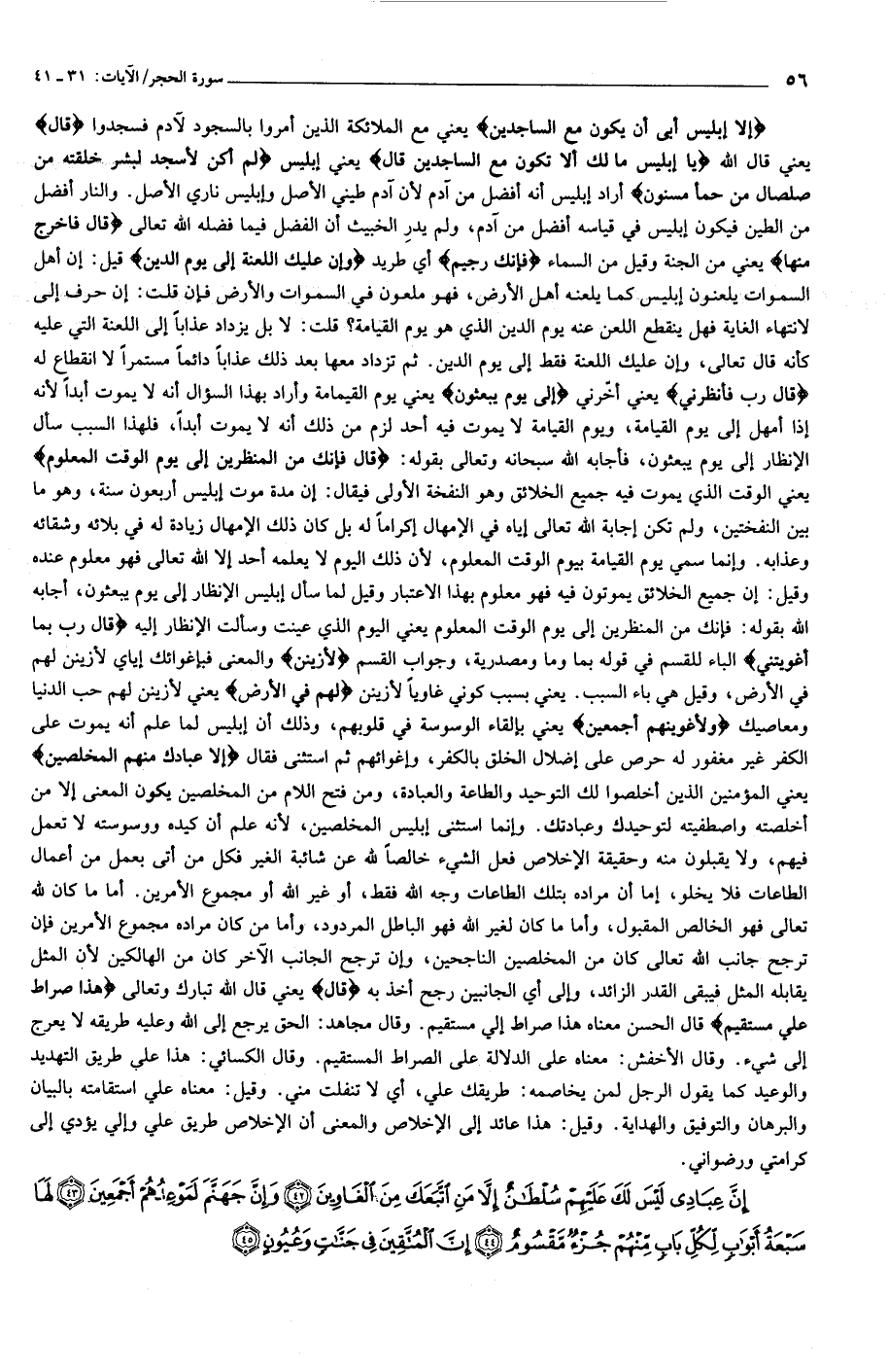 إِلَّا إِبْلِيسَ أَبى أَنْ يَكُونَ مَعَ السَّاجِدِينَ يعني مع الملائكة الذين أمروا بالسجود لآدم فسجدوا قالَ يعني قال الله يا إِبْلِيسُ ما لَكَ أَلَّا تَكُونَ مَعَ السَّاجِدِينَ قالَ يعني إبليس لَمْ أَكُنْ لِأَسْجُدَ لِبَشَرٍ خَلَقْتَهُ مِنْ صَلْصالٍ مِنْ حَمَإٍ مَسْنُونٍ أراد إبليس أنه أفضل من آدم لأن آدم طيني الأصل وإبليس ناري الأصل. والنار أفضل من الطين فيكون إبليس في قياسه أفضل من آدم، ولم يدر الخبيث أن الفضل فيما فضله الله تعالى قالَ فَاخْرُجْ مِنْها يعني من الجنة وقيل من السماء فَإِنَّكَ رَجِيمٌ أي طريد وَإِنَّ عَلَيْكَ اللَّعْنَةَ إِلى يَوْمِ الدِّينِ قيل: إن أهل السموات يلعنون إبليس كما يلعنه أهل الأرض، فهو ملعون في السموات والأرض فإن قلت: إن حرف إلى لانتهاء الغاية فهل ينقطع اللعن عنه يوم الدين الذي هو يوم القيامة؟ قلت: لا بل يزداد عذابا إلى اللعنة التي عليه كأنه قال تعالى، وإن عليك اللعنة فقط إلى يوم الدين. ثم تزداد معها بعد ذلك عذابا دائما مستمرا لا انقطاع له قالَ رَبِّ فَأَنْظِرْنِي يعني أخّرني إِلى يَوْمِ يُبْعَثُونَ يعني يوم القيامة وأراد بهذا السؤال أنه لا يموت أبدا لأنه إذا أمهل إلى يوم القيامة، ويوم القيامة لا يموت فيه أحد لزم من ذلك أنه لا يموت أبدا، فلهذا السبب سأل الإنظار إلى يوم يبعثون، فأجابه الله سبحانه وتعالى بقوله: قالَ فَإِنَّكَ مِنَ الْمُنْظَرِينَ إِلى يَوْمِ الْوَقْتِ الْمَعْلُومِ يعني الوقت الذي يموت فيه جميع الخلائق وهو النفخة الأولى فيقال: إن مدة موت إبليس أربعون سنة، وهو ما بين النفختين، ولم تكن إجابة الله تعالى إياه في الإمهال إكراما له بل كان ذلك الإمهال زيادة له في بلائه وشقائه وعذابه. وإنما سمي يوم القيامة بيوم الوقت المعلوم، لأن ذلك اليوم لا يعلمه أحد إلا الله تعالى فهو معلوم عنده وقيل: إن جميع الخلائق يموتون فيه فهو معلوم بهذا الاعتبار وقيل لما سأل إبليس الإنظار إلى يوم يبعثون، أجابه الله بقوله: فإنك من المنظرين إلى يوم الوقت المعلوم يعني اليوم الذي عينت وسألت الإنظار إليه قالَ رَبِّ بِما أَغْوَيْتَنِي الباء للقسم في قوله بما وما ومصدرية، وجواب القسم لَأُزَيِّنَنَّ والمعنى فبإغوائك إياي لأزينن لهم في الأرض، وقيل هي باء السبب. يعني بسبب كوني غاويا لأزينن لَهُمْ فِي الْأَرْضِ يعني لأزينن لهم حب الدنيا ومعاصيك وَلَأُغْوِيَنَّهُمْ أَجْمَعِينَ يعني بإلقاء الوسوسة في قلوبهم، وذلك أن إبليس لما علم أنه يموت على الكفر غير مغفور له حرص على إضلال الخلق بالكفر، وإغوائهم ثم استثنى فقال إِلَّا عِبادَكَ مِنْهُمُ الْمُخْلَصِينَ يعني المؤمنين الذين أخلصوا لك التوحيد والطاعة والعبادة، ومن فتح اللام من المخلصين يكون المعنى إلا من أخلصته واصطفيته لتوحيدك وعبادتك. وإنما استثنى إبليس المخلصين، لأنه علم أن كيده ووسوسته لا تعمل فيهم، ولا يقبلون منه وحقيقة الإخلاص فعل الشيء خالصا لله عن شائبة الغير فكل من أتى بعمل من أعمال الطاعات فلا يخلو، إما أن مراده بتلك الطاعات وجه الله فقط، أو غير الله أو مجموع الأمرين. أما ما كان لله تعالى فهو الخالص المقبول، وأما ما كان لغير الله فهو الباطل المردود، وأما من كان مراده مجموع الأمرين فإن ترجح جانب الله تعالى كان من المخلصين الناجحين، وإن ترجح الجانب الآخر كان من الهالكين لأن المثل يقابله المثل فيبقى القدر الزائد، وإلى أي الجانبين رجح أخذ به قالَ يعني قال الله تبارك وتعالى هذا صِراطٌ عَلَيَّ مُسْتَقِيمٌ قال الحسن معناه هذا صراط إلي مستقيم. وقال مجاهد: الحق يرجع إلى الله وعليه طريقه لا يعرج إلى شيء. وقال الأخفش: معناه على الدلالة على الصراط المستقيم. وقال الكسائي: هذا على طريق التهديد والوعيد كما يقول الرجل لمن يخاصمه: طريقك علي، أي لا تنفلت مني. وقيل: معناه علي استقامته بالبيان والبرهان والتوفيق والهداية. وقيل: هذا عائد إلى الإخلاص والمعنى أن الإخلاص طريق علي وإلي يؤدي إلى كرامتي ورضواني.