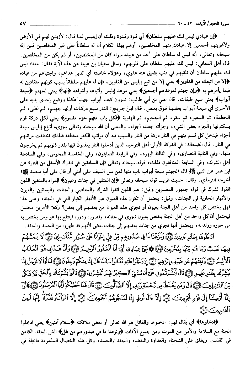 قال أهل المعاني: ليس لك عليهم سلطان على قلوبهم، وسئل سفيان بن عيينة عن هذه الآية فقال: معناه ليس لك عليهم سلطان أن تلقيهم في ذنب يضيق عنه عفوي، وهؤلاء خاصته أي الذين هداهم، واجتباهم من عباده إِلَّا مَنِ اتَّبَعَكَ مِنَ الْغاوِينَ يعني إلا من اتبع إبليس من الغاوين، فإن له عليهم سلطانا بسبب كونهم منقادين له فيما يأمرهم به وَإِنَّ جَهَنَّمَ لَمَوْعِدُهُمْ أَجْمَعِينَ يعني موعد إبليس وأتباعه وأشياعه لَها يعني لجهنم سَبْعَةُ أَبْوابٍ يعني سبع طبقات. قال علي بن أبي طالب: تدرون كيف أبواب جهنم هكذا ووضع إحدى يديه على الأخرى أي سبعة أبواب بعضها فوق بعض. قال ابن جريج: النار سبع دركات أولها جهنم، ثم لظى، ثم الحطمة، ثم السعير، ثم سقر، ثم الجحيم، ثم الهاوية لِكُلِّ بابٍ مِنْهُمْ جُزْءٌ مَقْسُومٌ يعني لكل دركة قوم يسكنونها والجزء بعض الشيء، وجزأته جعلته أجزاء، والمعنى أن الله سبحانه وتعالى يجزئ أتباع إبليس سبعة أجزاء فيدخل كل قسم منهم في النار دركة من النار والسبب فيه أن مراتب الكفر مختلفة فلذلك اختلفت مراتبهم في النار. قال الضحاك: في الدركة الأولى أهل التوحيد الذين أدخلوا النار يعذبون فيها بقدر ذنوبهم ثم يخرجون منها، وفي الثانية النصارى، وفي الثالثة اليهود، وفي الرابعة الصابئون، وفي الخامسة المجوس، وفي السادسة أهل الشرك، وفي السابعة المنافقون فذلك، قوله سبحانه وتعالى «إن المنافقين في الدرك الأسفل من النار» عن ابن عمر عن النبي صلّى الله عليه وسلّم قال «لجهنم سبعة أبواب باب منها لمن سل السيف على أمتي أو قال على أمة محمد صلّى الله عليه وسلّم» أخرجه الترمذي. وقال: حديث غريب قوله سبحانه وتعالى إِنَّ الْمُتَّقِينَ فِي جَنَّاتٍ وَعُيُونٍ المراد بالمتقين الذين اتقوا الشرك في قول جمهور المفسرين وقيل: هم الذين اتقوا الشرك والمعاصي والجنات والبساتين والعيون والأنهار الجارية في الجنات، وقيل: يحتمل أن تكون هذه العيون غير الأنهار الكبار التي في الجنة، وعلى هذا فهل يختص كل واحد من أهل الجنة بعيون أو تجري هذه العيون من بعضهم إلى بعض؟ وكلا الأمرين محتمل فيحتمل أن كل واحد من أهل الجنة يختص بعيون تجري في جناته، وقصوره ودوره فينتفع بها هو ومن يختص به من حوره وولدانه، ويحتمل أنها تجري من جنات بعضهم إلى جنات بعض لأنهم قد طهروا من الحسد والحقد.