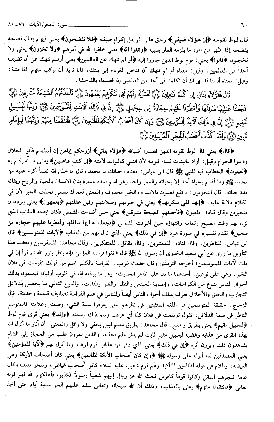 قالَ يعني قال لوط لقومه الذين قصدوا أضيافه هؤُلاءِ بَناتِي أزوجكم إياهن إن أسلمتم فأتوا الحلال ودعوا الحرام وقيل: أراد بالبنات نساء قومه لأن النبي كالوالد لأمته إِنْ كُنْتُمْ فاعِلِينَ يعني ما آمركم به لَعَمْرُكَ الخطاب فيه للنبي صلّى الله عليه وسلّم قال ابن عباس: معناه وحياتك يا محمد وقال ما خلق الله نفسا أكرم عليه من محمد صلّى الله عليه وسلّم وما أقسم بحياة أحد إلا بحياته والعمر واحد وهو اسم لمدة عمارة بدن الإنسان بالحياة والروح وبقائه مدة حياته. قال النحويون: ارتفع لعمرك بالابتداء والخبر محذوف والمعنى لعمرك قسمي فحذف الخبر لأن في الكلام دلالة عليه. إِنَّهُمْ لَفِي سَكْرَتِهِمْ يعني في حيرتهم وضلالتهم وقيل غفلتهم يَعْمَهُونَ يعني يترددون متحيرين وقال قتادة: يلعبون فَأَخَذَتْهُمُ الصَّيْحَةُ مُشْرِقِينَ يعني حين أضاءت الشمس فكان ابتداء العذاب الذي نزل بهم وقت الصبح وتمامه وانتهاؤه حين أشرقت الشمس فَجَعَلْنا عالِيَها سافِلَها وَأَمْطَرْنا عَلَيْهِمْ حِجارَةً مِنْ سِجِّيلٍ تقدم تفسيره في سورة هود إِنَّ فِي ذلِكَ يعني الذي نزل بهم من العذاب لَآياتٍ لِلْمُتَوَسِّمِينَ قال ابن عباس: للناظرين. وقال قتادة: للمعتبرين. وقال مقاتل: للمتفكرين. وقال مجاهد: للمتفرسين ويعضد هذا التأويل ما روي عن أبي سعيد الخدري أن رسول الله صلّى الله عليه وسلّم قال «اتقوا فراسة المؤمن فإنه ينظر بنور الله ثم قرأ إن في ذلك لآيات للمتوسمين» أخرجه الترمذي وقال حديث غريب. الفراسة بالكسر اسم من قولك تفرست في فلان الخير. وهي على نوعين: أحدهما ما دل عليه ظاهر الحديث، وهو ما يوقعه الله في قلوب أوليائه فيعلمون بذلك أحوال الناس بنوع من الكرامات، وإصابة الحدس والنظر والظن والتثبت، والنوع الثاني ما يحصل بدلائل التجارب والخلق والأخلاق تعرف بذلك أحوال الناس أيضا وللناس في علم الفراسة تصانيف قديمة وحديثة. قال الزجاج: حقيقة المتوسمين في اللغة المتثبتين في نظرهم حتى يعرفوا سمة الشيء وصفته وعلامته فالمتوسم الناظر في سمة الدلائل، تقول توسمت في فلان كذا أي عرفت وسم ذلك وسمته وَإِنَّها يعني قرى قوم لوط لَبِسَبِيلٍ مُقِيمٍ يعني بطريق واضح. قال مجاهد: بطريق معلم ليس بخفي ولا زائل والمعنى: أن آثار ما أنزل الله بهذه القرى من عذابه وغضبه لبسبيل مقيم ثابت لم يدثر ولم يخف، والذين يمرون عليها من الحجاز إلى الشام يشاهدون ذلك ويرون أثره إِنَّ فِي ذلِكَ يعني الذي ذكر من عذاب قوم لوط، وما أنزل بهم لَآيَةً لِلْمُؤْمِنِينَ يعني المصدقين لما أنزله على رسوله صلّى الله عليه وسلّم وَإِنْ كانَ أَصْحابُ الْأَيْكَةِ لَظالِمِينَ يعني كان أصحاب الأيكة وهي الغيضة، واللام في قوله لظالمين للتأكيد وهم قوم شعيب عليه السلام كانوا أصحاب غياض، وشجر ملتف وكان عامة شجرهم المقل وكانوا قوما كافرين فبعث الله عز وجل إليهم شعيبا رسولا فكذبوه فأهلكهم الله فهو قوله تعالى فَانْتَقَمْنا مِنْهُمْ يعني بالعذاب، وذلك أن الله سبحانه وتعالى سلط عليهم الحر سبعة أيام حتى أخذ