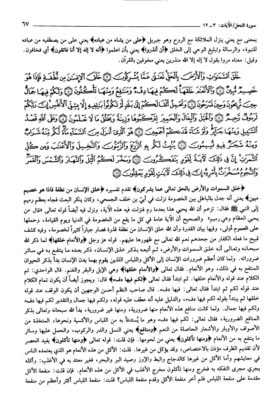 خَلَقَ السَّماواتِ وَالْأَرْضَ بِالْحَقِّ تَعالى عَمَّا يُشْرِكُونَ (3) خَلَقَ الْإِنْسانَ مِنْ نُطْفَةٍ فَإِذا هُوَ خَصِيمٌ مُبِينٌ (4) وَالْأَنْعامَ خَلَقَها لَكُمْ فِيها دِفْءٌ وَمَنافِعُ وَمِنْها تَأْكُلُونَ (5) وَلَكُمْ فِيها جَمالٌ حِينَ تُرِيحُونَ وَحِينَ تَسْرَحُونَ (6) وَتَحْمِلُ أَثْقالَكُمْ إِلى بَلَدٍ لَمْ تَكُونُوا بالِغِيهِ إِلاَّ بِشِقِّ الْأَنْفُسِ إِنَّ رَبَّكُمْ لَرَؤُفٌ رَحِيمٌ (7)