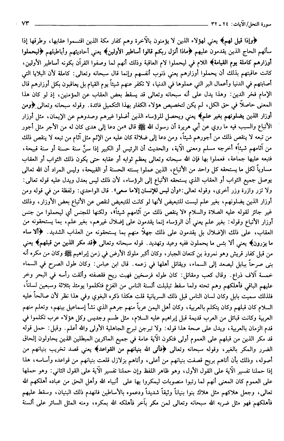 ولا تزر وازرة وزر أخرى، وقوله تعالى: «وأن ليس للإنسان إلا ما سعى». قال الواحدي: ولفظة من في قوله ومن أوزار الذين يضلونهم، بغير علم ليست للتبعيض لأنها لو كانت للتبعيض لنقص عن الأتباع بعض الأوزار، وذلك غير جائز لقوله عليه الصلاة والسلام «لا ينقص ذلك من آثامهم شيئا»، ولكنها للجنس أي ليحملوا من جنس أوزار الأتباع وقوله: بغير علم يعني أن الرؤساء إنما يقدمون على إضلال غيرهم، بغير علم، بما يستحقونه من العقاب، على ذلك الإضلال بل يقدمون على ذلك جهلا منهم بما يستحقونه من العذاب الشديد. أَلا ساءَ ما يَزِرُونَ يعني ألا بئس ما يحملون ففيه وعيد وتهديد. قوله سبحانه وتعالى قَدْ مَكَرَ الَّذِينَ مِنْ قَبْلِهِمْ يعني من قبل كفار قريش وهو نمروذ بن كنعان الجبار، وكان أكبر ملوك الأرض في زمن إبراهيم صلّى الله عليه وسلّم وكان من مكره أنه بنى صرحا ببابل ليصعد إلى السماء، ويقاتل أهلها في زعمه. قال ابن عباس: وكان طول الصرح في السماء خمسة آلاف ذراع. وقال كعب ومقاتل: كان طوله فرسخين فهبت ريح فقصفته وألقت رأسه في البحر وخر عليهم الباقي فأهلكهم وهم تحته ولما سقط تبلبلت ألسنة الناس من الفزع فتكلموا يومئذ بثلاثة وسبعين لسانا، فلذلك سميت بابل وكان لسان الناس قبل ذلك السريانية قلت هكذا ذكره البغوي وفي هذا نظر لأن صالحا عليه السلام كان قبلهم وكان يتكلم بالعربية، وكان أهل اليمن عربا منهم جرهم الذي نشأ إسماعيل بينهم، وتعلم منهم العربية وكانت قبائل من العرب قديمة قبل إبراهيم عليه السلام، مثل طسم وجديس وكل هؤلاء عرب تكلموا في قدم الزمان بالعربية، ويدل على صحة هذا قوله: ولا تبرجن تبرج الجاهلية الأولى والله أعلم. وقيل: حمل قوله قد مكر الذين من قبلهم على العموم أولى فتكون الآية عامة في جميع الماكرين المبطلين الذين يحاولون إلحاق الضرر والمكر بالغير، وقوله سبحانه وتعالى فَأَتَى اللَّهُ بُنْيانَهُمْ مِنَ الْقَواعِدِ يعني قصد تخريب بنيانهم من أصوله، وذلك بأن أتاهم بريح قصفت بنيانهم من أعلى، وأتاهم بزلازل قلعت بنيانهم من قواعده وأساسه، هذا إذا حملنا تفسير الآية على القول الأول، وهو ظاهر اللفظ وإن حملنا تفسير الآية على القول الثاني: وهو حملها على العموم كان المعنى أنهم لما رتبوا منصوبات ليمكروا بها على أنبياء الله وأهل الحق من عباده أهلكهم الله تعالى، وجعل هلاكهم مثل هلاك بنوا بنيانا وثيقا شديدا ودعموه بالأساطين فانهدم ذلك البنيان، وسقط عليهم فأهلكهم فهو مثل ضربه الله سبحانه وتعالى لمن مكر بآخر فأهلكه الله بمكره، ومنه المثل السائر على ألسنة