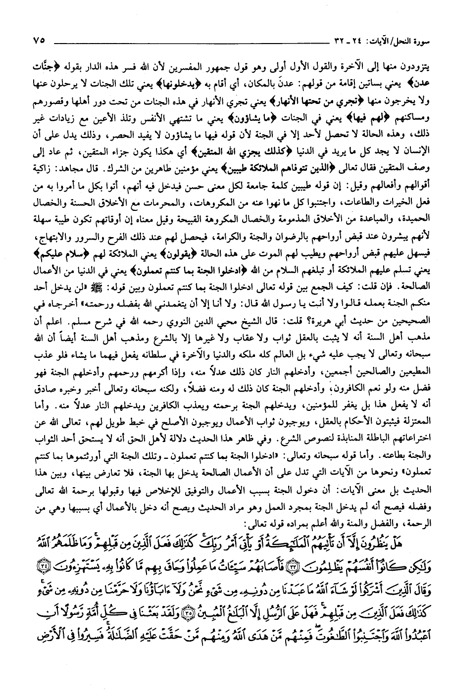 يتزودون منها إلى الآخرة والقول الأول أولى وهو قول جمهور المفسرين لأن الله فسر هذه الدار بقوله جَنَّاتُ عَدْنٍ يعني بساتين إقامة من قولهم: عدن بالمكان، أي أقام به يَدْخُلُونَها يعني تلك الجنات لا يرحلون عنها ولا يخرجون منها تَجْرِي مِنْ تَحْتِهَا الْأَنْهارُ يعني تجري الأنهار في هذه الجنات من تحت دور أهلها وقصورهم ومساكنهم لَهُمْ فِيها يعني في الجنات ما يَشاؤُنَ يعني ما تشتهي الأنفس وتلذ الأعين مع زيادات غير ذلك، وهذه الحالة لا تحصل لأحد إلا في الجنة لأن قوله فيها ما يشاءون لا يفيد الحصر، وذلك يدل على أن الإنسان لا يجد كل ما يريد في الدنيا كَذلِكَ يَجْزِي اللَّهُ الْمُتَّقِينَ أي هكذا يكون جزاء المتقين، ثم عاد إلى وصف المتقين فقال تعالى الَّذِينَ تَتَوَفَّاهُمُ الْمَلائِكَةُ طَيِّبِينَ يعني مؤمنين طاهرين من الشرك. قال مجاهد: زاكية أقوالهم وأفعالهم وقيل: إن قوله طيبين كلمة جامعة لكل معنى حسن فيدخل فيه أنهم، أتوا بكل ما أمروا به من فعل الخيرات والطاعات، واجتنبوا كل ما نهوا عنه من المكروهات، والمحرمات مع الأخلاق الحسنة والخصال الحميدة، والمباعدة من الأخلاق المذمومة والخصال المكروهة القبيحة وقيل معناه إن أوقاتهم تكون طيبة سهلة لأنهم يبشرون عند قبض أرواحهم بالرضوان والجنة والكرامة، فيحصل لهم عند ذلك الفرح والسرور والابتهاج، فيسهل عليهم قبض أرواحهم ويطيب لهم الموت على هذه الحالة يَقُولُونَ يعني الملائكة لهم سَلامٌ عَلَيْكُمْ يعني تسلم عليهم الملائكة أو تبلغهم السلام من الله ادْخُلُوا الْجَنَّةَ بِما كُنْتُمْ تَعْمَلُونَ يعني في الدنيا من الأعمال الصالحة. فإن قلت