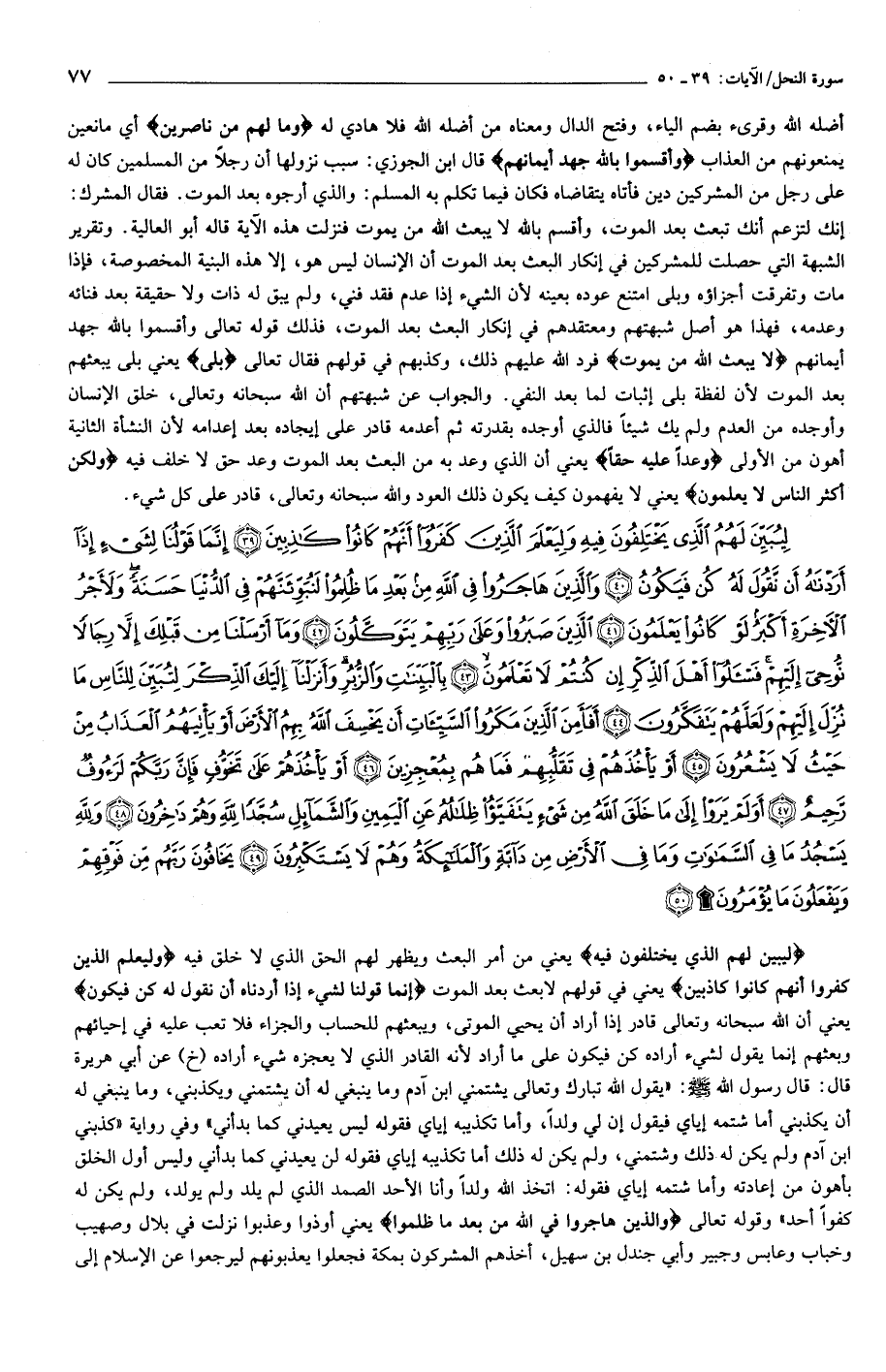 لِيُبَيِّنَ لَهُمُ الَّذِي يَخْتَلِفُونَ فِيهِ وَلِيَعْلَمَ الَّذِينَ كَفَرُوا أَنَّهُمْ كانُوا كاذِبِينَ (39) إِنَّما قَوْلُنا لِشَيْءٍ إِذا أَرَدْناهُ أَنْ نَقُولَ لَهُ كُنْ فَيَكُونُ (40) وَالَّذِينَ هاجَرُوا فِي اللَّهِ مِنْ بَعْدِ ما ظُلِمُوا لَنُبَوِّئَنَّهُمْ فِي الدُّنْيا حَسَنَةً وَلَأَجْرُ الْآخِرَةِ أَكْبَرُ لَوْ كانُوا يَعْلَمُونَ (41) الَّذِينَ صَبَرُوا وَعَلى رَبِّهِمْ يَتَوَكَّلُونَ (42) وَما أَرْسَلْنا مِنْ قَبْلِكَ إِلاَّ رِجالاً نُوحِي إِلَيْهِمْ فَسْئَلُوا أَهْلَ الذِّكْرِ إِنْ كُنْتُمْ لا تَعْلَمُونَ (43)