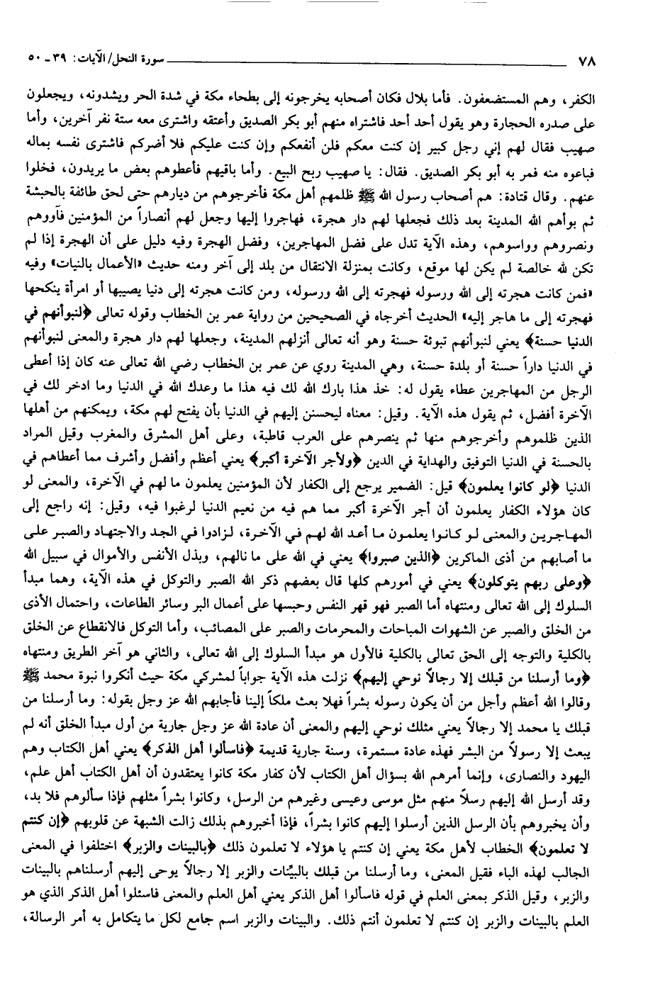 الكفر، وهم المستضعفون. فأما بلال فكان أصحابه يخرجونه إلى بطحاء مكة في شدة الحر ويشدونه، ويجعلون على صدره الحجارة وهو يقول أحد أحد فاشتراه منهم أبو بكر الصديق وأعتقه واشترى معه ستة نفر آخرين، وأما صهيب فقال لهم إني رجل كبير إن كنت معكم فلن أنفعكم وإن كنت عليكم فلا أضركم فاشترى نفسه بماله فباعوه منه فمر به أبو بكر الصديق. فقال: يا صهيب ربح البيع. وأما باقيهم فأعطوهم بعض ما يريدون، فخلوا عنهم. وقال قتادة: هم أصحاب رسول الله صلّى الله عليه وسلّم ظلمهم أهل مكة فأخرجوهم من ديارهم حتى لحق طائفة بالحبشة ثم بوأهم الله المدينة بعد ذلك فجعلها لهم دار هجرة، فهاجروا إليها وجعل لهم أنصارا من المؤمنين فآووهم ونصروهم وواسوهم، وهذه الآية تدل على فضل المهاجرين، وفضل الهجرة وفيه دليل على أن الهجرة إذا لم تكن لله خالصة لم يكن لها موقع، وكانت بمنزلة الانتقال من بلد إلى آخر ومنه حديث «الأعمال بالنيات» وفيه «فمن كانت هجرته إلى الله ورسوله فهجرته إلى الله ورسوله، ومن كانت هجرته إلى دنيا يصيبها أو امرأة ينكحها فهجرته إلى ما هاجر إليه» الحديث أخرجاه في الصحيحين من رواية عمر بن الخطاب وقوله تعالى لَنُبَوِّئَنَّهُمْ فِي الدُّنْيا حَسَنَةً يعني لنبوأنهم تبوئة حسنة وهو أنه تعالى أنزلهم المدينة، وجعلها لهم دار هجرة والمعنى لنبوأنهم في الدنيا دارا حسنة أو بلدة حسنة، وهي المدينة روي عن عمر بن الخطاب رضي الله تعالى عنه كان إذا أعطى الرجل من المهاجرين عطاء يقول له: خذ هذا بارك الله لك فيه هذا ما وعدك الله في الدنيا وما ادخر لك في الآخرة أفضل، ثم يقول هذه الآية. وقيل: معناه ليحسنن إليهم في الدنيا بأن يفتح لهم مكة، ويمكنهم من أهلها الذين ظلموهم وأخرجوهم منها ثم ينصرهم على العرب قاطبة، وعلى أهل المشرق والمغرب وقيل المراد بالحسنة في الدنيا التوفيق والهداية في الدين وَلَأَجْرُ الْآخِرَةِ أَكْبَرُ يعني أعظم وأفضل وأشرف مما أعطاهم في الدنيا لَوْ كانُوا يَعْلَمُونَ قيل: الضمير يرجع إلى الكفار لأن المؤمنين يعلمون ما لهم في الآخرة، والمعنى لو كان هؤلاء الكفار يعلمون أن أجر الآخرة أكبر مما هم فيه من نعيم الدنيا لرغبوا فيه، وقيل: إنه راجع إلى المهاجرين والمعنى لو كانوا يعلمون ما أعد الله لهم في الآخرة، لزادوا في الجد والاجتهاد والصبر على ما أصابهم من أذى الماكرين الَّذِينَ صَبَرُوا يعني في الله على ما نالهم، وبذل الأنفس والأموال في سبيل الله وَعَلى رَبِّهِمْ يَتَوَكَّلُونَ يعني في أمورهم كلها قال بعضهم ذكر الله الصبر والتوكل في هذه الآية، وهما مبدأ السلوك إلى الله تعالى ومنتهاه أما الصبر فهو قهر النفس وحبسها على أعمال البر وسائر الطاعات، واحتمال الأذى من الخلق والصبر عن الشهوات المباحات والمحرمات والصبر
