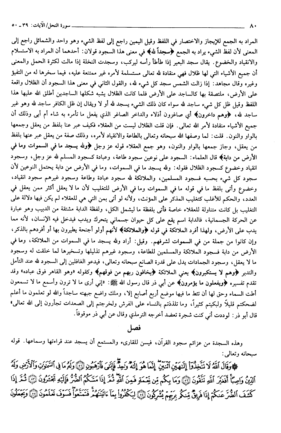 المراد به الجمع للإيجاز والاختصار في اللفظ وقيل اليمين راجع إلى لفظ الشيء وهو واحد والشمائل راجع إلى المعنى لأن لفظ الشيء يراد به الجمع سُجَّداً لِلَّهِ في معنى هذا السجود قولان: أحدهما أن المراد به الاستسلام والانقياد والخضوع. يقال سجد البعير إذا طأطأ رأسه ليركب، وسجدت النخلة إذا مالت لكثرة الحمل والمعنى أن جميع الأشياء التي لها ظلال فهي منقادة لله تعالى مستسلمة لأمره غير ممتنعة عليه، فيما سخرها له من التفيؤ وغيره وقال مجاهد: إذا زالت الشمس سجد كل شيء لله، والقول الثاني في معنى هذا السجود أن الظلال واقعة على الأرض، ملتصقة بها كالساجد على الأرض فلما كانت الظلال يشبه شكلها الساجدين أطلق الله عليها هذا اللفظ وقيل ظل كل شيء ساجد لله سواء كان ذلك الشيء يسجد لله أو لا ويقال إن ظل الكافر ساجد لله وهو غير ساجد لله، وَهُمْ داخِرُونَ أي صاغرون أذلاء والداخر الصاغر الذي يفعل ما تأمره به شاء أم أبى وذلك أن جميع الأشياء منقادة لأمر الله تعالى. فإن قلت الظلال ليست من العقلاء فكيف عبر عنا بلفظ من يعقل وجمعها بالواو والنون. قلت: لما وصفها الله سبحانه وتعالى بالطاعة والانقياد لأمره، وذلك صفة من يعقل عبر عنها بلفظ من يعقل، وجاز جمعها بالواو والنون، وهو جمع العقلاء قوله عز وجل وَلِلَّهِ يَسْجُدُ ما فِي السَّماواتِ وَما فِي الْأَرْضِ مِنْ دابَّةٍ قال العلماء: السجود على نوعين سجود طاعة، وعبادة كسجود المسلم لله عز وجل، وسجود انقياد وخضوع كسجود الظلال فقوله: ولله يسجد ما في السموات، وما في الأرض من دابة يحتمل النوعين لأن سجود كل شيء بحسبه فسجود المسلمين، والملائكة لله سجود عبادة وطاعة وسجود غيرهم سجود انقياد، وخضوع وأتى بلفظ ما في قوله ما في السموات وما في الأرض للتغليب لأن ما لا يعقل أكثر ممن يعقل في العدد، والحكم للأغلب كتغليب المذكر على المؤنث، ولأنه لو أتى بمن التي هي للعقلاء لم يكن فيها دلالة على التغليب بل كانت متناولة للعقلاء خاصة فأتى بلفظة ما ليشمل الكل، ولفظة الدابة مشتقة من الدبيب وهو عبارة عن الحركة الجسمانية، فالدابة اسم يقع على كل حيوان جسماني يتحرك ويدب فيدخل فيه الإنسان، لأنه مما يدب على الأرض، ولهذا أفرد الملائكة في قوله وَالْمَلائِكَةُ لأنهم أولو أجنحة يطيرون بها أو أفردهم بالذكر، وإن كانوا من جملة من في السموات لشرفهم. وقيل: أراد ولله يسجد ما في السموات