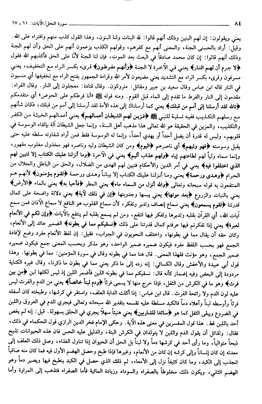 مقدمون إلى النار والفرط ما تقدم إلى الماء قبل القوم. ومنه قوله صلّى الله عليه وسلّم «أنا فرطكم على الحوض» أي متقدمكم تَاللَّهِ لَقَدْ أَرْسَلْنا إِلى أُمَمٍ مِنْ قَبْلِكَ يعني كما أرسلناك إلى هذه الأمة لقد أرسلنا إلى أمم من قبلك، فكان شأنهم مع رسلهم التكذيب ففيه تسلية للنبي صلّى الله عليه وسلّم فَزَيَّنَ لَهُمُ الشَّيْطانُ أَعْمالَهُمْ يعني أعمالهم الخبيثة من الكفر والتكذيب، والمزين في الحقيقة هو الله تعالى هذا مذهب أهل السنة، وإنما جعل الشيطان آلة بإلقاء الوسوسة في قلوبهم، وليس له قدرة أن يضل أحدا أو يهدي أحدا، وإنما له الوسوسة فقط فمن أراد شقاوته سلطه عليه حتى يقبل وسوسته فَهُوَ وَلِيُّهُمُ أي ناصرهم الْيَوْمَ ومن كان الشيطان وليه وناصره فهو مخذول مغلوب مقهور، وإنما سماه وليا لهم لطاعتهم إياه وَلَهُمْ عَذابٌ أَلِيمٌ يعني في الآخرة وَما أَنْزَلْنا عَلَيْكَ الْكِتابَ إِلَّا لِتُبَيِّنَ لَهُمُ الَّذِي اخْتَلَفُوا فِيهِ يعني في أمر الدين والأحكام فتبين لهم الهدى من الضلال، والحق من الباطل والحلال من الحرام وَهُدىً وَرَحْمَةً يعني وما أنزلنا عليك الكتاب إلا بيانا وهدى ورحمة لِقَوْمٍ يُؤْمِنُونَ لأنهم هم المنتفعون به قوله سبحانه وتعالى وَاللَّهُ أَنْزَلَ مِنَ السَّماءِ ماءً يعني المطر فَأَحْيا بِهِ يعني بالماء الْأَرْضَ يعني بالنبات والزروع بَعْدَ مَوْتِها يعني يبسها وجدوبتها إِنَّ فِي ذلِكَ لَآيَةً يعني دلالة واضحة على كمال قدرتنا لِقَوْمٍ يَسْمَعُونَ يعني سماع إنصاف وتدبر وتفكر، لأن سماع القلوب هو النافع لا سماع الآذان فمن سمع آيات الله، أي القرآن بقلبه وتدبرها وتفكر فيها انتفع، ومن لم يسمع بقلبه لم ينتفع بالآيات وَإِنَّ لَكُمْ فِي الْأَنْعامِ لَعِبْرَةً يعني إذا تفكرتم فيها عرفتم كمال قدرتنا على ذلك نُسْقِيكُمْ مِمَّا فِي بُطُونِهِ الضمير عائد إلى الأنعام، وكان حقه أن يقال مما في بطونها، واختلف النحويون في الجواب، فقيل: إن لفظ الأنعام مفرد وضع لإفادة الجمع فهو بحسب اللفظ مفرد فيكون ضميره ضمير الواحد، وهو مذكر وبحسب المعنى جمع فيكون ضميره ضمير الجمع، وهو مؤنث فلهذا المعنى. قال هنا مما في بطونه وقال في سورة المؤمنين: مما في بطونها. وهذا قول أبي عبيدة والأخفش وقال الكسائي: إنه رده إلى ما ذكر يعني مما في بطون ما ذكرنا، وقال غيره الكناية مردودة إلى البعض وفيه إضمار كأنه قال: نسقيكم مما في بطونه اللبن فأضمر اللبن إذ ليس لكلها لبن مِنْ بَيْنِ فَرْثٍ وهو ما في الكرش من الثفل، فإذا خرج منها لا يسمى فرثا وَدَمٍ لَبَناً خالِصاً يعني من الدم والفرث ليس عليه لون الدم ولا رائحة الفرث. قال ابن عباس: إذا أكلت الدابة العلف، واستقر في كرشها، وطبخته كان أسفله فرثا وأوسطه لبنا وأعلاه دما فالكبد مسلطة عليه تقسمه بتقدير الله سبحانه وتعالى فيجري الدم في العروق واللبن في الضروع ويبقى الثفل كما هو سائِغاً لِلشَّارِبِينَ يعني هنيئا سهلا يجري في الحلق بسهولة. قيل: إنه لم يغص أحد باللبن قط. هذا قول المفسرين في معنى هذه الآية. وحكى الإمام فخر الدين الرازي قول الحكماء في ذلك، فقال: ولقائل أن يقول الدم واللبن لا يتولدان في الكرش البتة، والدليل على الحس فان هذه الحيوانات تذبح ذبحا متواليا، وما رأى أحد في كرشها دما ولا لبنا بل الحق أن الحيوان إذا تناول الغذاء، وصل ذلك العلف إلى معدته إن كان إنسانا وإلى كرشه إن كان من الأنعام، وغيرها فإذا طبخ وحصل الهضم الأول فيه فما كان منه صافيا انجذب إلى الكبد، وما كان كثيفا نزل إلى الأمعاء، ثم ذلك الذي حصل في الكبد ينطبخ فيها ويصير دما وهو الهضم الثاني، ويكون ذلك مخلوطا بالصفراء والسوداء وزيادة المائية فأما الصفراء فتذهب إلى المرارة وأما