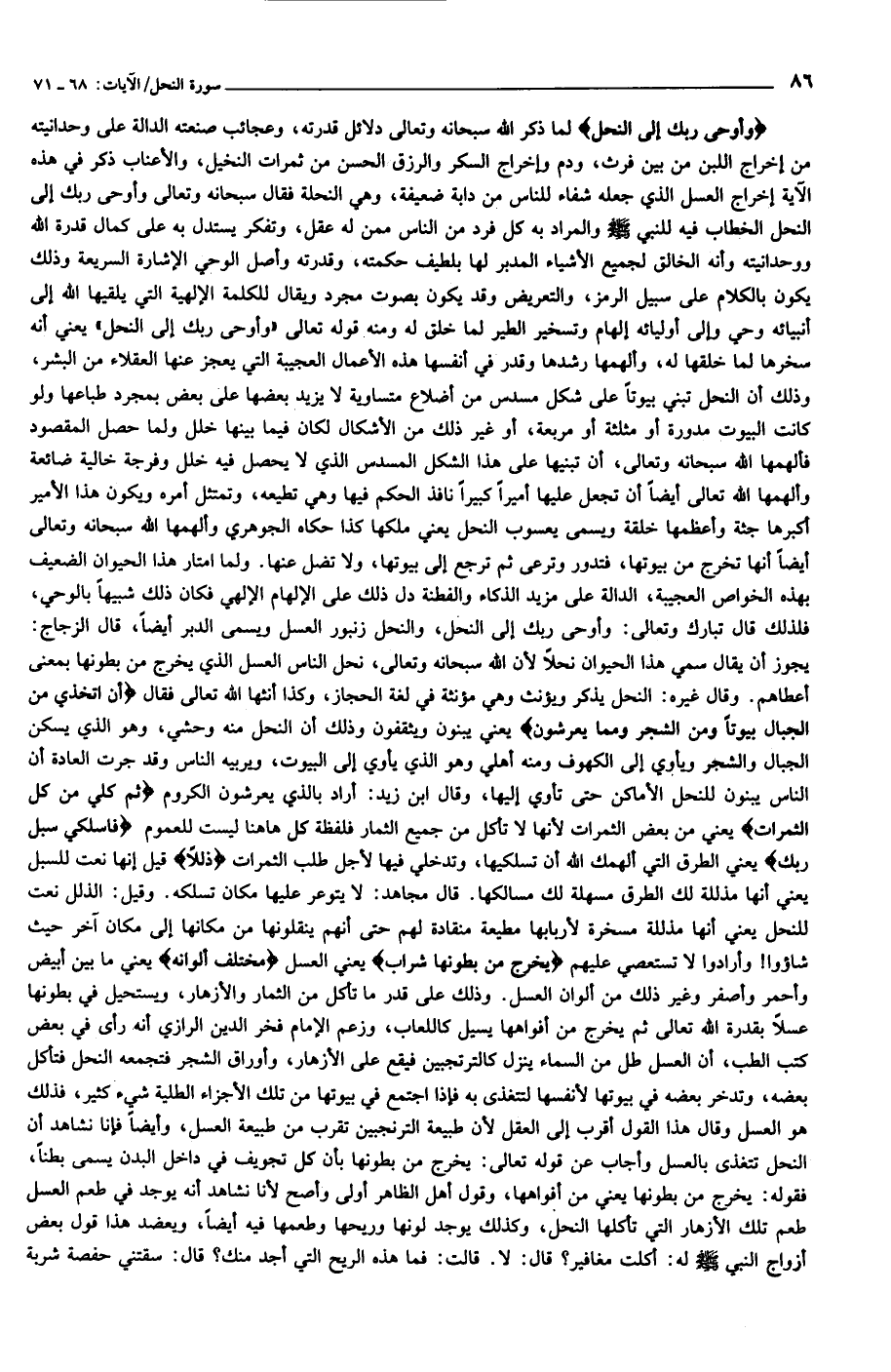 يجوز أن يقال سمي هذا الحيوان نحلا لأن الله سبحانه وتعالى، نحل الناس العسل الذي يخرج من بطونها بمعنى أعطاهم. وقال غيره: النحل يذكر ويؤنث وهي مؤنثة في لغة الحجاز، وكذا أنثها الله تعالى فقال أَنِ اتَّخِذِي مِنَ الْجِبالِ بُيُوتاً وَمِنَ الشَّجَرِ وَمِمَّا يَعْرِشُونَ يعني يبنون ويثقفون وذلك أن النحل منه وحشي، وهو الذي يسكن الجبال والشجر ويأوي إلى الكهوف ومنه أهلي وهو الذي يأوي إلى البيوت، ويربيه الناس وقد جرت العادة أن الناس يبنون للنحل الأماكن حتى تأوي إليها، وقال ابن زيد: أراد بالذي يعرشون الكروم ثُمَّ كُلِي مِنْ كُلِّ الثَّمَراتِ يعني من بعض الثمرات لأنها لا تأكل من جميع الثمار فلفظة كل هاهنا ليست للعموم فَاسْلُكِي سُبُلَ رَبِّكِ يعني الطرق التي ألهمك الله أن تسلكيها، وتدخلي فيها لأجل طلب الثمرات ذُلُلًا قيل إنها نعت للسبل يعني أنها مذللة لك الطرق مسهلة لك مسالكها. قال مجاهد: لا يتوعر عليها مكان تسلكه. وقيل: الذلل نعت للنحل يعني أنها مذللة مسخرة لأربابها مطيعة منقادة لهم حتى أنهم ينقلونها من مكانها إلى مكان آخر حيث شاؤوا! وأرادوا لا تستعصي عليهم يَخْرُجُ مِنْ بُطُونِها شَرابٌ يعني العسل مُخْتَلِفٌ أَلْوانُهُ يعني ما بين أبيض وأحمر وأصفر وغير ذلك من ألوان العسل. وذلك على قدر ما تأكل من الثمار والأزهار، ويستحيل في بطونها عسلا بقدرة الله تعالى ثم يخرج من أفواهها يسيل كاللعاب، وزعم الإمام فخر الدين الرازي أنه رأى في بعض كتب الطب، أن العسل طل من السماء ينزل كالترنجبين فيقع على الأزهار، وأوراق الشجر فتجمعه النحل فتأكل بعضه، وتدخر بعضه في بيوتها لأنفسها للتغذى به فإذا اجتمع في بيوتها من تلك الأجزاء الطلية شيء كثير، فذلك هو العسل وقال هذا القول أقرب إلى العقل لأن طبيعة الترنجبين تقرب من طبيعة العسل، وأيضا فإنا نشاهد أن النحل تتغذى بالعسل وأجاب عن قوله تعالى: يخرج من بطونها بأن كل تجويف في داخل البدن يسمى بطنا، فقوله: يخرج من بطونها يعني من أفواهها، وقول أهل الظاهر أولى وأصح لأنا نشاهد أنه يوجد في طعم العسل طعم تلك الأزهار التي تأكلها النحل، وكذلك يوجد لونها وريحها وطعمها فيه أيضا، ويعضد هذا قول بعض أزواج النبي صلّى الله عليه وسلّم له: أكلت مغافير؟ قال: لا. قالت: فما هذه الريح التي أجد منك؟ قال: سقتني حفصة شربة
