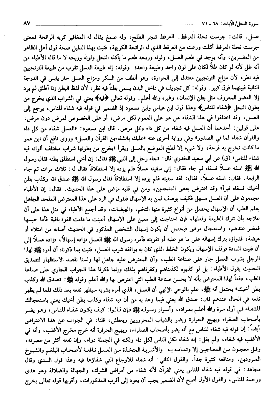 صلّى الله عليه وسلّم صدق الله وكذب بطن أخيك فسقاه فبرأ» وقد اعترض بعض الملحدين، ومن في قلبه مرض على هذا الحديث. فقال: إن الأطباء مجمعون على أن العسل مسهل فكيف يوصف لمن به الإسهال فنقول في الرد على هذا المعترض الملحد الجاهل بعلم الطب أن الإسهال يحصل من أنواع كثيرة منها التخم، والهيضات، وقد أجمع الأطباء في مثل هذا على أن علاجه بأن تترك الطبيعة وفعلها، فإن احتاجت إلى معين على الإسهال أعينت ما دامت القوة باقية فأما حبسها فمضر عندهم، واستعجال مرض فيحتمل أن يكون إسهال الشخص المذكور في الحديث أصابه من امتلاء أو هيضة، فدواؤه بترك إسهاله على ما هو عليه أو تقويته فأمره رسول الله صلّى الله عليه وسلّم العسل فزاده إسهالا، فزاده عسلا إلى أن فنيت المادة فوقف الإسهال ويكون الخلط الذي كان به يوافقه شرب العسل، فثبت بما ذكرناه أن أمره صلّى الله عليه وسلّم لهذا الرجل بشرب العسل جار على صناعة الطب، وأن المعترض عليه جاهل لها ولسنا نقصد الاستظهار لتصديق الحديث بقول الأطباء: بل لو كذبوه لكذبناهم وكفرناهم بذلك وإنما ذكرنا هذا الجواب الجاري على صناعة الطب، دفعا لهذا المعترض بأنه لا يحسن صناعة الطب التي اعترض بها والله أعلم وقوله صلّى الله عليه وسلّم: «صدق الله وكذب بطن أخيك» يحتمل أنه صلّى الله عليه وسلّم، علم بالوحي الإلهي أن العسل، الذي أمره بشربه سيظهر نفعه بعد ذلك فلما لم يظهر نفعه في الحال عندهم قال: صدق الله يعني فيما وعد به من أن فيه شفاء وكذب بطن أخيك يعني باستعجالك للشفاء في أول مرة والله أعلم بمراده، وأسرار رسوله صلّى الله عليه وسلّم فإن قالوا: كيف يكون شفاء للناس، وهو يضر بأصحاب الصفراء ويهيج الحرارة ويضر بالشباب المحرورين ويعطش، قلنا: في الجواب عن هذا الاعتراض أيضا: إن قوله فيه شفاء للناس مع أنه يضر بأصحاب الصفراء، ويهيج الحرارة أنه خرج مخرج الأغلب، وأنه في الأغلب فيه شفاء، ولم يقل: إنه شفاء لكل الناس لكل داء ولكنه في الجملة دواء، وإن نفعه أكثر من مضرته، وقل معجون من المعاجين إلا وتمامه به. والأشربة المتخذة من العسل نافعة لأصحاب البلغم والشيوخ المبرودين، ومنافعه كثيرة جدا. والقول الثاني: أنه شفاء للأوجاع التي شفاؤها فيه وهذا قول السدي وقال مجاهد: في قوله فيه شفاء للناس يعني القرآن لأنه شفاء من أمراض الشرك، والجهالة والضلالة وهو هدى ورحمة للناس، والقول الأول أصح لأن الضمير يجب أن يعود إلى أقرب المذكورات، وأقربها قوله تعالى يخرج