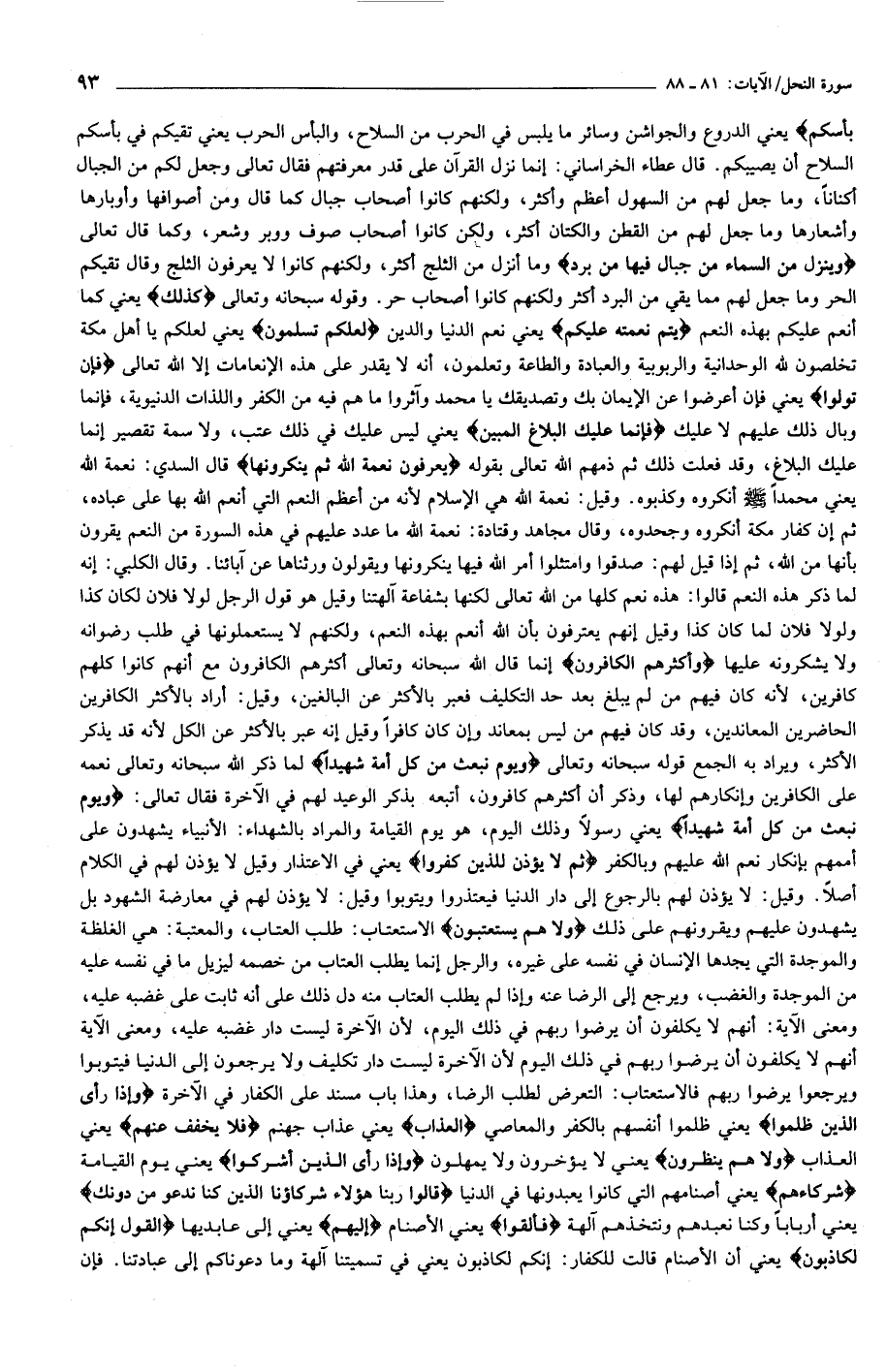 بَأْسَكُمْ يعني الدروع والجواشن وسائر ما يلبس في الحرب من السلاح، والبأس الحرب يعني تقيكم في بأسكم السلاح أن يصيبكم. قال عطاء الخراساني: إنما نزل القرآن على قدر معرفتهم فقال تعالى وجعل لكم من الجبال أكنانا، وما جعل لهم من السهول أعظم وأكثر، ولكنهم كانوا أصحاب جبال كما قال ومن أصوافها وأوبارها وأشعارها وما جعل لهم من القطن والكتان أكثر، ولكن كانوا أصحاب صوف ووبر وشعر، وكما قال تعالى وَيُنَزِّلُ مِنَ السَّماءِ مِنْ جِبالٍ فِيها مِنْ بَرَدٍ وما أنزل من الثلج أكثر، ولكنهم كانوا لا يعرفون الثلج وقال تقيكم الحر وما جعل لهم مما يقي من البرد أكثر ولكنهم كانوا أصحاب حر. وقوله سبحانه وتعالى كَذلِكَ يعني كما أنعم عليكم بهذه النعم يُتِمُّ نِعْمَتَهُ عَلَيْكُمْ يعني نعم الدنيا والدين لَعَلَّكُمْ تُسْلِمُونَ يعني لعلكم يا أهل مكة تخلصون لله الوحدانية والربوبية والعبادة والطاعة وتعلمون، أنه لا يقدر على هذه الإنعامات إلا الله تعالى فَإِنْ تَوَلَّوْا يعني فإن أعرضوا عن الإيمان بك وتصديقك يا محمد وآثروا ما هم فيه من الكفر واللذات الدنيوية، فإنما وبال ذلك عليهم لا عليك فَإِنَّما عَلَيْكَ الْبَلاغُ الْمُبِينُ يعني ليس عليك في ذلك عتب، ولا سمة تقصير إنما عليك البلاغ، وقد فعلت ذلك ثم ذمهم الله تعالى بقوله يَعْرِفُونَ نِعْمَتَ اللَّهِ ثُمَّ يُنْكِرُونَها قال السدي: نعمة الله يعني محمدا صلّى الله عليه وسلّم أنكروه وكذبوه. وقيل: نعمة الله هي الإسلام لأنه من أعظم النعم التي أنعم الله بها على عباده، ثم إن كفار مكة أنكروه وجحدوه، وقال مجاهد وقتادة: نعمة الله ما عدد عليهم في هذه السورة من النعم يقرون بأنها من الله، ثم إذا قيل لهم: صدقوا وامتثلوا أمر الله فيها ينكرونها ويقولون ورثناها عن آبائنا. وقال الكلبي: إنه لما ذكر هذه النعم قالوا: هذه نعم كلها من الله تعالى لكنها بشفاعة آلهتنا وقيل هو قول الرجل لولا فلان لكان كذا ولولا فلان لما كان كذا وقيل إنهم يعترفون بأن الله أنعم بهذه النعم، ولكنهم لا يستعملونها في طلب رضوانه ولا يشكرونه عليها وَأَكْثَرُهُمُ الْكافِرُونَ إنما قال الله سبحانه وتعالى أكثرهم الكافرون مع أنهم كانوا كلهم كافرين، لأنه كان فيهم من لم يبلغ بعد حد التكليف فعبر بالأكثر عن البالغين، وقيل: أراد بالأكثر الكافرين الحاضرين المعاندين، وقد كان فيهم من ليس بمعاند وإن كان كافرا وقيل إنه عبر بالأكثر عن الكل لأنه قد يذكر الأكثر، ويراد به الجمع قوله سبحانه وتعالى وَيَوْمَ نَبْعَثُ مِنْ كُلِّ أُمَّةٍ شَهِيداً