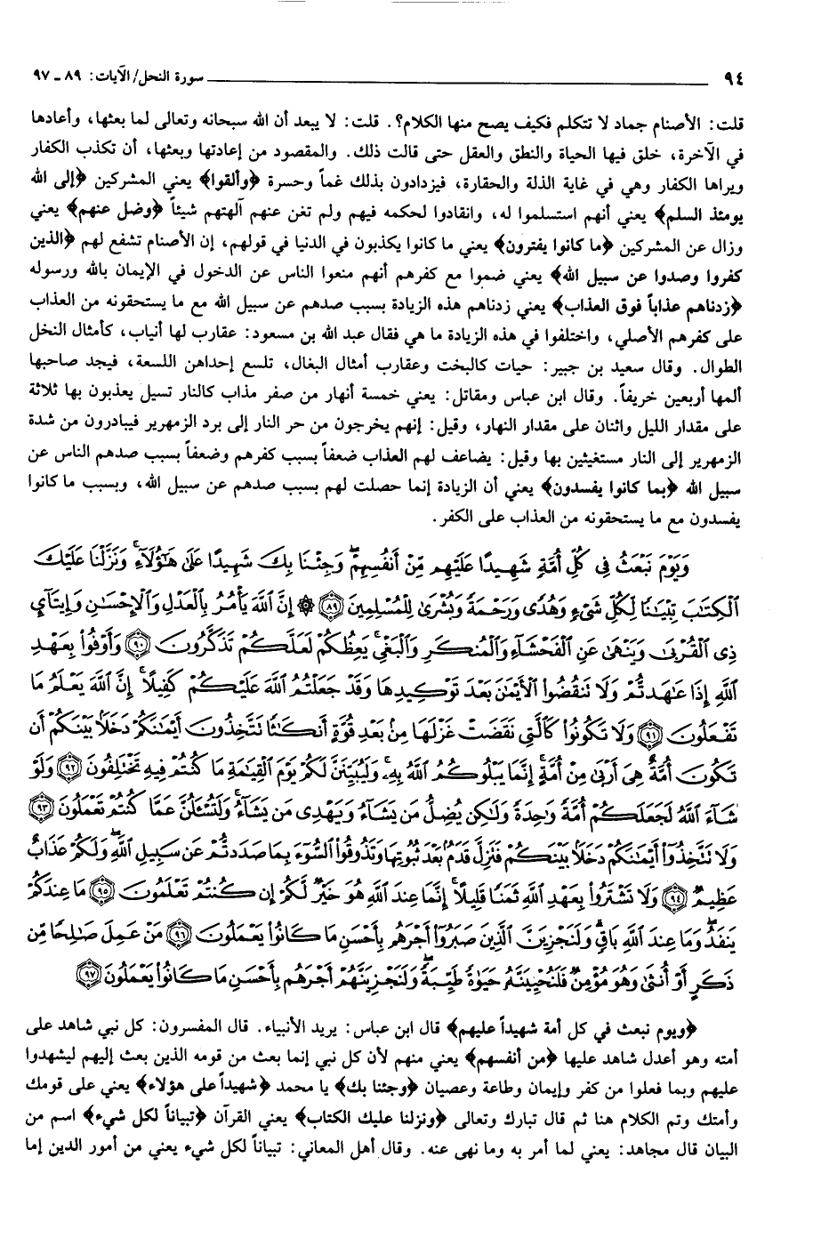 وَيَوْمَ نَبْعَثُ فِي كُلِّ أُمَّةٍ شَهِيداً عَلَيْهِمْ مِنْ أَنْفُسِهِمْ وَجِئْنا بِكَ شَهِيداً عَلى هؤُلاءِ وَنَزَّلْنا عَلَيْكَ الْكِتابَ تِبْياناً لِكُلِّ شَيْءٍ وَهُدىً وَرَحْمَةً وَبُشْرى لِلْمُسْلِمِينَ (89) إِنَّ اللَّهَ يَأْمُرُ بِالْعَدْلِ وَالْإِحْسانِ وَإِيتاءِ ذِي الْقُرْبى وَيَنْهى عَنِ الْفَحْشاءِ وَالْمُنْكَرِ وَالْبَغْيِ يَعِظُكُمْ لَعَلَّكُمْ تَذَكَّرُونَ (90) وَأَوْفُوا بِعَهْدِ اللَّهِ إِذا عاهَدْتُمْ وَلا تَنْقُضُوا الْأَيْمانَ بَعْدَ تَوْكِيدِها وَقَدْ جَعَلْتُمُ اللَّهَ عَلَيْكُمْ كَفِيلاً إِنَّ اللَّهَ يَعْلَمُ ما تَفْعَلُونَ (91) وَلا تَكُونُوا كَالَّتِي نَقَضَتْ غَزْلَها مِنْ بَعْدِ قُوَّةٍ أَنْكاثاً تَتَّخِذُونَ أَيْمانَكُمْ دَخَلاً بَيْنَكُمْ أَنْ تَكُونَ أُمَّةٌ هِيَ أَرْبى مِنْ أُمَّةٍ إِنَّما يَبْلُوكُمُ اللَّهُ بِهِ وَلَيُبَيِّنَنَّ لَكُمْ يَوْمَ الْقِيامَةِ ما كُنْتُمْ فِيهِ تَخْتَلِفُونَ (92) وَلَوْ شاءَ اللَّهُ لَجَعَلَكُمْ أُمَّةً واحِدَةً وَلكِنْ يُضِلُّ مَنْ يَشاءُ وَيَهْدِي مَنْ يَشاءُ وَلَتُسْئَلُنَّ عَمَّا كُنْتُمْ تَعْمَلُونَ (93)
