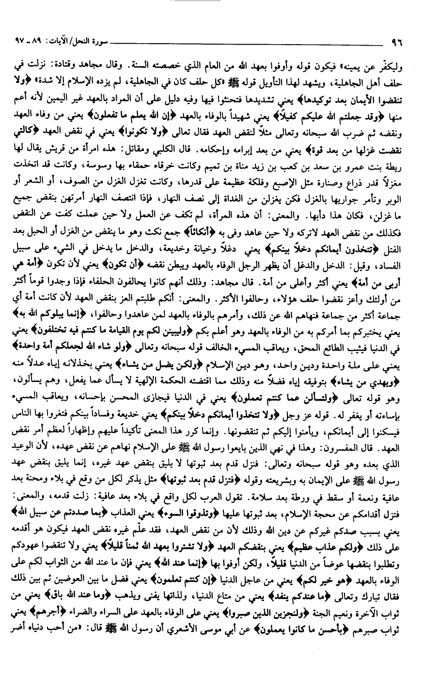 فتزل أقدامكم عن محجة الإسلام، بعد ثبوتها عليها وَتَذُوقُوا السُّوءَ يعني العذاب بِما صَدَدْتُمْ عَنْ سَبِيلِ اللَّهِ يعني بسبب صدكم غيركم عن دين الله وذلك لأن من نقض العهد، فقد علّم غيره نقض العهد فيكون هو أقدمه على ذلك وَلَكُمْ عَذابٌ عَظِيمٌ يعني بنقضكم العهد وَلا تَشْتَرُوا بِعَهْدِ اللَّهِ ثَمَناً قَلِيلًا يعني ولا تنقضوا عهودكم وتطلبوا بنقضها عوضا من الدنيا قليلا، ولكن أوفوا بها إِنَّما عِنْدَ اللَّهِ يعني فإن ما عند الله من الثواب لكم على الوفاء بالعهد هُوَ خَيْرٌ لَكُمْ يعني من عاجل الدنيا إِنْ كُنْتُمْ تَعْلَمُونَ يعني فضل ما بين العوضين ثم بين ذلك فقال تبارك وتعالى ما عِنْدَكُمْ يَنْفَدُ يعني من متاع الدنيا، ولذاتها يفنى ويذهب وَما عِنْدَ اللَّهِ باقٍ يعني من ثواب الآخرة ونعيم الجنة وَلَنَجْزِيَنَّ الَّذِينَ صَبَرُوا يعني على الوفاء بالعهد على السراء والضراء أَجْرَهُمْ يعني ثواب صبرهم بِأَحْسَنِ ما كانُوا يَعْمَلُونَ عن أبي موسى الأشعري أن رسول الله صلّى الله عليه وسلّم قال: «من أحب دنياه أضر
