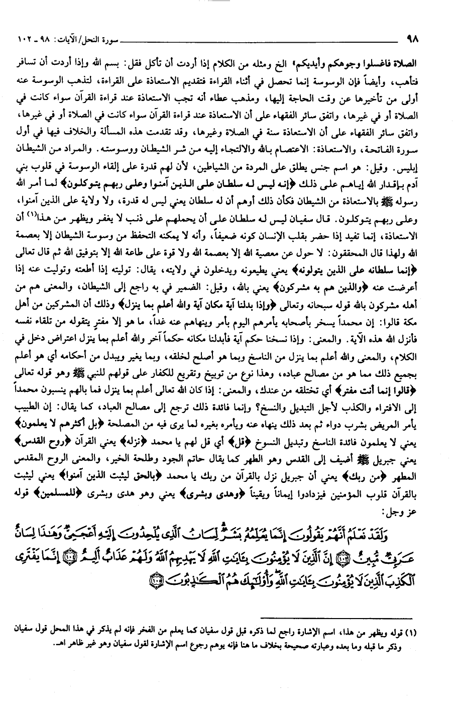 الصلاة فاغسلوا وجوهكم وأيديكم» إلخ ومثله من الكلام إذا أردت أن تأكل فقل: بسم الله وإذا أردت أن تسافر فتأهب، وأيضا فإن الوسوسة إنما تحصل في أثناء القراءة فتقديم الاستعاذة على القراءة، لتذهب الوسوسة عنه أولى من تأخيرها عن وقت الحاجة إليها، ومذهب عطاء أنه تجب الاستعاذة عند قراءة القرآن سواء كانت في الصلاة أو في غيرها، واتفق سائر الفقهاء على أن الاستعاذة عند قراءة القرآن سواء كانت في الصلاة أو في غيرها، واتفق سائر الفقهاء على أن الاستعاذة سنة في الصلاة وغيرها، وقد تقدمت هذه المسألة والخلاف فيها في أول سورة الفاتحة، والاستعاذة: الاعتصام بالله والالتجاء إليه من شر الشيطان ووسوسته. والمراد من الشيطان إبليس. وقيل: هو اسم جنس يطلق على المردة من الشياطين، لأن لهم قدرة على إلقاء الوسوسة في قلوب بني آدم بإقدار الله إياهم على ذلك إِنَّهُ لَيْسَ لَهُ سُلْطانٌ عَلَى الَّذِينَ آمَنُوا وَعَلى رَبِّهِمْ يَتَوَكَّلُونَ لما أمر الله رسوله صلّى الله عليه وسلّم بالاستعاذة من الشيطان فكأن ذلك أوهم أن له سلطان يعني ليس له قدرة، ولا ولاية على الذين آمنوا، وعلى ربهم يتوكلون. قال سفيان ليس له سلطان على أن يحملهم على ذنب لا يغفر ويظهر من هذا «1» أن الاستعاذة، إنما تفيد إذا حضر بقلب الإنسان كونه ضعيفا، وأنه لا يمكنه التحفظ من وسوسة الشيطان إلا بعصمة الله ولهذا قال المحققون: لا حول عن معصية الله إلا بعصمة الله ولا قوة على طاعة الله إلا بتوفيق الله ثم قال تعالى إِنَّما سُلْطانُهُ عَلَى الَّذِينَ يَتَوَلَّوْنَهُ يعني يطيعونه ويدخلون في ولايته، يقال: توليته إذا أطعته وتوليت عنه إذا أعرضت عنه وَالَّذِينَ هُمْ بِهِ مُشْرِكُونَ يعني بالله، وقيل: الضمير في به راجع إلى الشيطان، والمعنى هم من أهله مشركون بالله قوله سبحانه وتعالى وَإِذا بَدَّلْنا آيَةً مَكانَ آيَةٍ وَاللَّهُ أَعْلَمُ بِما يُنَزِّلُ وذلك أن المشركين من أهل مكة قالوا: إن محمدا يسخر بأصحابه يأمرهم اليوم بأمر وينهاهم عنه غدا، ما هو إلا مفتر يتقوله من تلقاء نفسه فأنزل الله هذه الآية. والمعنى: وإذا نسخنا حكم آية فأبدلنا مكانه حكما آخر والله أعلم بما ينزل اعتراض دخل في الكلام، والمعنى والله أعلم بما ينزل من الناسخ وبما هو أصلح لخلقه، وبما يغير ويبدل من أحكامه أي هو أعلم بجميع ذلك مما هو من مصالح عباده، وهذا نوع من توبيخ وتقريع للكفار على قولهم للنبي صلّى الله عليه وسلّم وهو قوله تعالى قالُوا إِنَّما أَنْتَ مُفْتَرٍ أي تختلقه من عندك، والمعنى: إذا كان الله تعالى أعلم بما ينزل فما بالهم ينسبون محمدا إلى الافتراء والكذب لأجل التبديل والنسخ؟