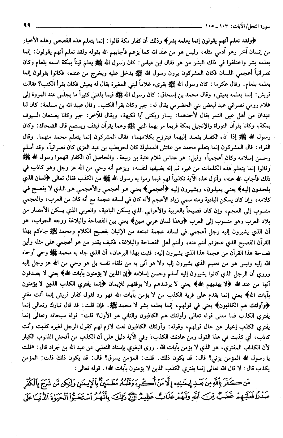 وَلَقَدْ نَعْلَمُ أَنَّهُمْ يَقُولُونَ إِنَّما يُعَلِّمُهُ بَشَرٌ وذلك أن كفار مكة قالوا: إنما يتعلم هذه القصص وهذه الأخبار من إنسان آخر وهو آدمي مثله، وليس هو من عند الله كما يزعم فأجابهم الله بقوله ولقد نعلم أنهم يقولون: إنما يعلمه بشر واختلفوا في ذلك البشر من هو فقال ابن عباس: كان رسول الله صلّى الله عليه وسلّم يعلم قينا بمكة اسمه بلعام وكان نصرانيا أعجمي اللسان فكان المشركون يرون رسول الله صلّى الله عليه وسلّم يدخل عليه ويخرج من عنده، فكانوا يقولون إنما يعلمه بلعام. وقال عكرمة: كان رسول الله صلّى الله عليه وسلّم يقرئ غلاما لبني المغيرة يقال له يعيش فكان يقرأ الكتب؟ فقالت قريش: إنما يعلمه يعيش، وقال محمد بن إسحاق: كان رسول الله صلّى الله عليه وسلّم فيما بلغني كثيرا ما يجلس عند المروة إلى غلام رومي نصراني عبد لبعض بني الحضرمي يقال له: جبر وكان يقرأ الكتب. وقال عبيد الله بن مسلمة: كان لنا عبدان من أهل عين التمر يقال لأحدهما: يسار ويكنى أبا فكيهة، ويقال للآخر: جبر وكانا يصنعان السيوف بمكة، وكانا يقرآن التوراة والإنجيل بمكة فربما مر بهما النبي صلّى الله عليه وسلّم وهما يقرآن فيقف ويستمع قال الضحاك: وكان رسول الله صلّى الله عليه وسلّم إذا آذاه الكفار يقعد إليهما فيتروح بكلامهما، فقال المشركون إنما يتعلم محمد منهما. وقال الفراء: قال المشركون إنما يتعلم محمد من عائش المملوك كان لحويطب بن عبد العزى كان نصرانيا، وقد أسلم وحسن إسلامه وكان أعجميا، وقيل: هو عداس غلام عتبة بن ربيعة. والحاصل أن الكفار اتهموا رسول الله صلّى الله عليه وسلّم وقالوا إنما يتعلم هذه الكلمات من غيره ثم إنه يضيفها لنفسه، ويزعم أنه وحي من الله عز وجل وهو كاذب في ذلك فأجاب الله عنه، وأنزل هذه الآية تكذيبا لهم فيما رموا به رسول الله صلّى الله عليه وسلّم من الكذب فقال تعالى لِسانُ الَّذِي يُلْحِدُونَ إِلَيْهِ يعني يميلون، ويشيرون إليه أَعْجَمِيٌّ يعني هو أعجمي والأعجمي هو الذي لا يفصح في كلامه، وإن كان يسكن البادية ومنه سمي زياد الأعجم لأنه كان في لسانه عجمة مع أنه كان من العرب، والعجمي منسوب إلى العجم، وإن كان فصيحا بالعربية والأعرابي الذي يسكن البادية، والعربي الذي يسكن الأمصار من بلاد العرب وهو منسوب إلى العرب وَهذا لِسانٌ عَرَبِيٌّ مُبِينٌ يعني بين الفصاحة والبلاغة ووجه الجواب، هو أن الذي يشيرون إليه رجل أعجمي في لسانه عجمة تمنعه من الإتيان بفصيح الكلام ومحمد صلّى الله عليه وسلّم جاءكم بهذا القرآن الفصيح الذي عجزتم أنتم عنه، وأنتم أهل الفصاحة والبلاغة، فكيف يقدر من هو أعجمي على مثله وأين فصاحة هذا القرآن من عجمة هذا الذي يشيرون إليه، فثبت بهذا البرهان، أن الذي جاء به محمد صلّى الله عليه وسلّم وحي أوحاه الله إليه وليس هو من تعليم الذي يشيرون إليه ولا هو أتى به من تلقاء نفسه بل هو وحي من الله عز وجل إليه وروي أن الرجل الذي كانوا يشيرون إليه أسلم وحسن إسلامه إِنَّ الَّذِينَ لا يُؤْمِنُونَ بِآياتِ اللَّهِ يعني لا يصدقون أنها من عند الله لا يَهْدِيهِمُ اللَّهُ يعني لا يرشدهم ولا يوفقهم للإيمان إِنَّما يَفْتَرِي الْكَذِبَ الَّذِينَ لا يُؤْمِنُونَ بِآياتِ اللَّهِ