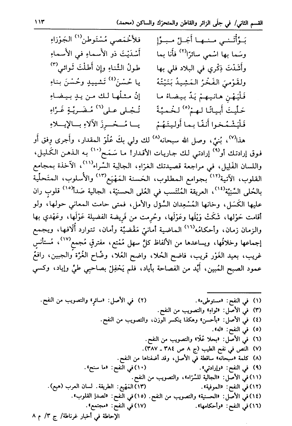 إرادتي لك جاريات الأقدار! ما سمح «10» به الذهن الكليل، واللسان الفليل، في مراجعة قصيدتك الغرّاء، الجالية السّراء «11» ، الآخذة بمجامع القلوب، الآتية «12» بجوامع المطلوب، الحسنة المهيع «13» والأسلوب، المتحلّية بالحلى السّنيّة «14» ، العريقة المنتسب في العلى الحسنيّة، الجالية صدأ «15» قلوب ران عليها الكسل، وخانها المسعدان السّؤل والأمل، فمتى حامت المعاني حولها، ولو أقامت حولها، شكت ويلها وعولها، وحرمت من فريضة الفضيلة عولها، وعهدي بها والزمان زمان، وأحكامه «16» الماضية أمانيّ مقضيّة وأمان، تتوارد ألّافها، ويجمع إجماعها وخلافها، ويساعدها من الألفاظ كلّ سهل ممتع، مفترق مجمع «17» ، مستأنس غريب، بعيد الغور قريب، فاضح الحلا، واضح العلا، وضّاح الغرّة والجبين، رافع عمود الصبح المبين، أيّد من الفصاحة بأياد، فلم يحفل بصاحبي طيّ وإياد، وكسي
